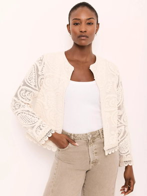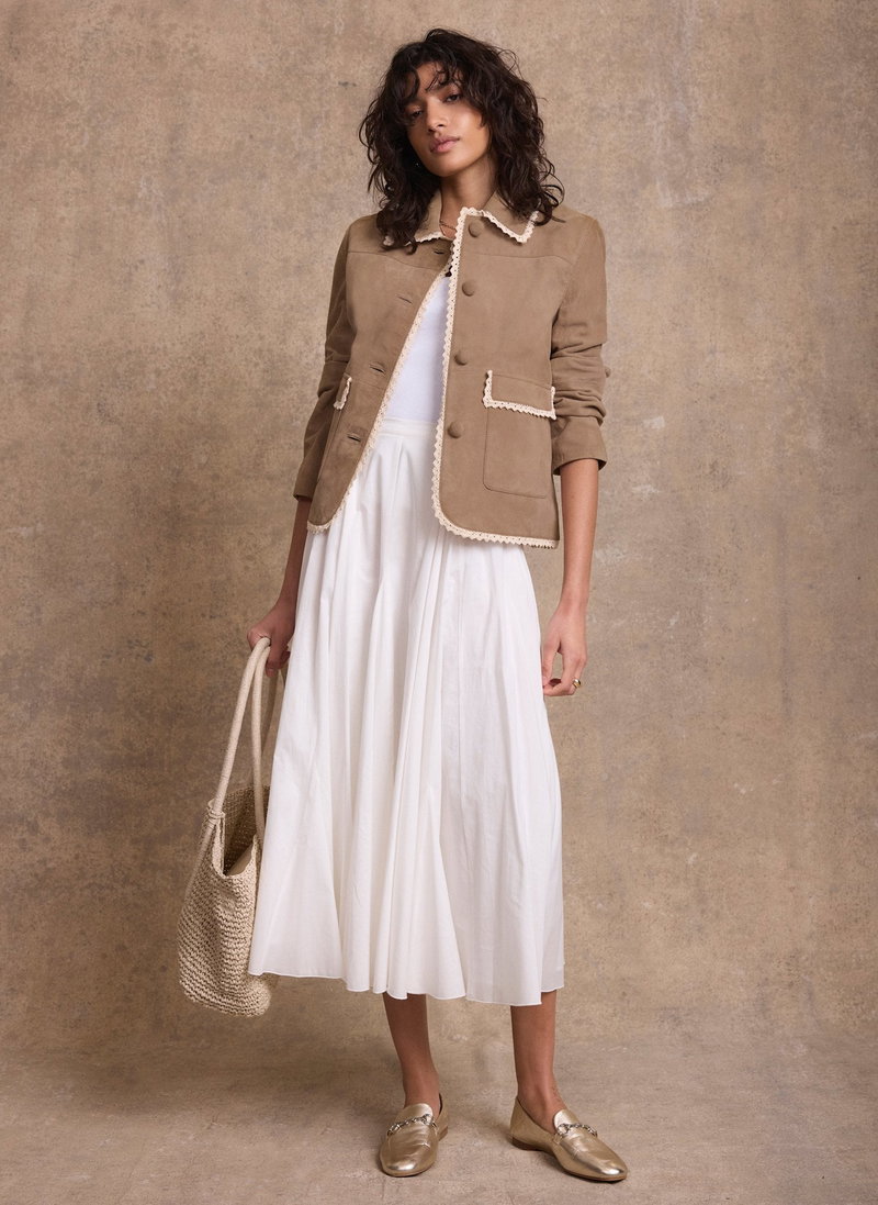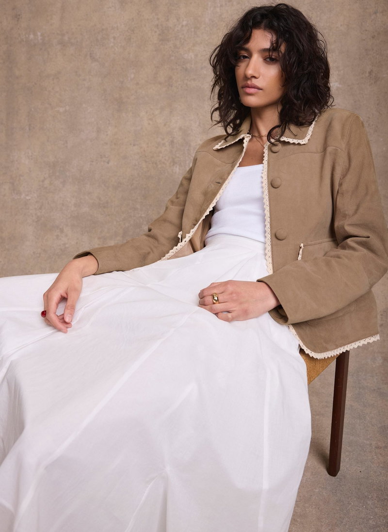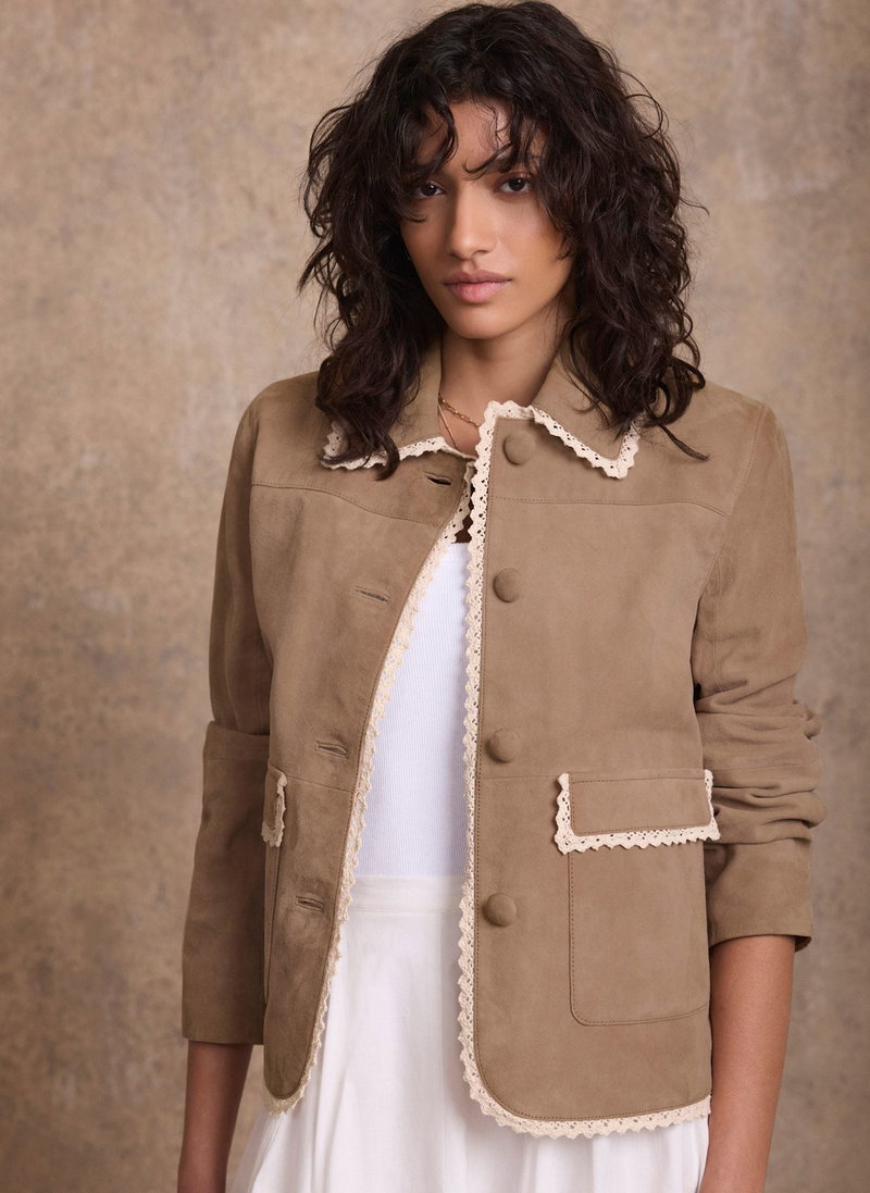 Neutral suede jacket featuring a classic collar, long sleeves, square pockets, crochet trim with a button fastening through the front.