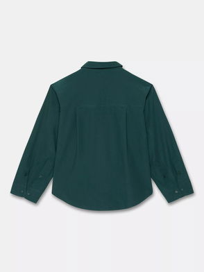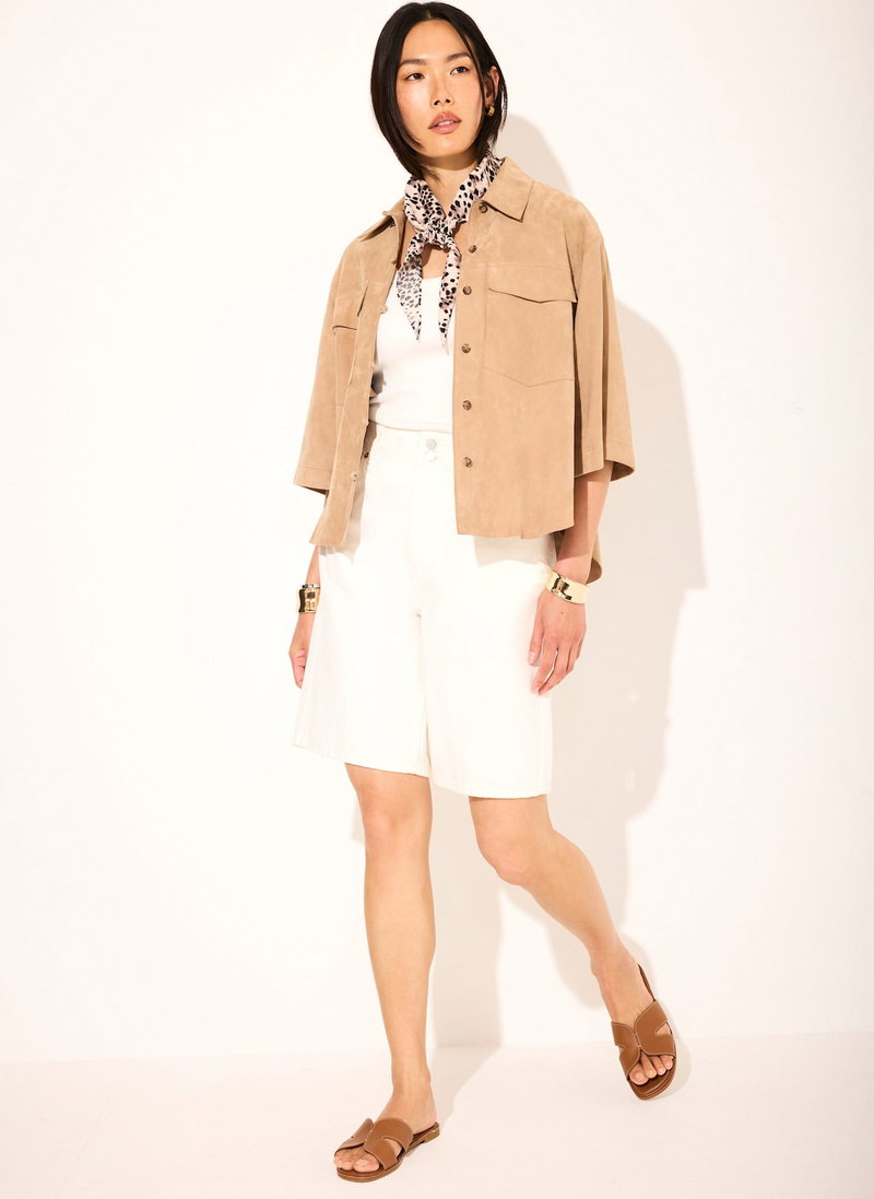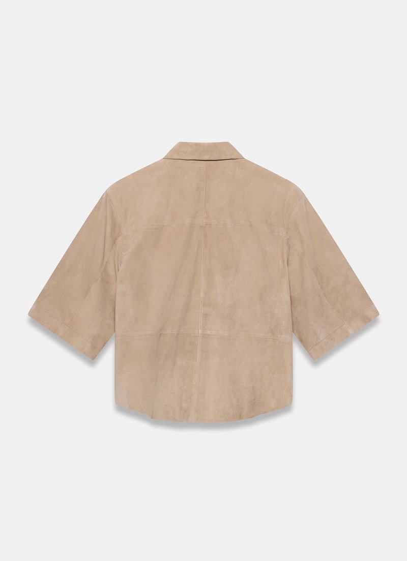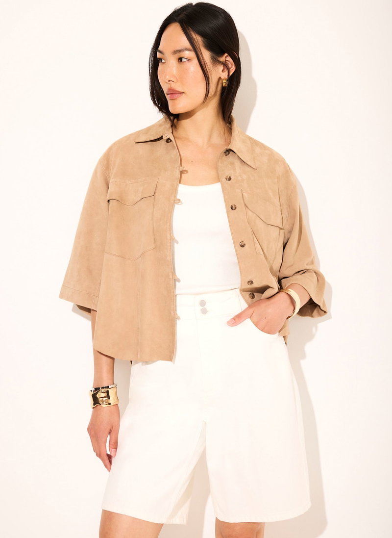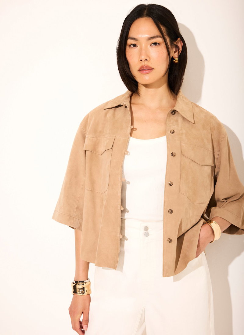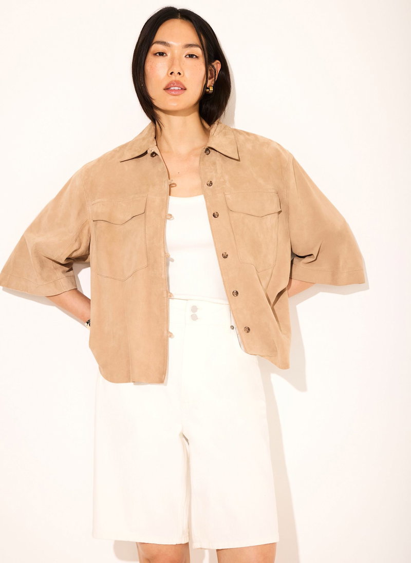 Neutral suede oversized shirt featuring a classic collar, 3/4 length sleeves, front chest pockets with a button fastening through the front.