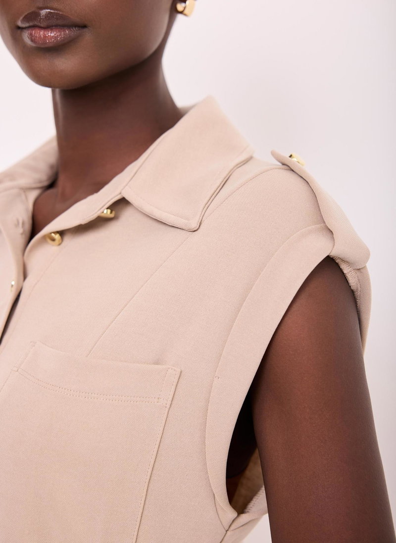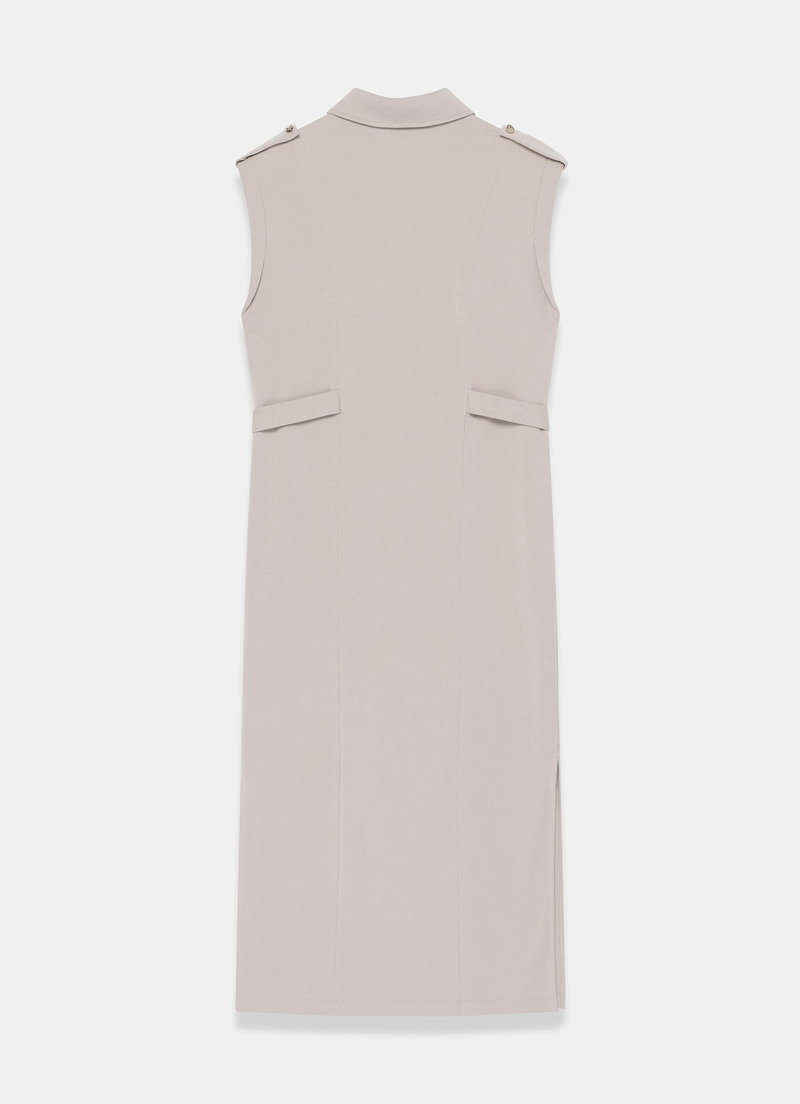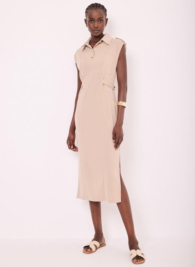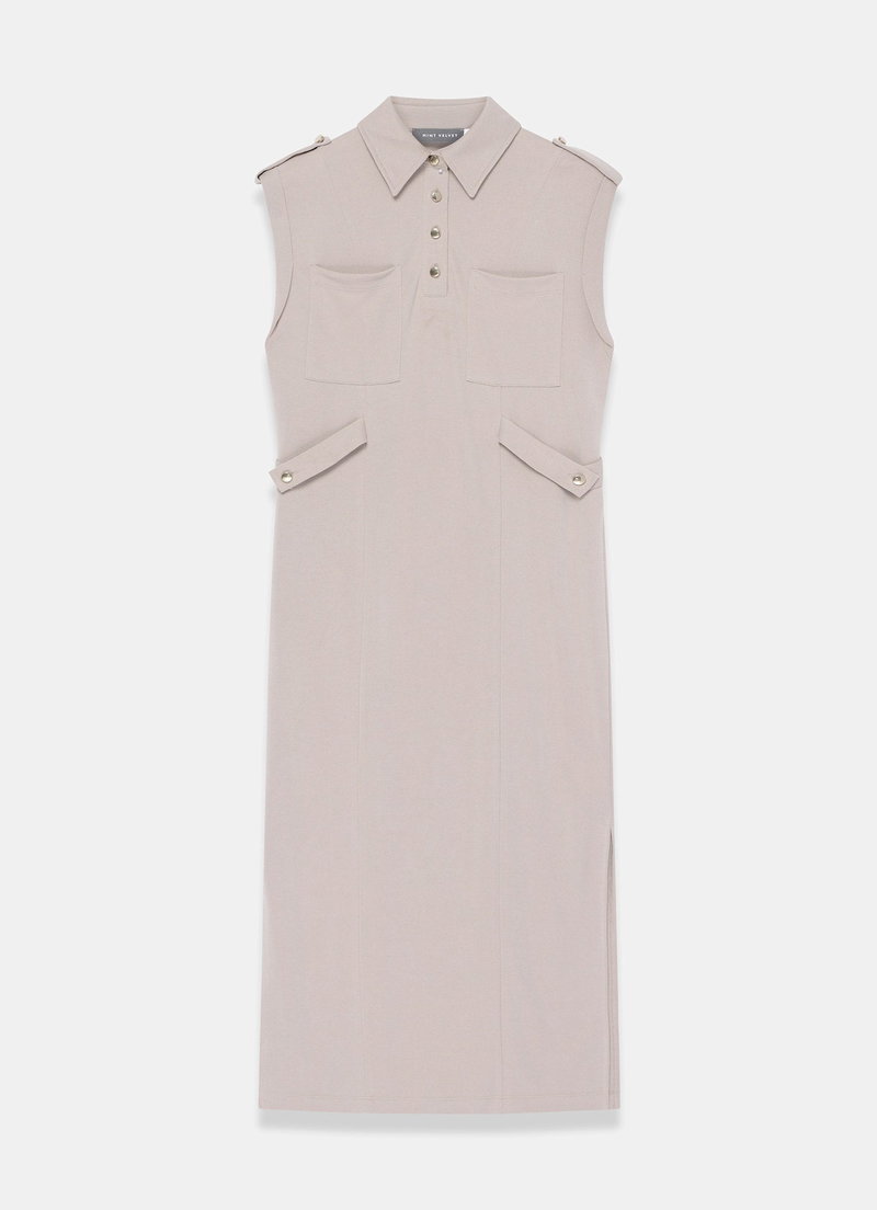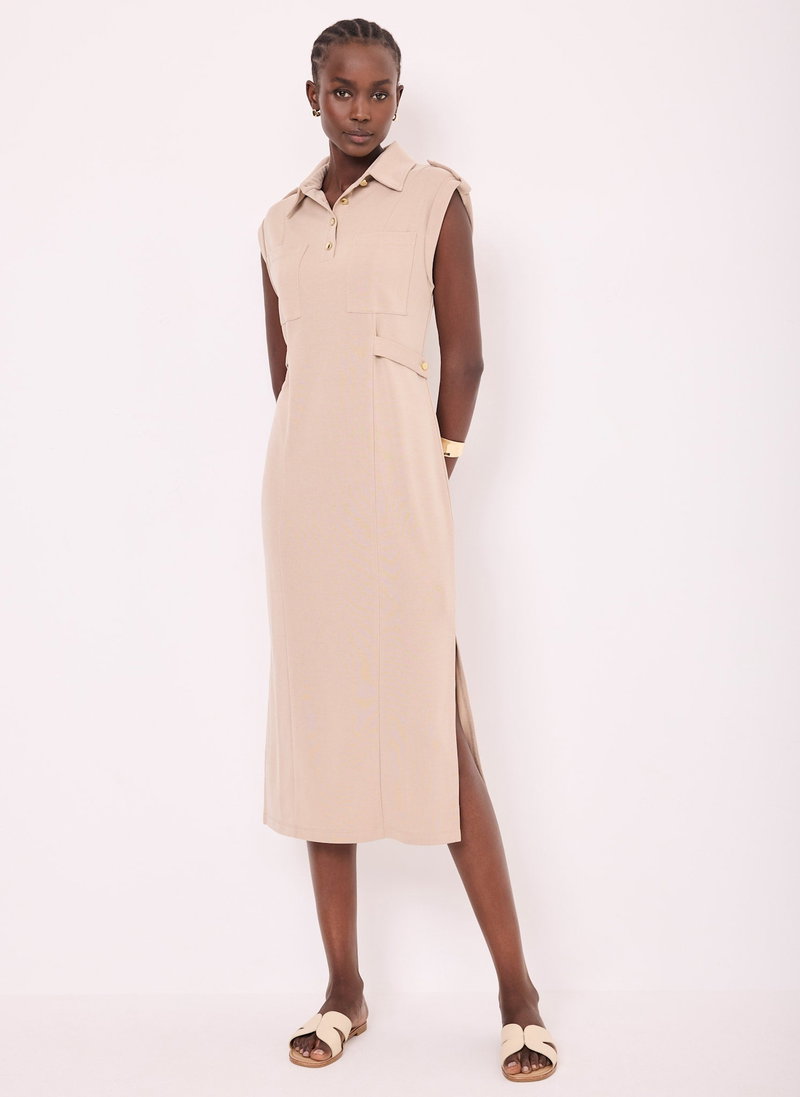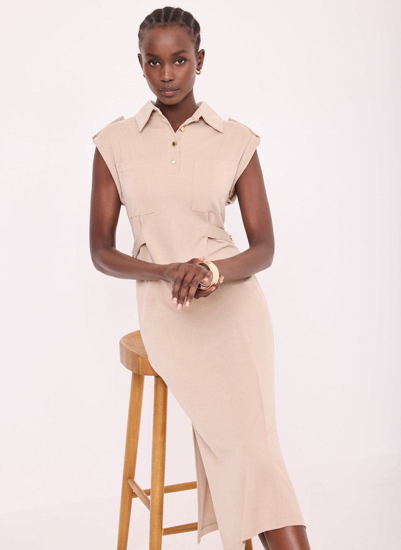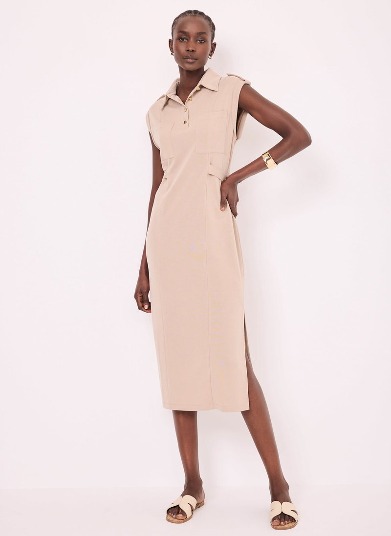 Neutral sleeveless dress in a midi silhouette featuring a classic collar, epaulettes, chest pockets, waist tabs with a button fastening through the front.