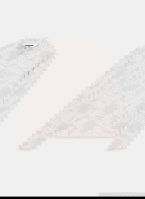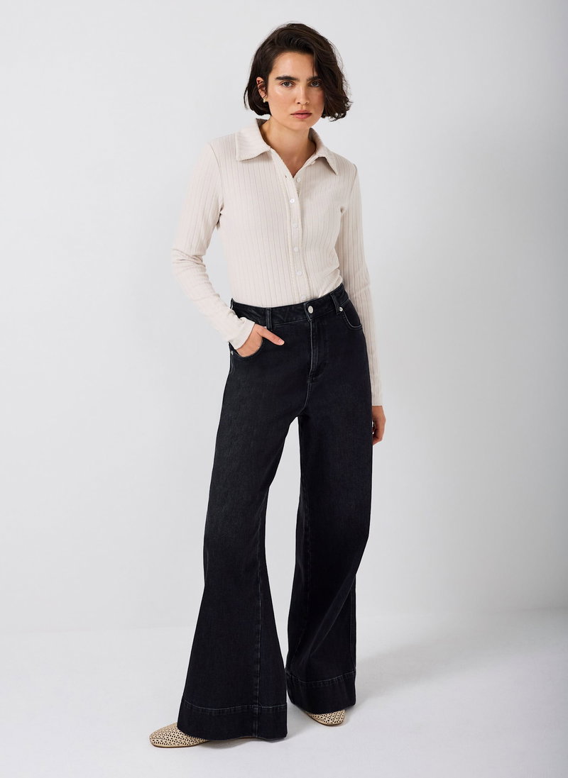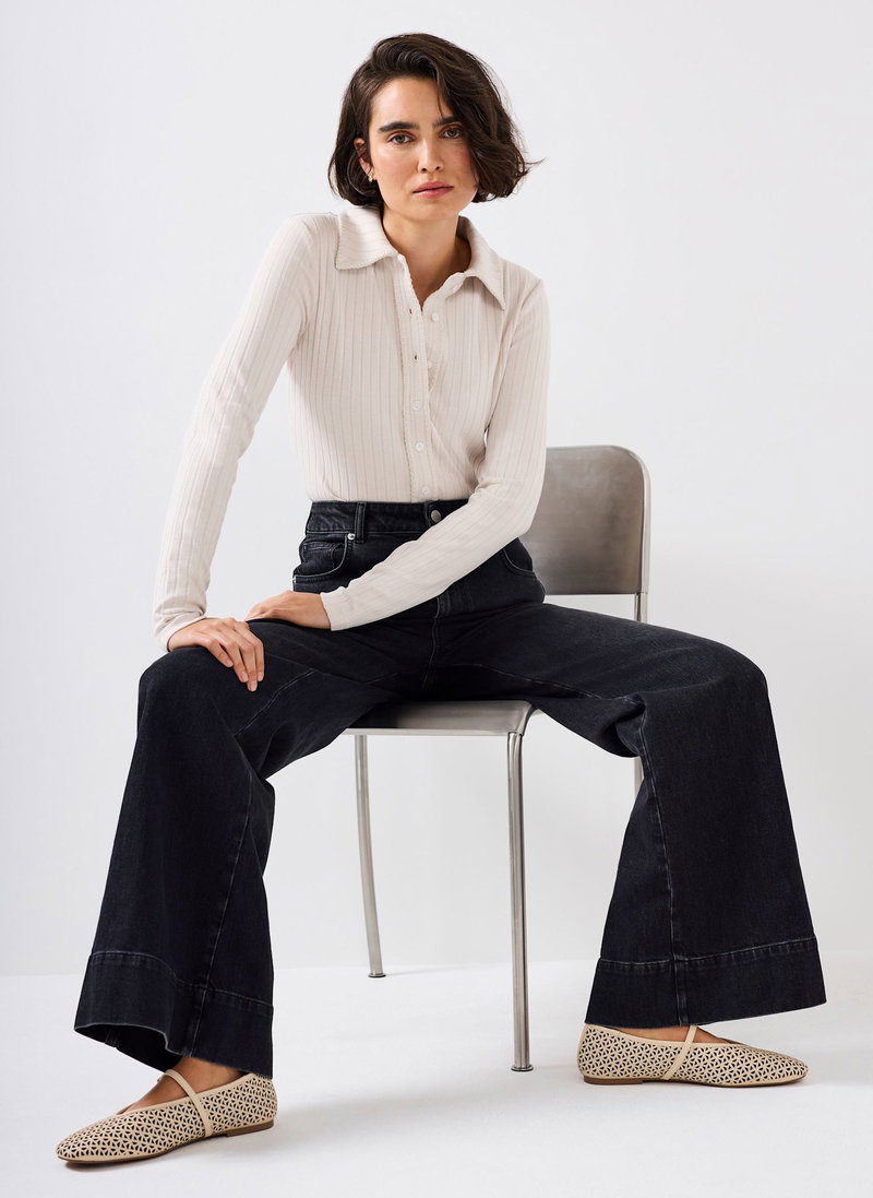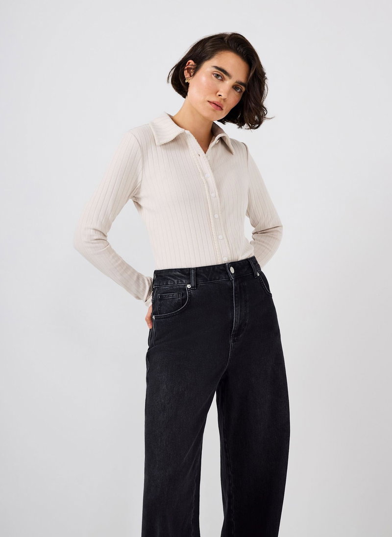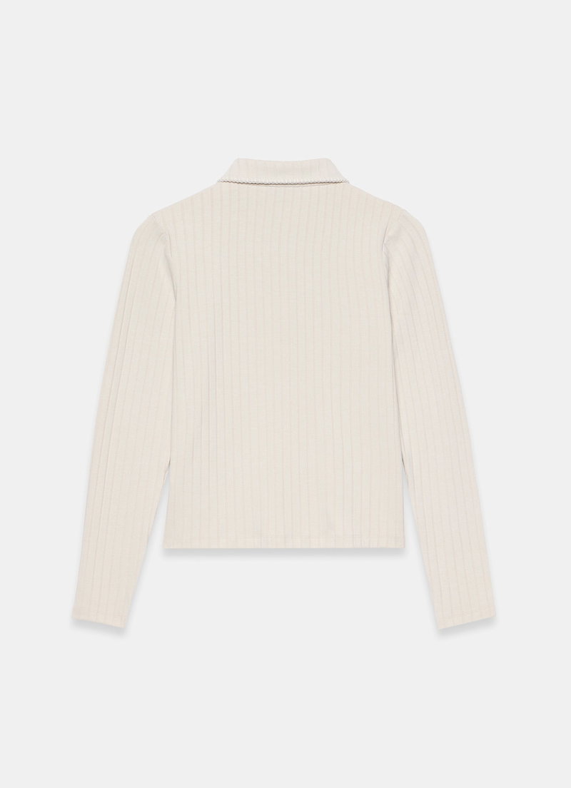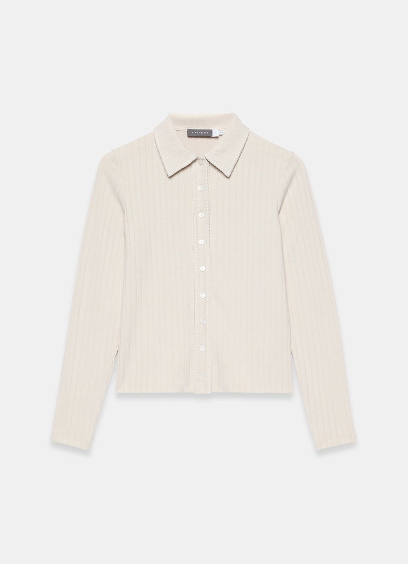 Neutral ribbed polo top featuring a classic collar, long sleeves, whipstitch detailing and button fastening through the front.
