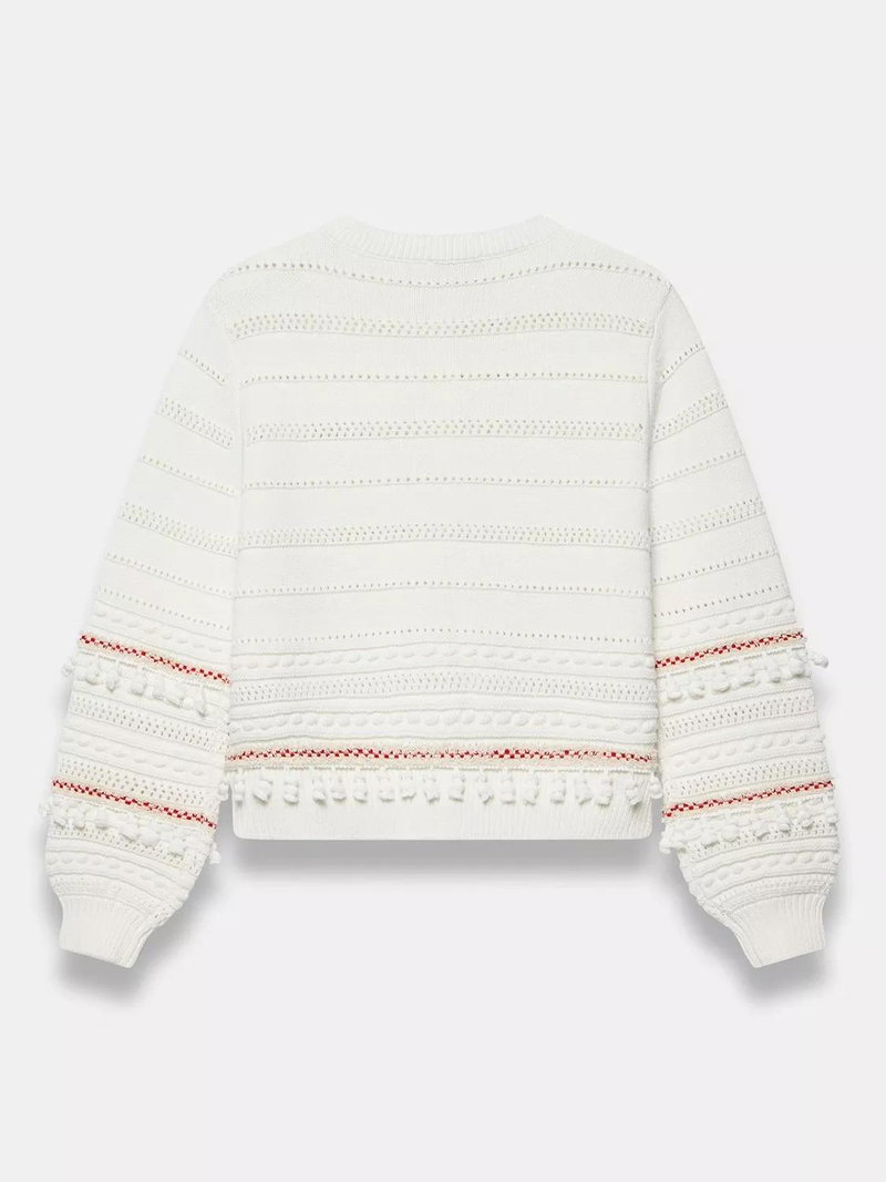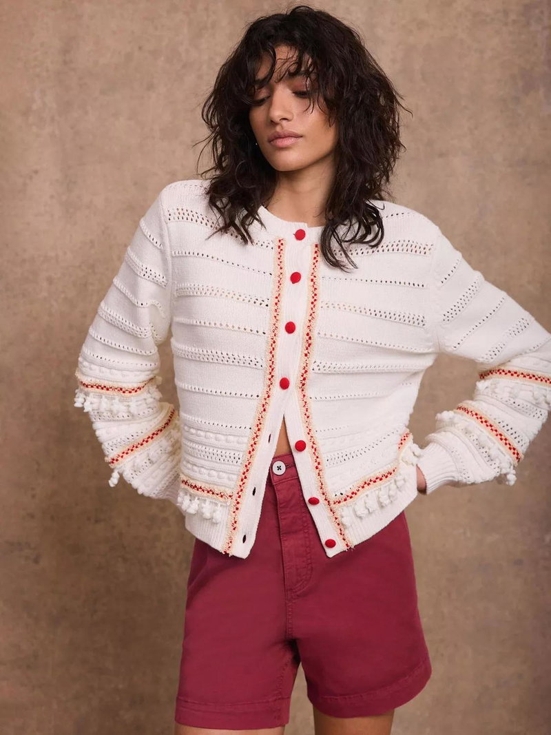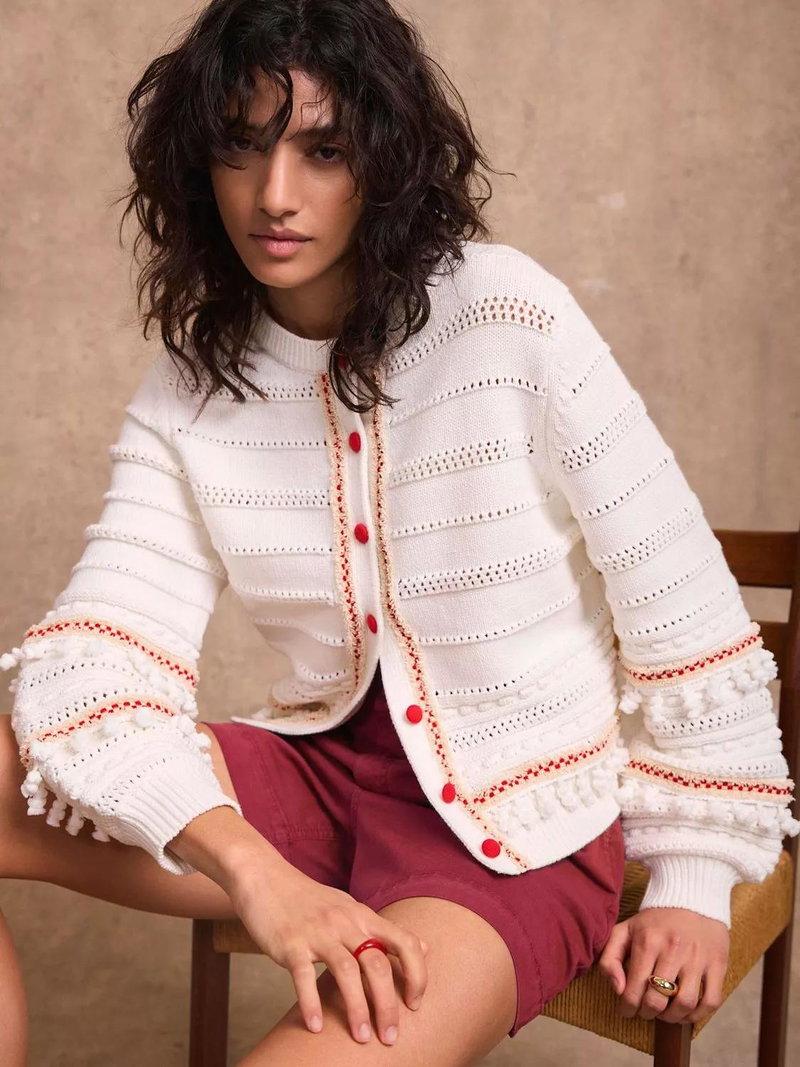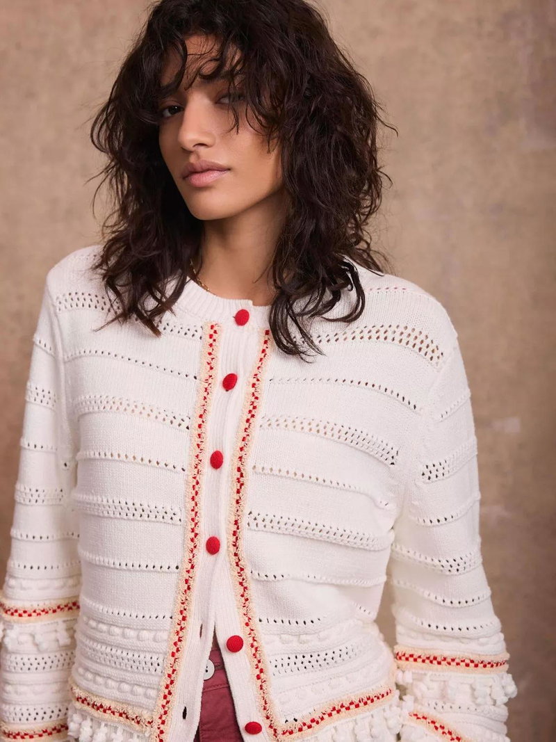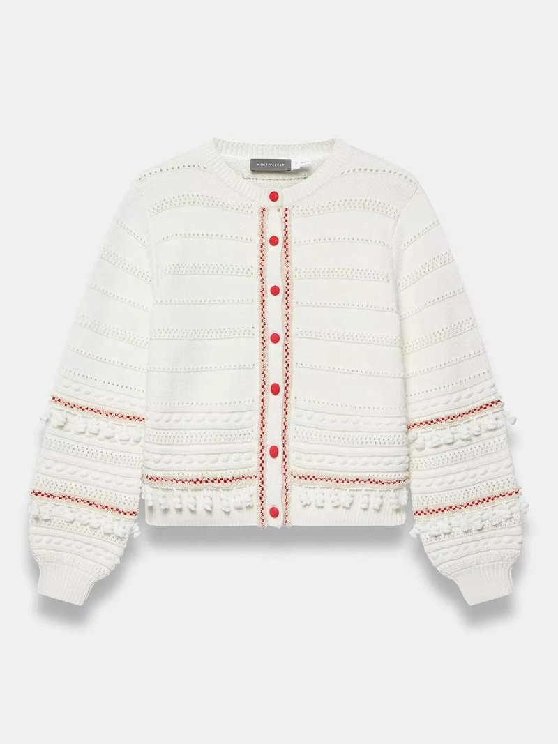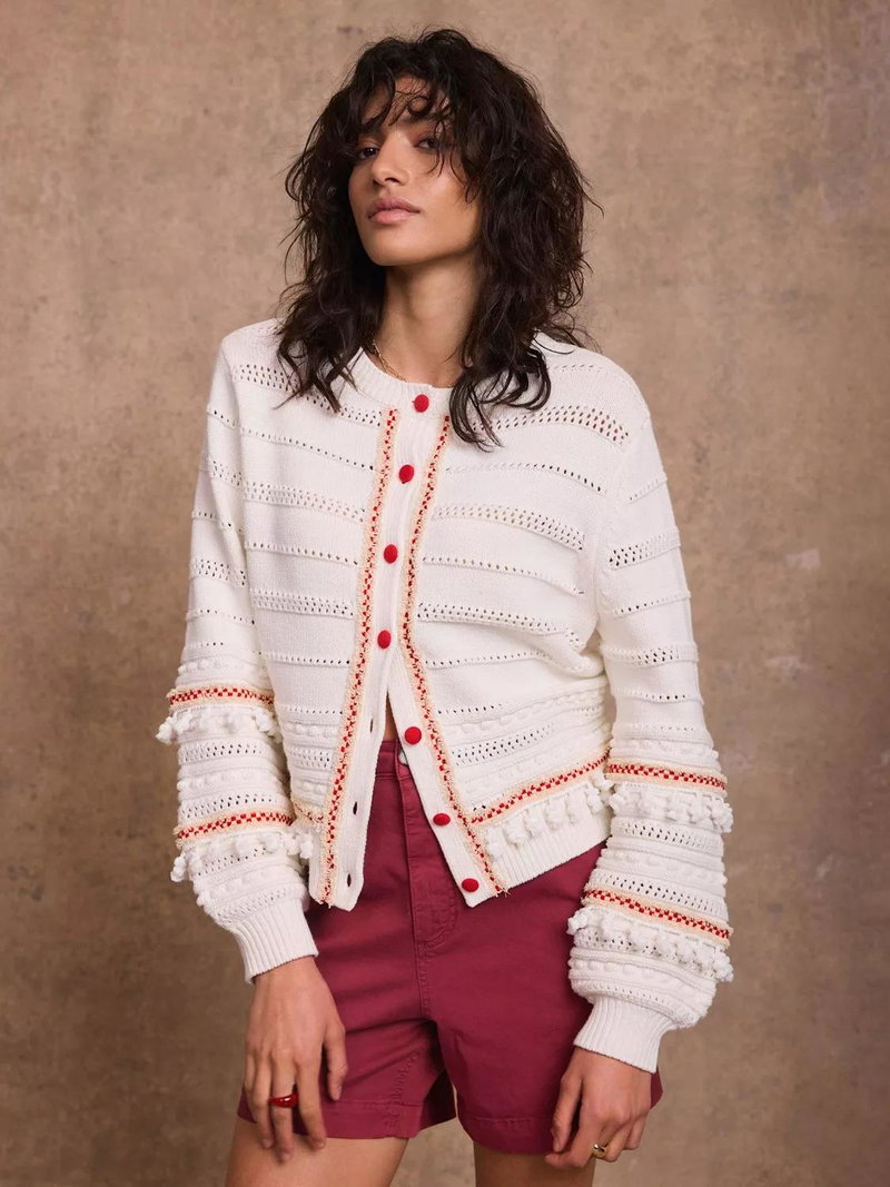 An open knit cardigan featuring a crew neckline, long sleeves, contrast detailing, tassel trim with a button fastening through the front.