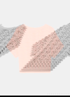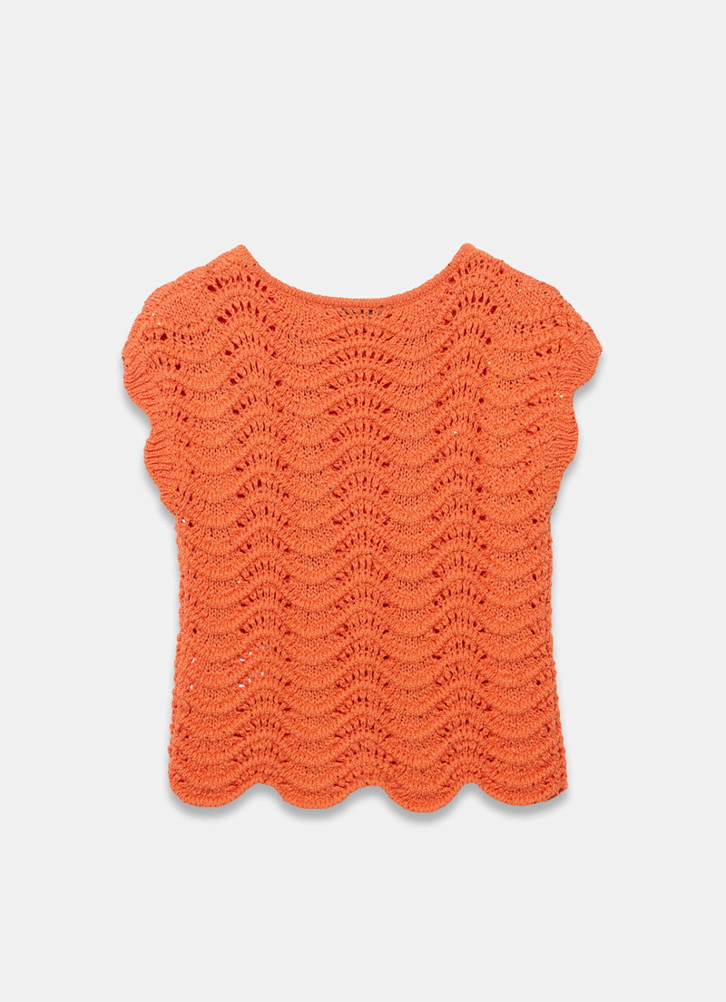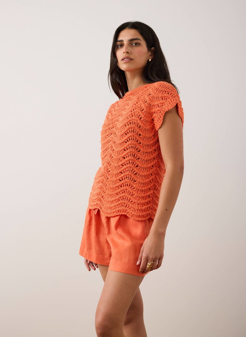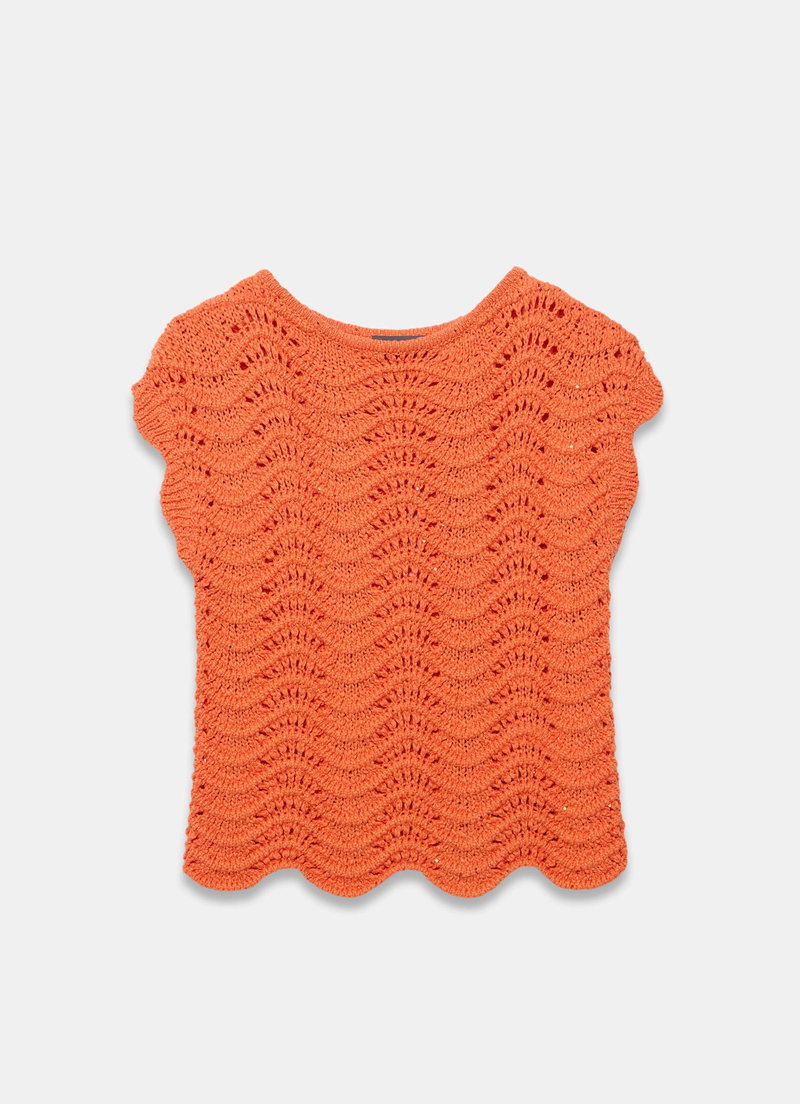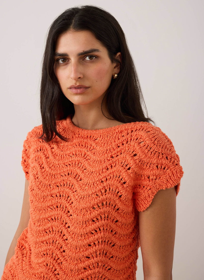 Orange open stitch top featuring a crew neckline, short sleeves, scallop trim, and metallic thread detailing.