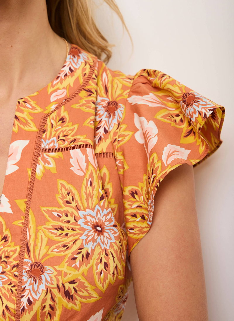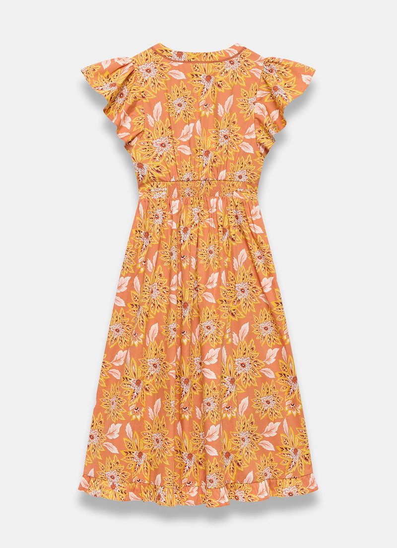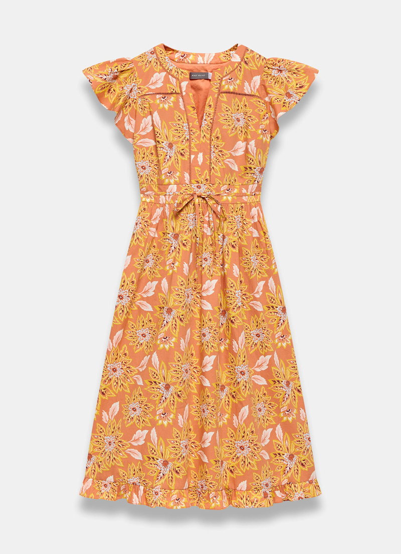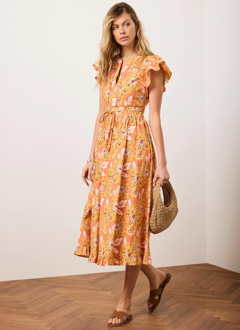 Orange floral print dress in a midi silhouette featuring a V-neckline, ruffle cap sleeves, open stitch trim, ruffle hemline, elasticated waistband with a tie fastening through the front.