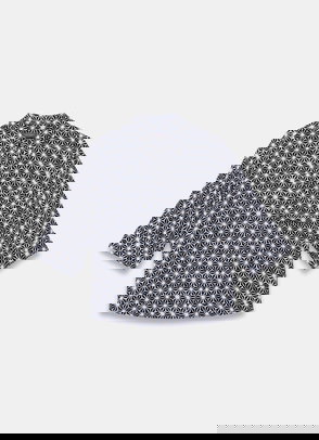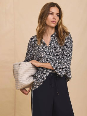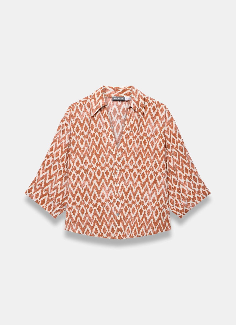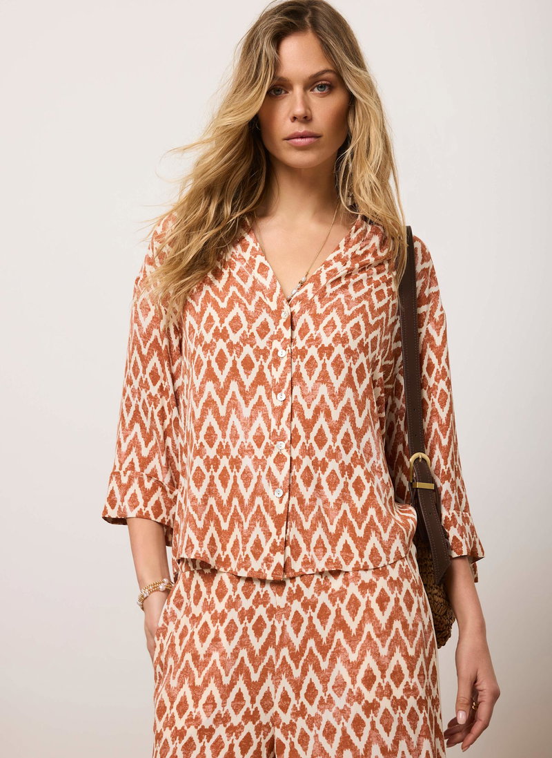 Orange tone geo print shirt featuring a classic collar, V-neckline, short fold-back sleeves, curved hemline, dart back detail with a button fastening through the front.