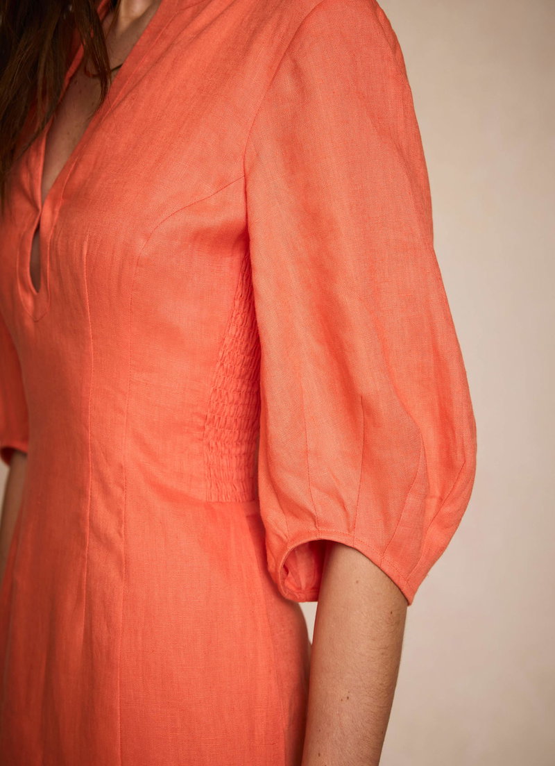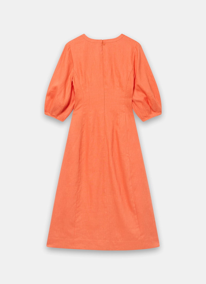 Orange tone dress in a midi silhouette featuring a V-neckline, key-hole detail, 3/4 puff sleeves with a zip fastening through the back.