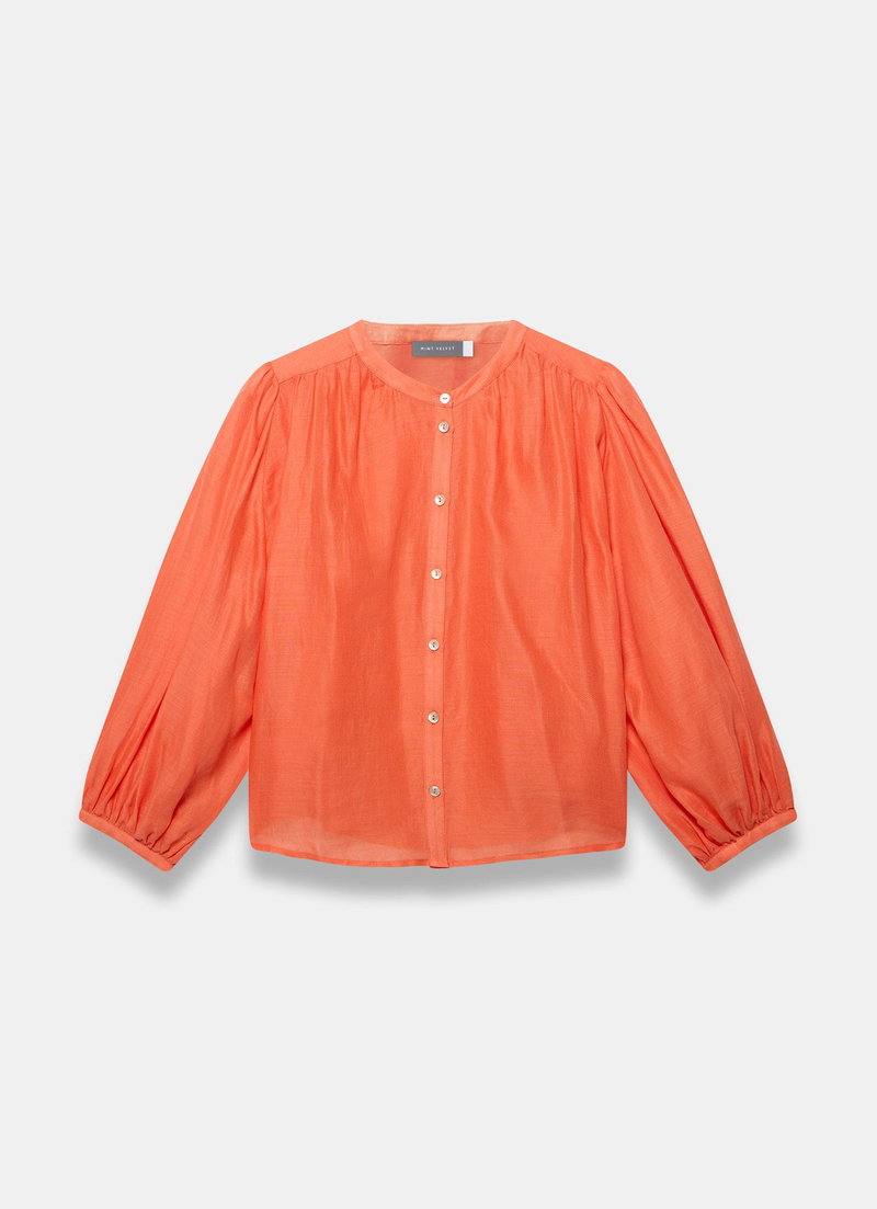 Orange tone blouse featuring a crew neckline, 3/4 batwing sleeves, buttoned cuffs with a button fastening through the front.