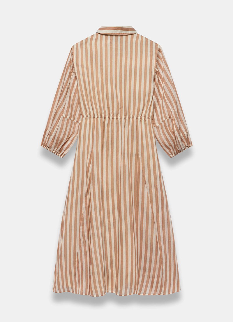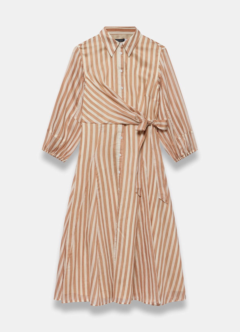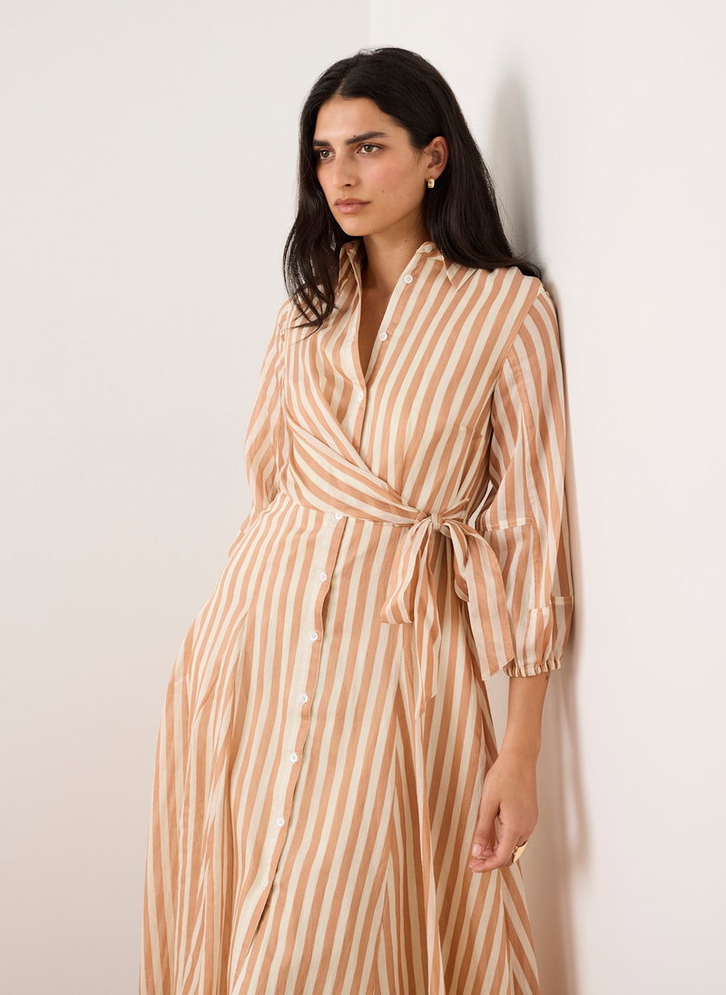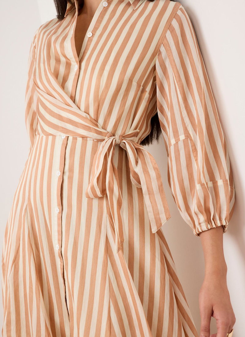 Orange striped shirt dress in a midi silhouette featuring a classic collar, long blouson sleeves, elasticated cuffs, wrap tie feature at the waistband, godet hemline and a button fastening through the front.