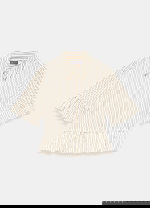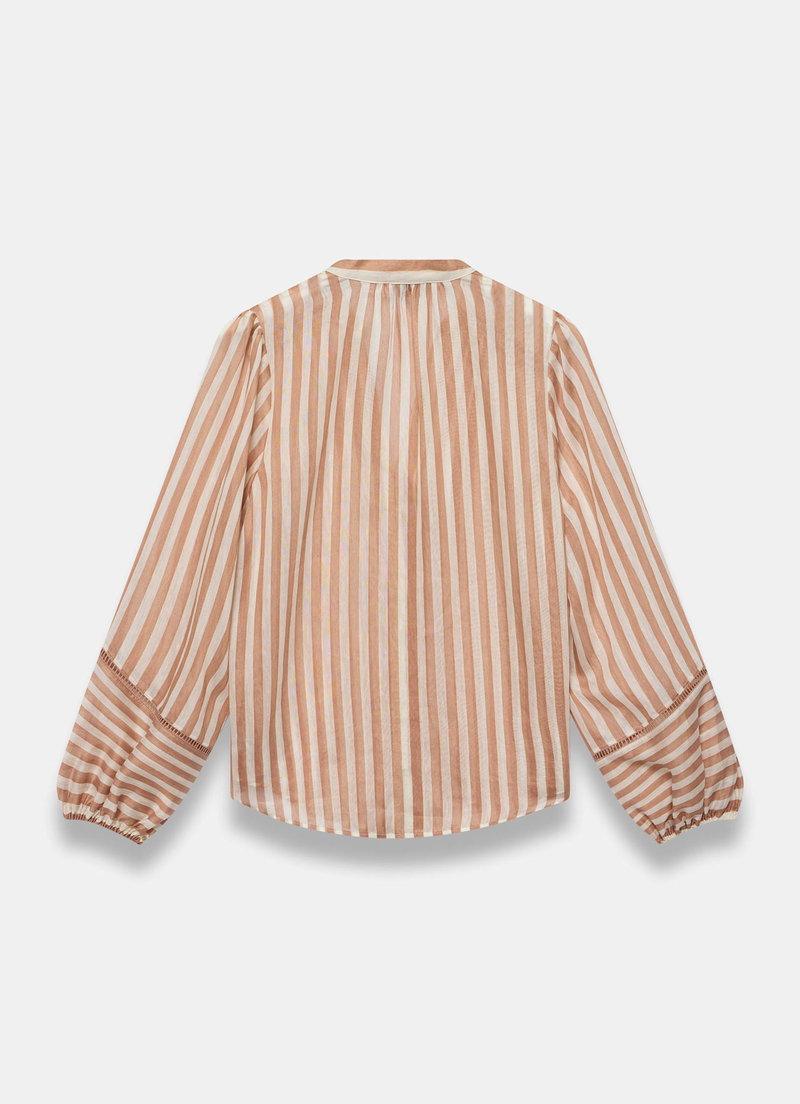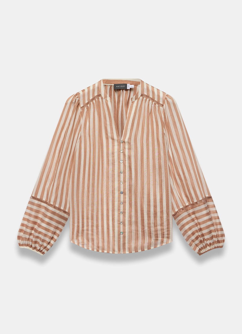 Orange striped blouse featuring a V-neckline, open stitch trim, long contrast panel sleeves, elasticated cuffs, curved hemline with a button fastening through the front.