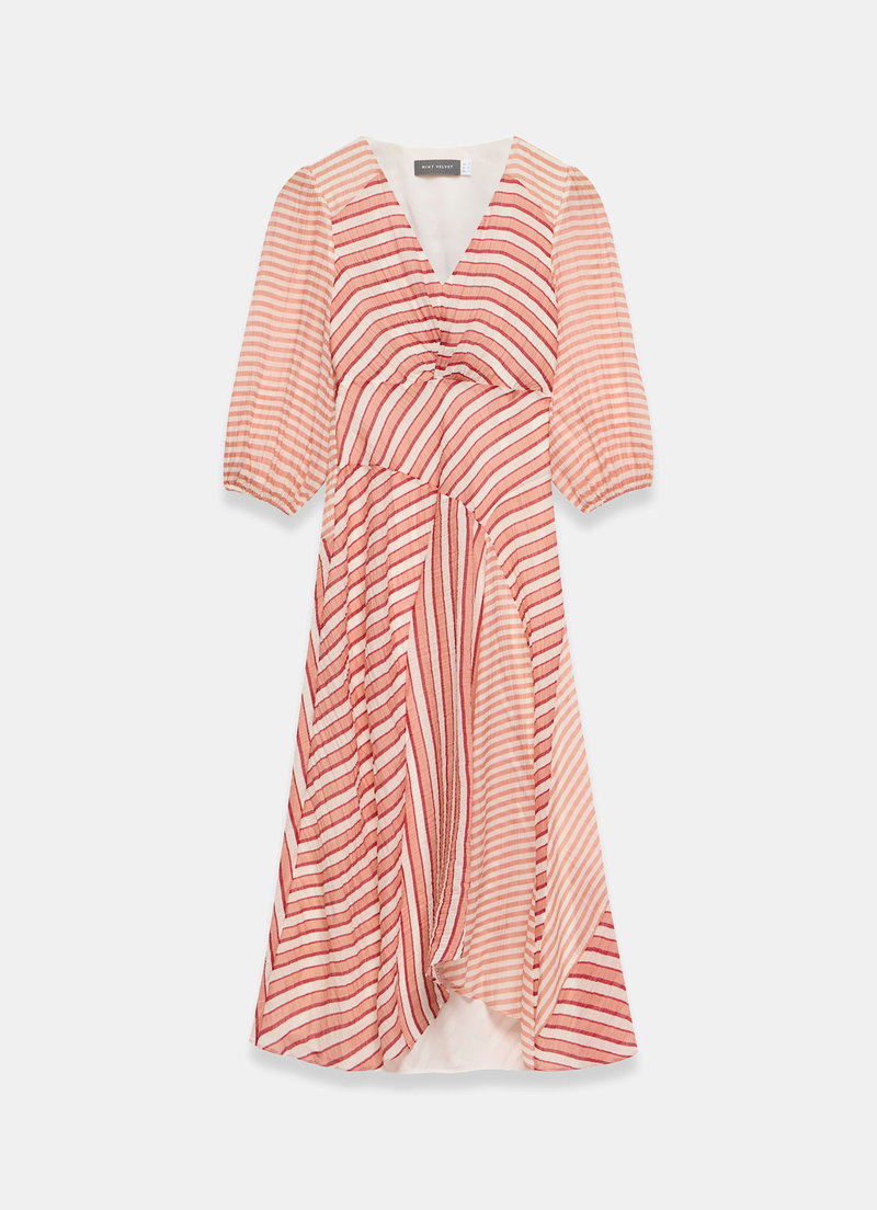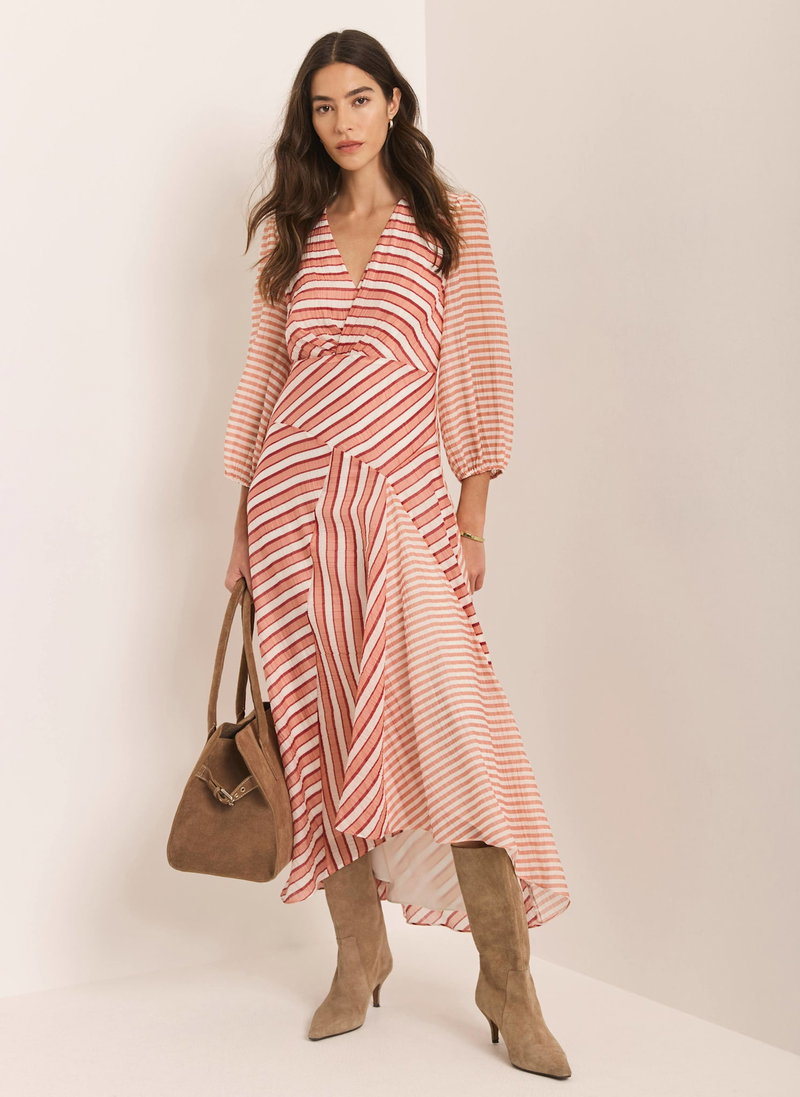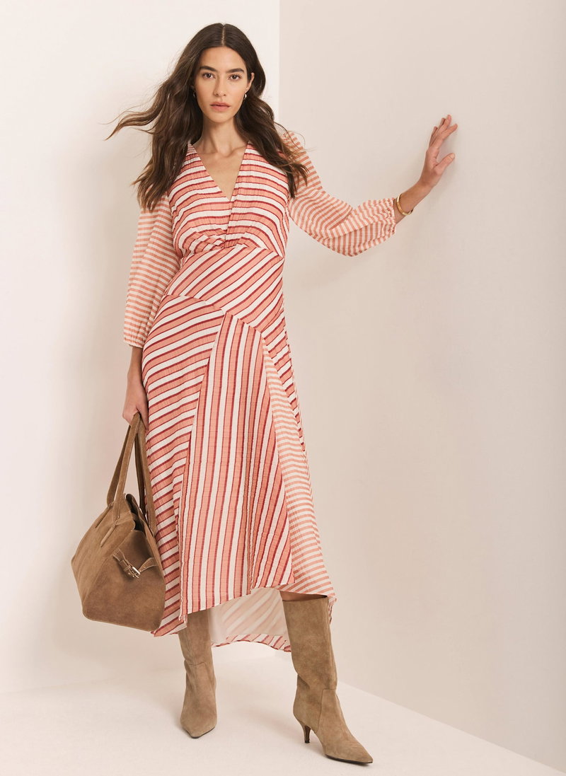 Orange striped dress in a maxi silhouette featuring a V-neckline, twisted front. 3/4 blouson sleeves, panelled skirt with an asymmetric hemline and zip fastening through the side.