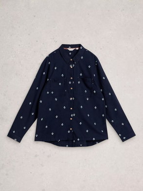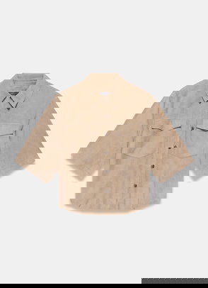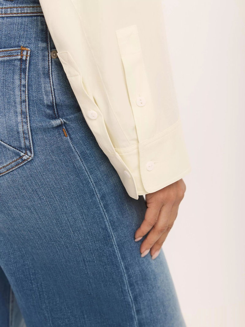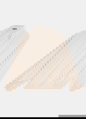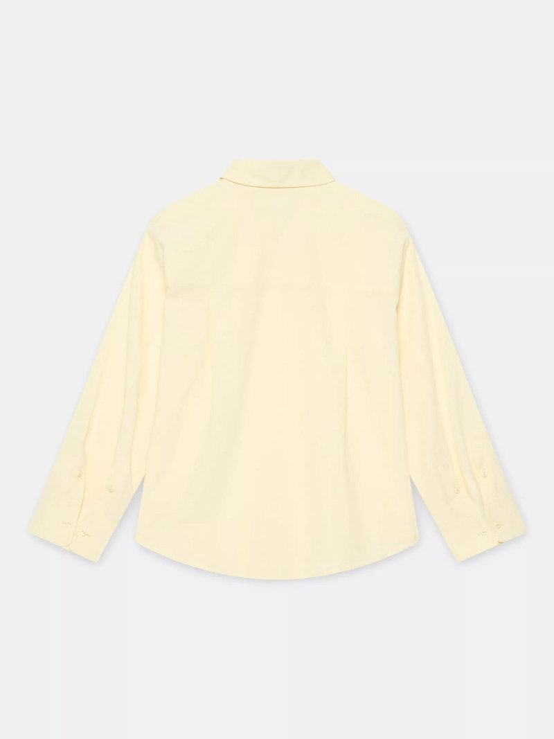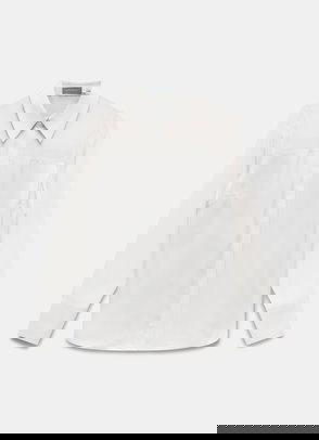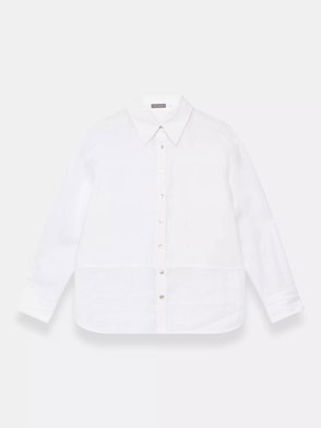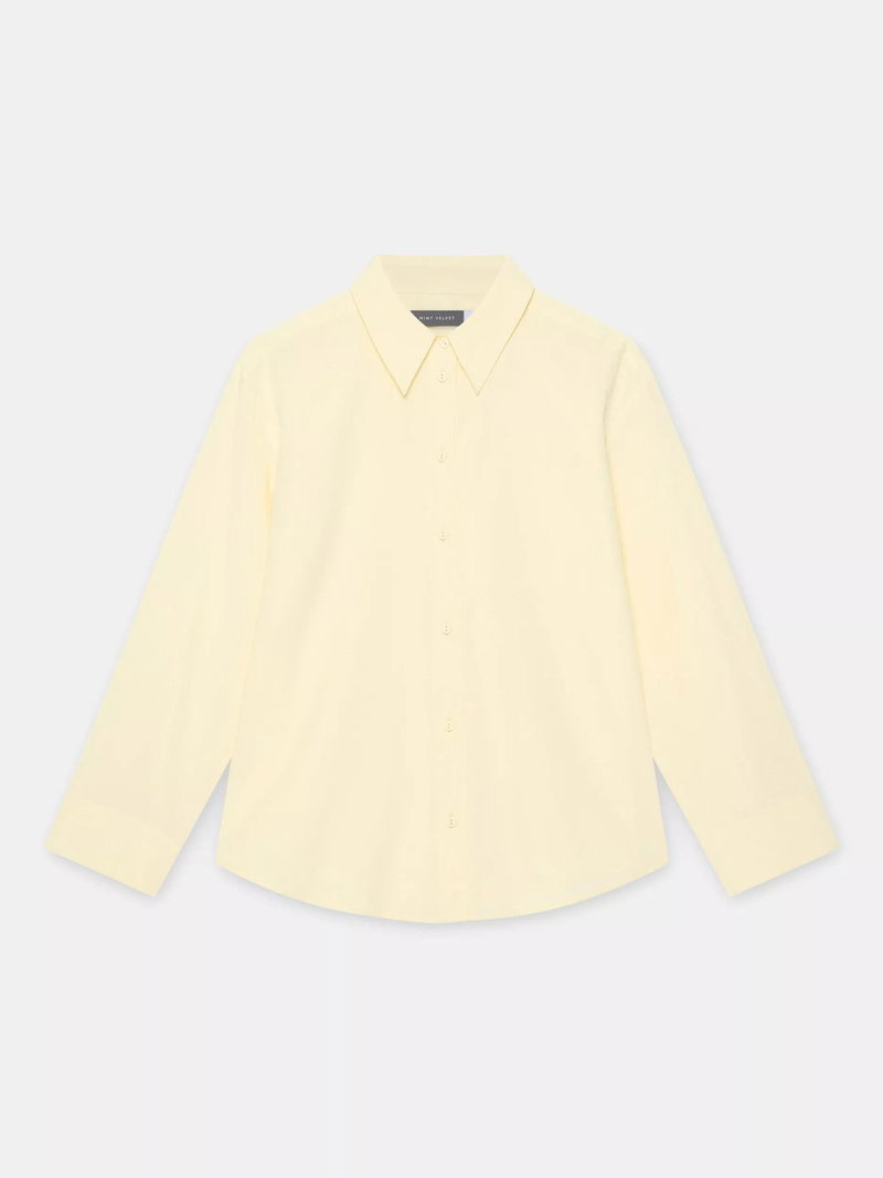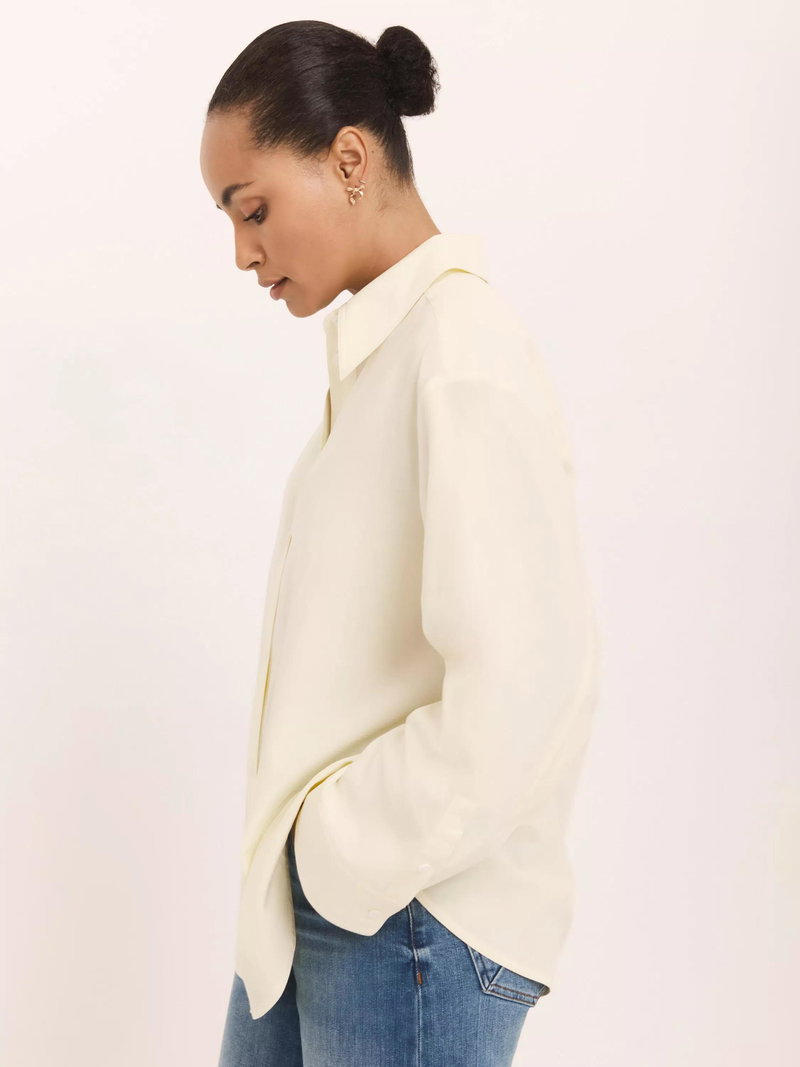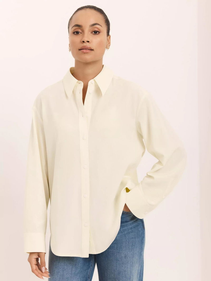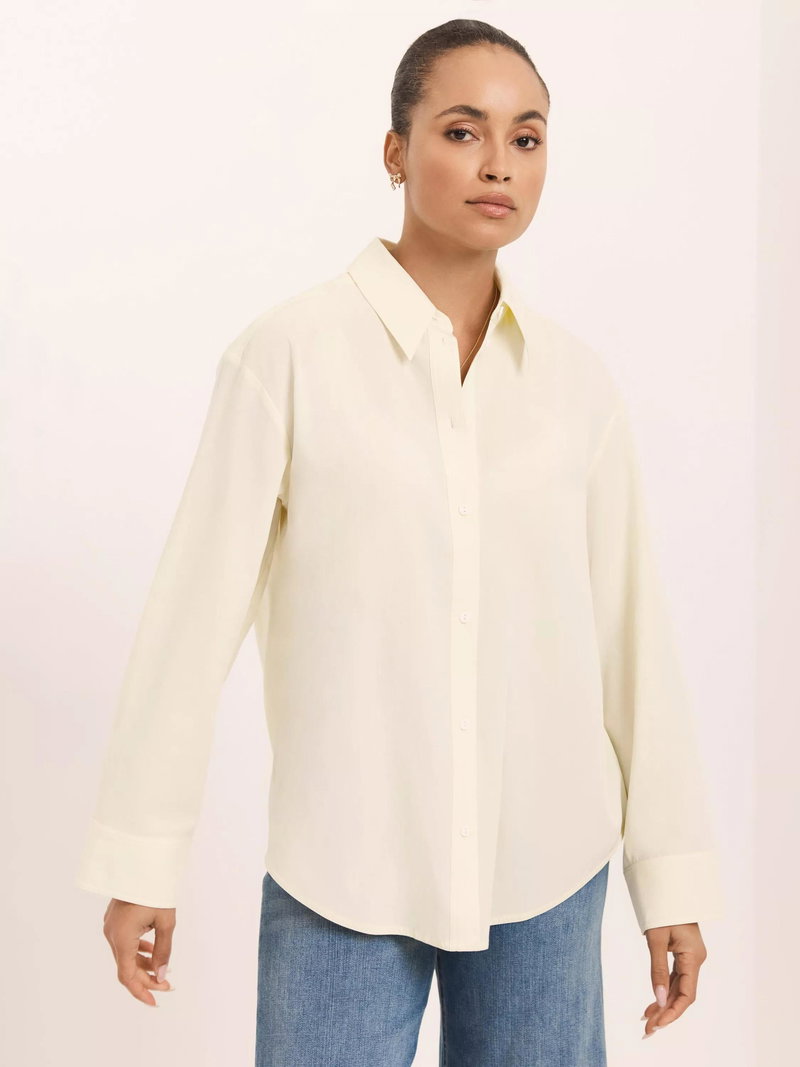 A lightweight shirt in an oversized fit featuring a classic collar, long sleeves, buttoned cuffs, and scooped hemline with a button fastening through the front.