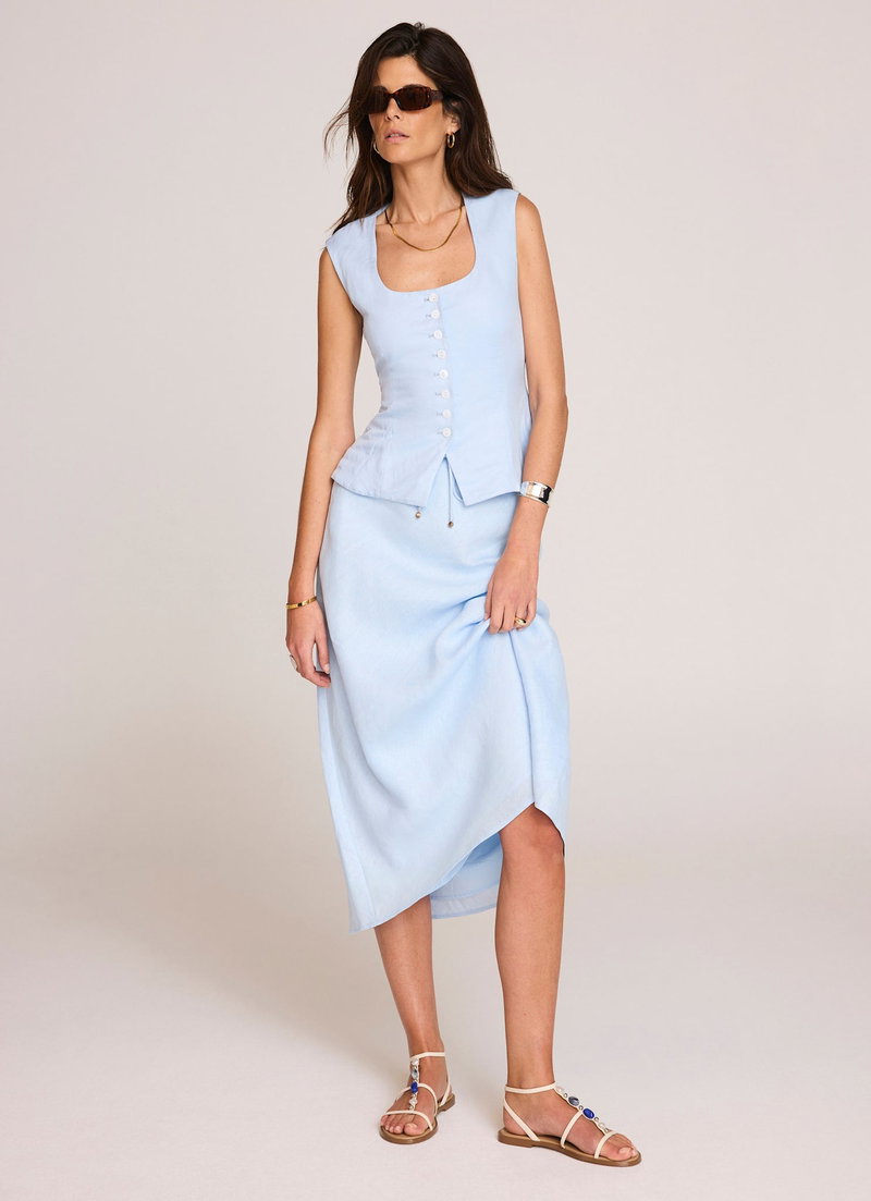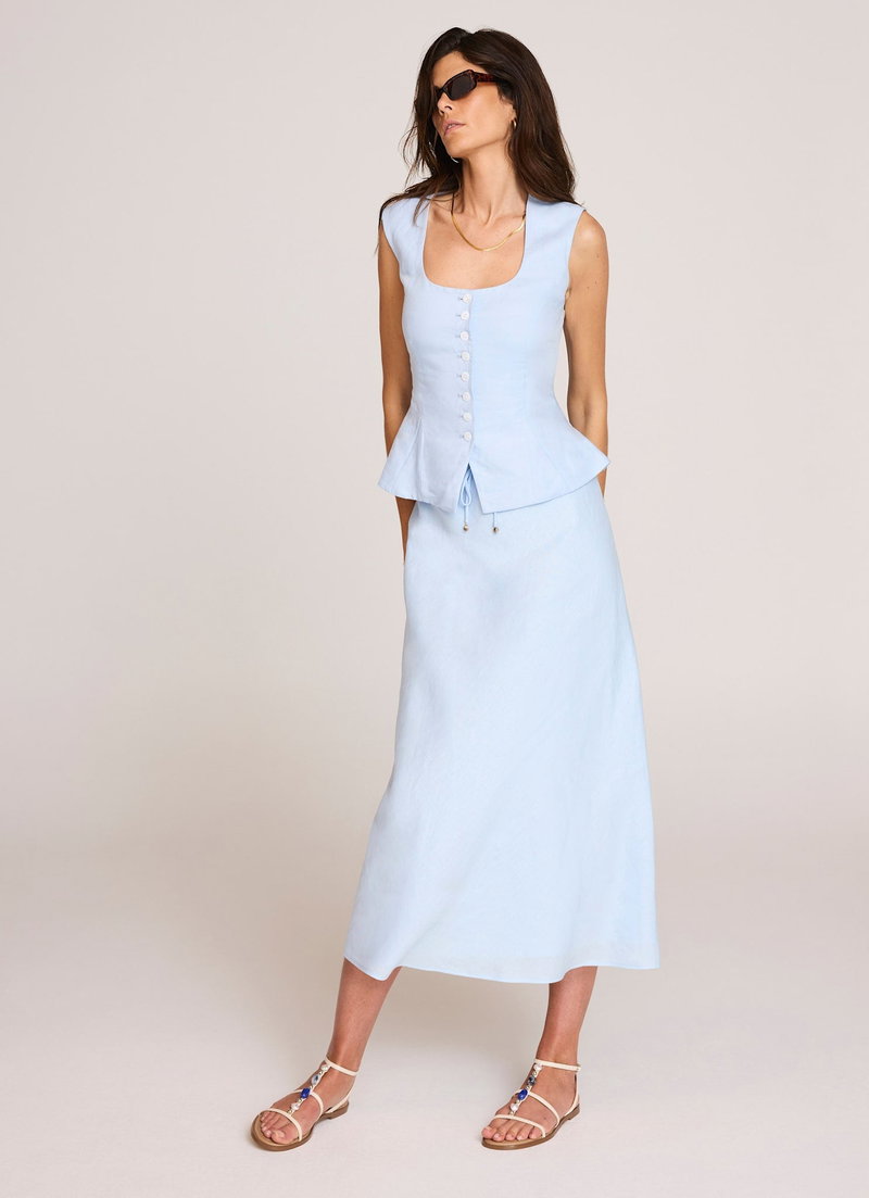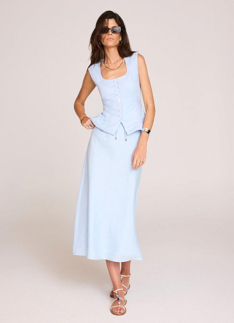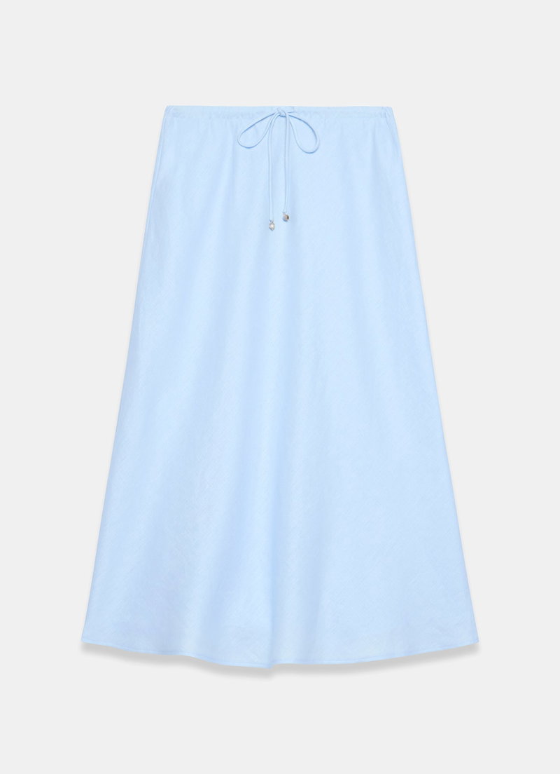 Blue tone bias cut skirt in a midi silhouette featuring a drawstring waistband.