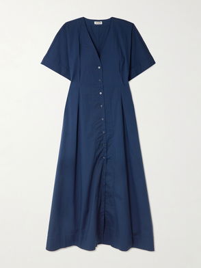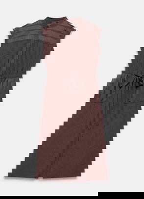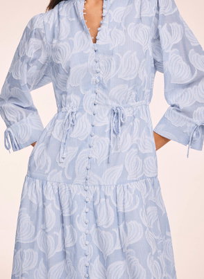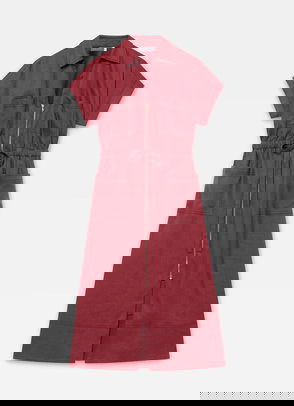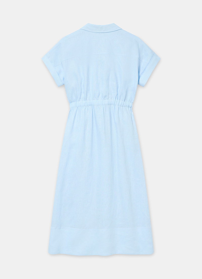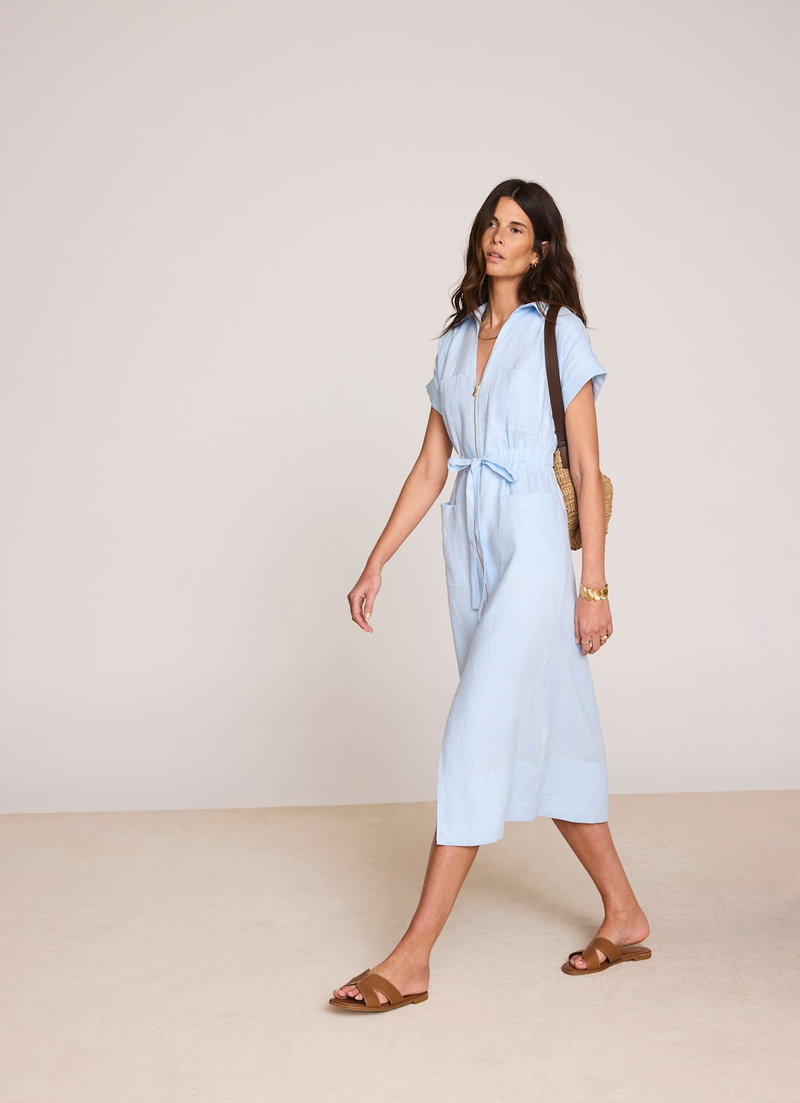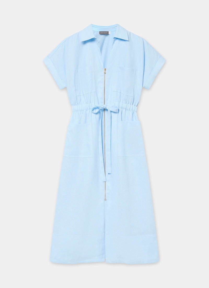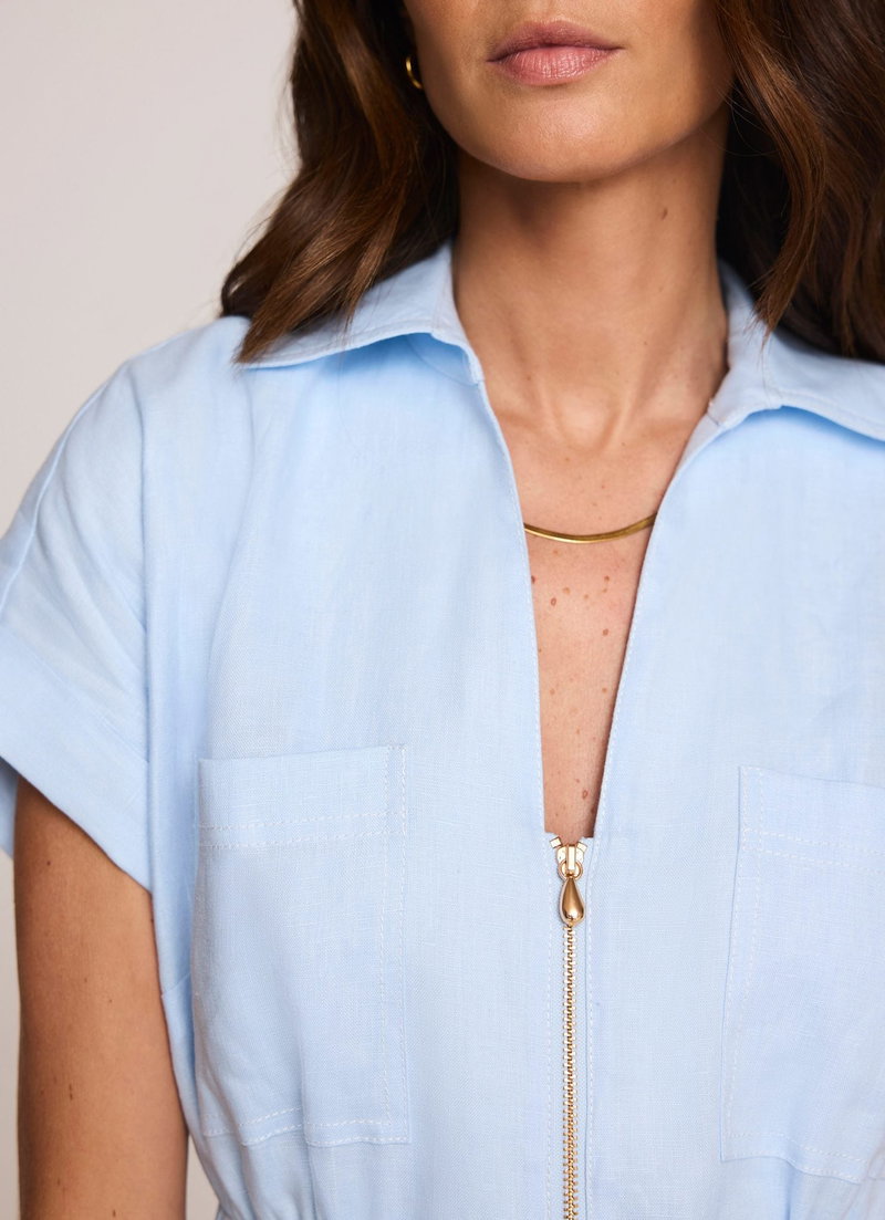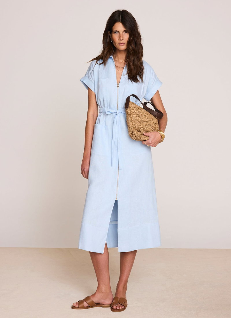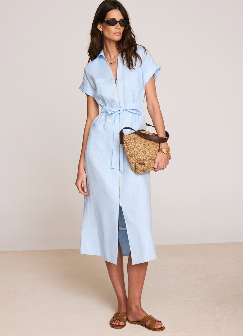 Pale blue tone utility dress in a midi silhouette featuring a classic collar, V-neckline. short sleeves, cinched drawstring waist, four square pockets with a zip fastening through the front.