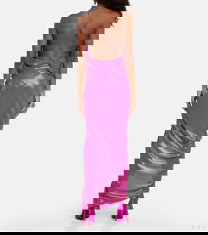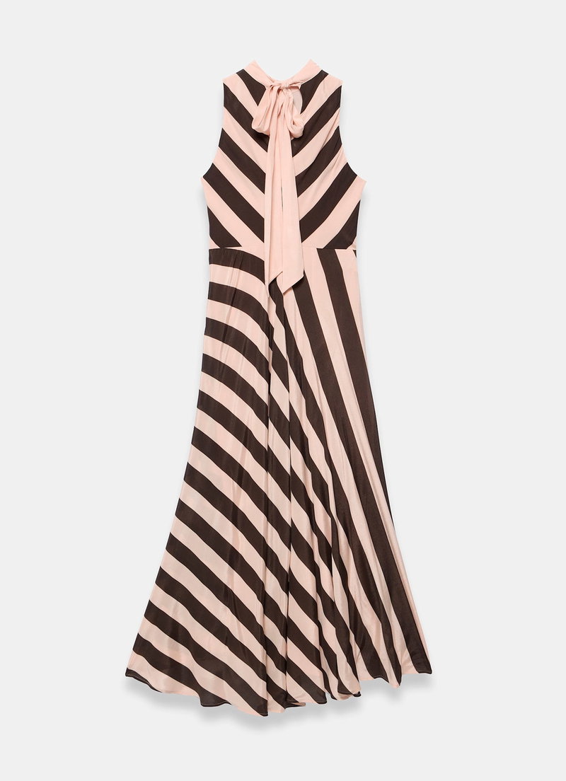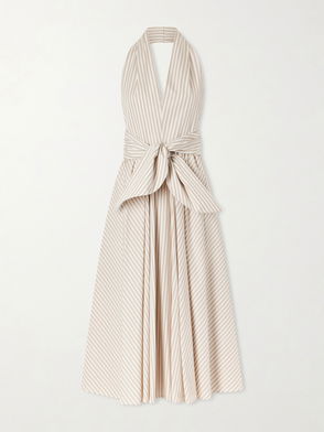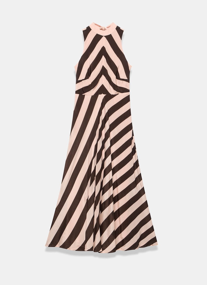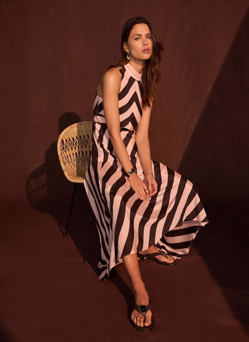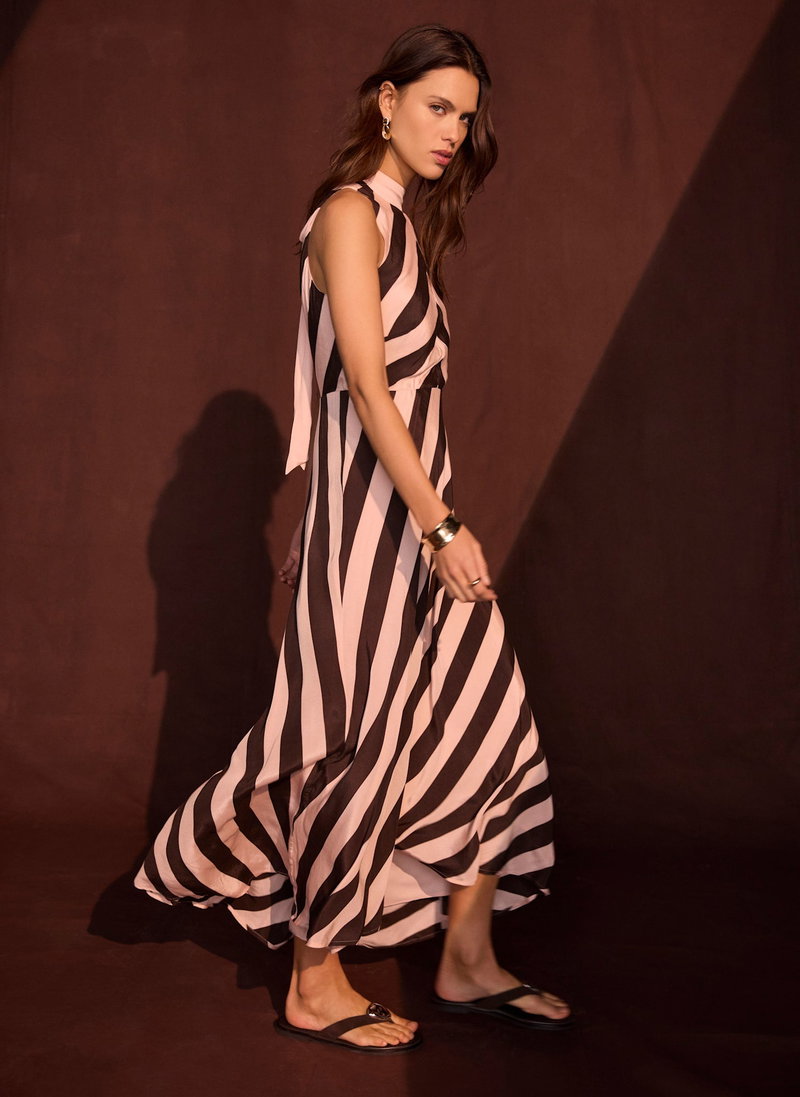 • Pink and brown striped sleeveless dress in a maxi silhouette featuring a halter neckline, waterfall hemline and tie fastening through the back.