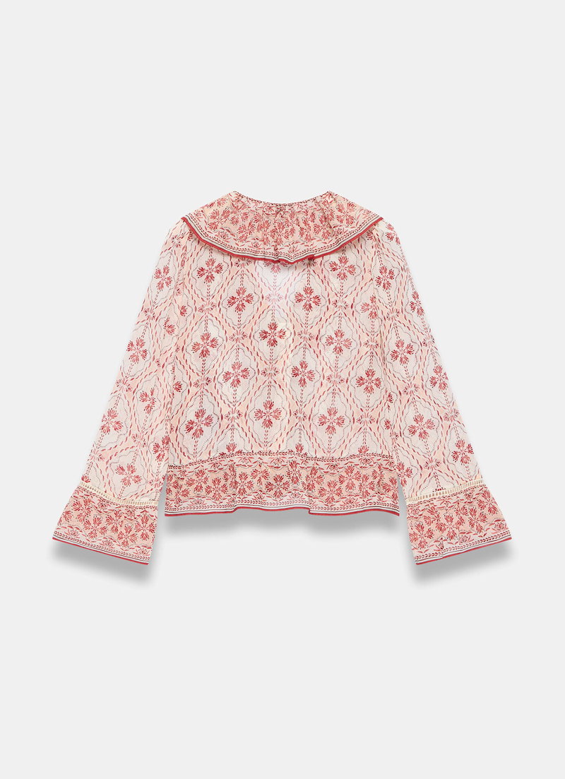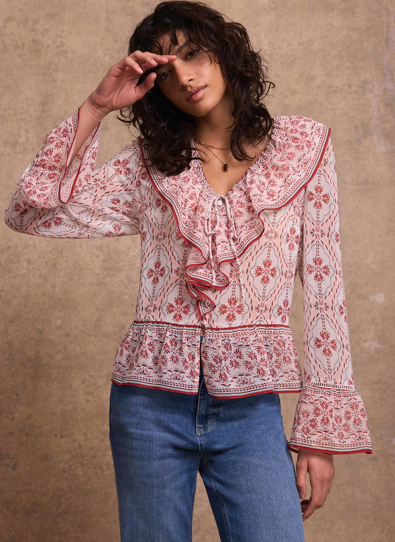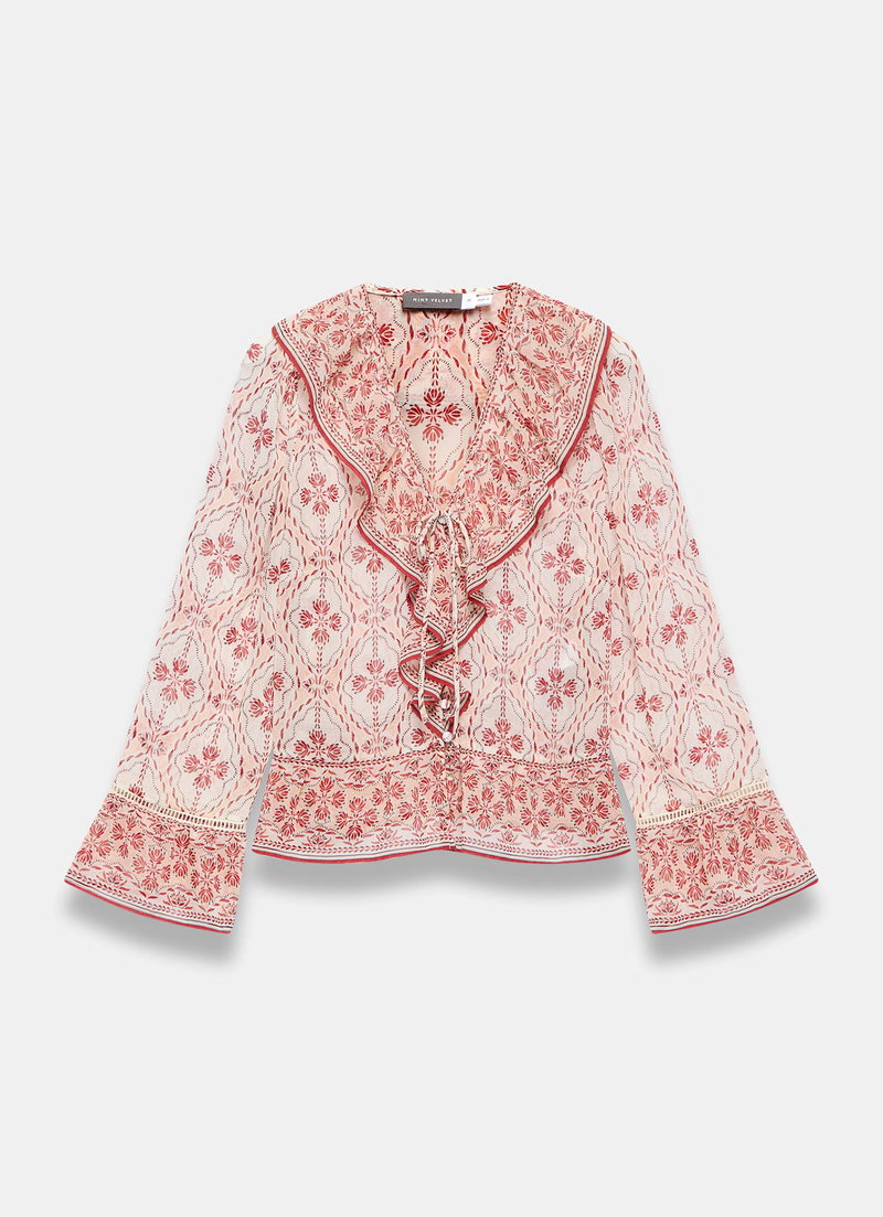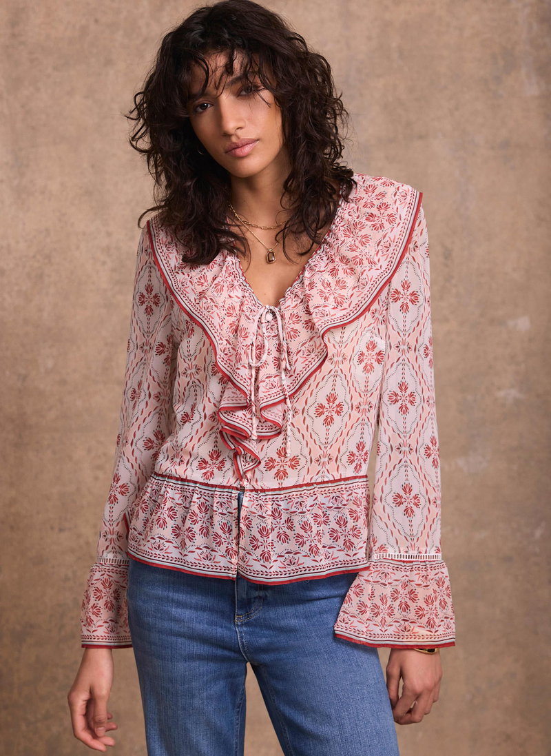 Pink geo print blouse featuring a V-neckline, ruffle trim, long sleeves, open stitch trim with a button and tie fastening through the front.