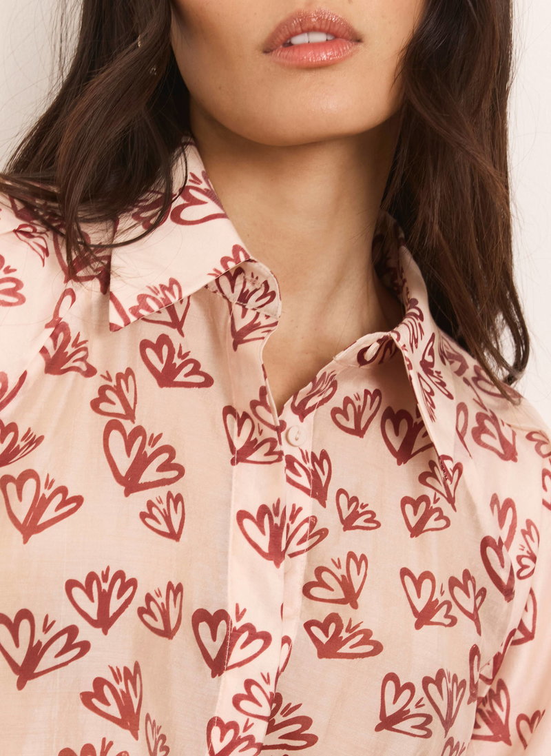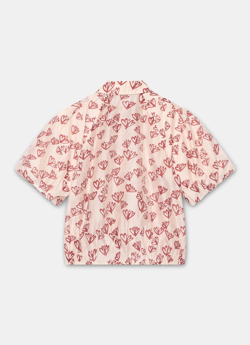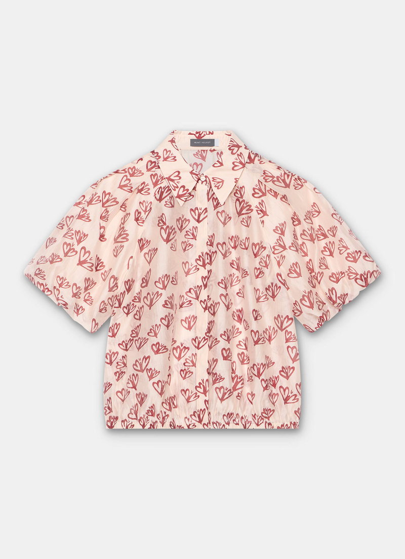 Pink heart print shirt featuring a classic collar, short puff sleeves, elasticated waistband with a concealed button fastening through the front.