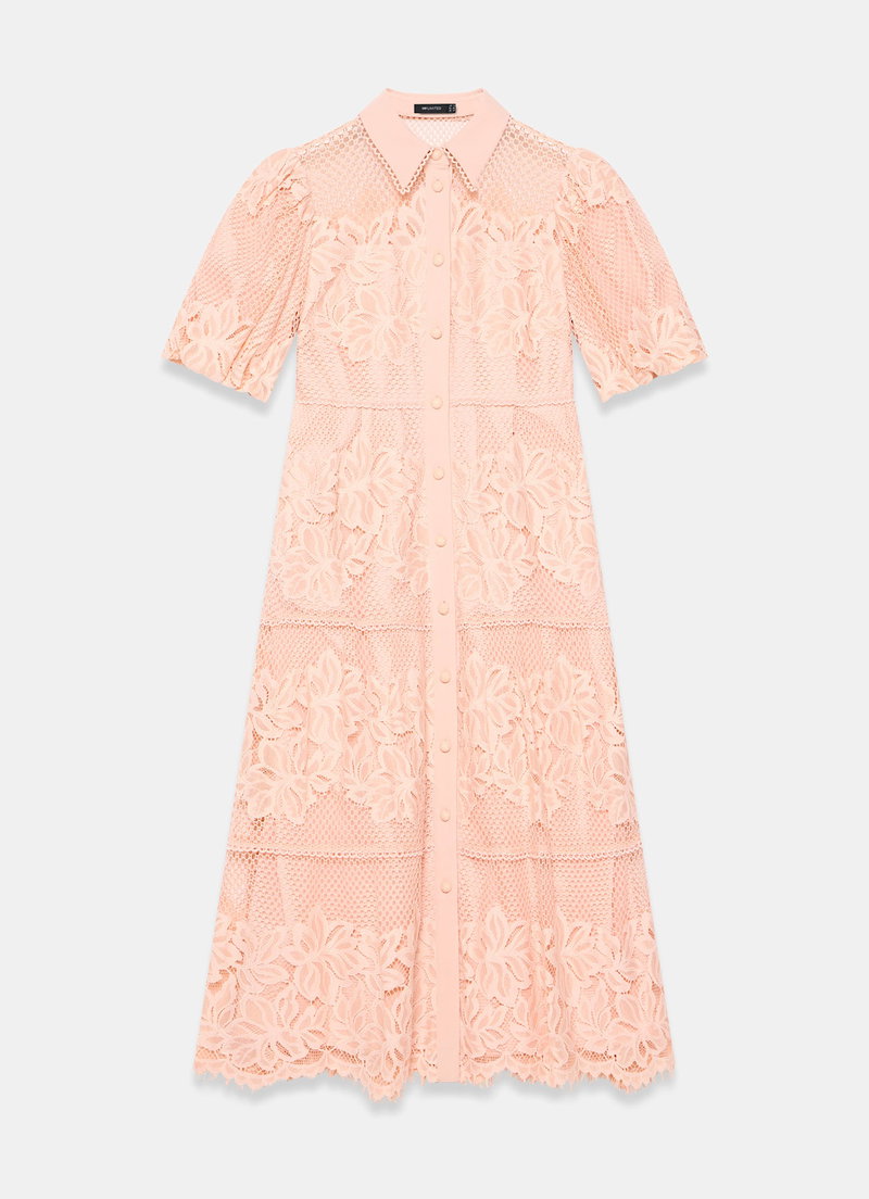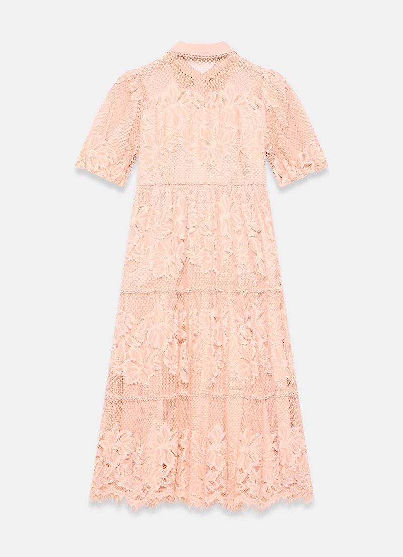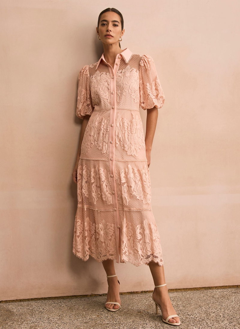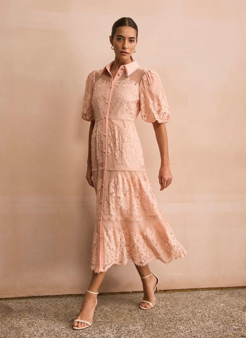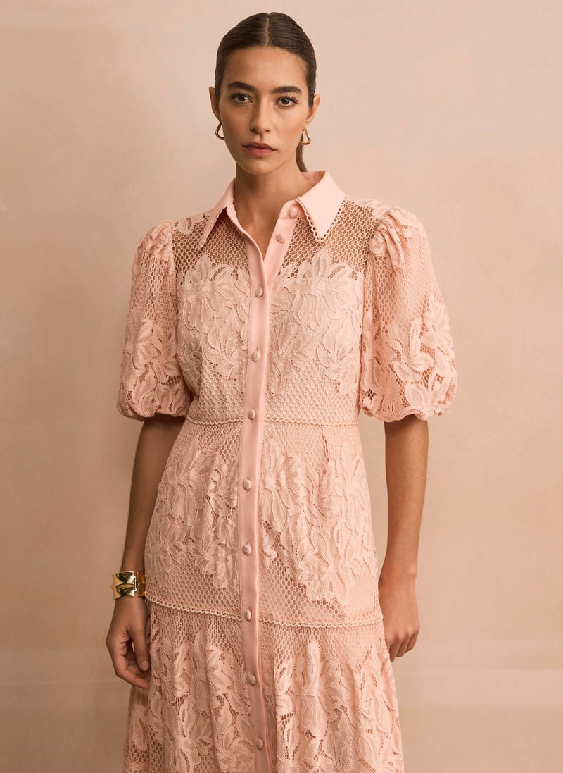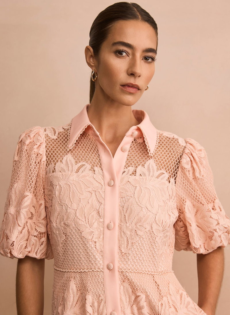 Pink lace shirt dress in a midi silhouette featuring a classic collar, short puff sleeves, open stitch overlay, tiered detail with a button fastening through the front.