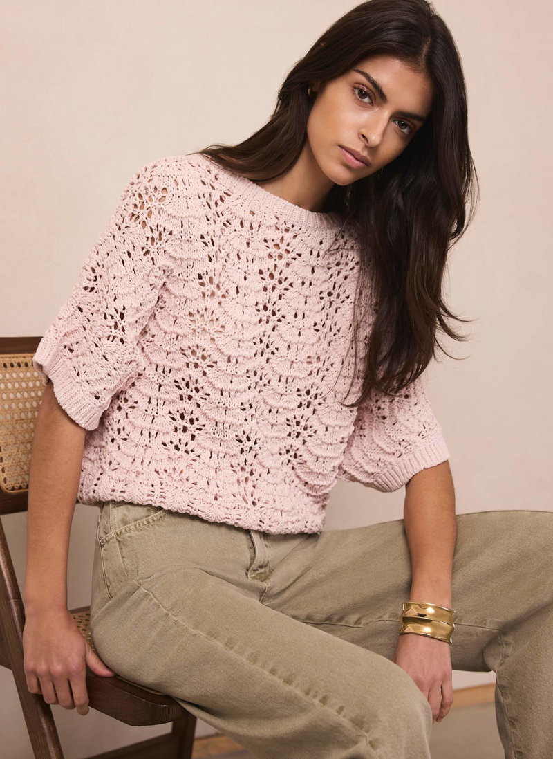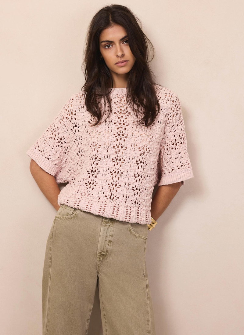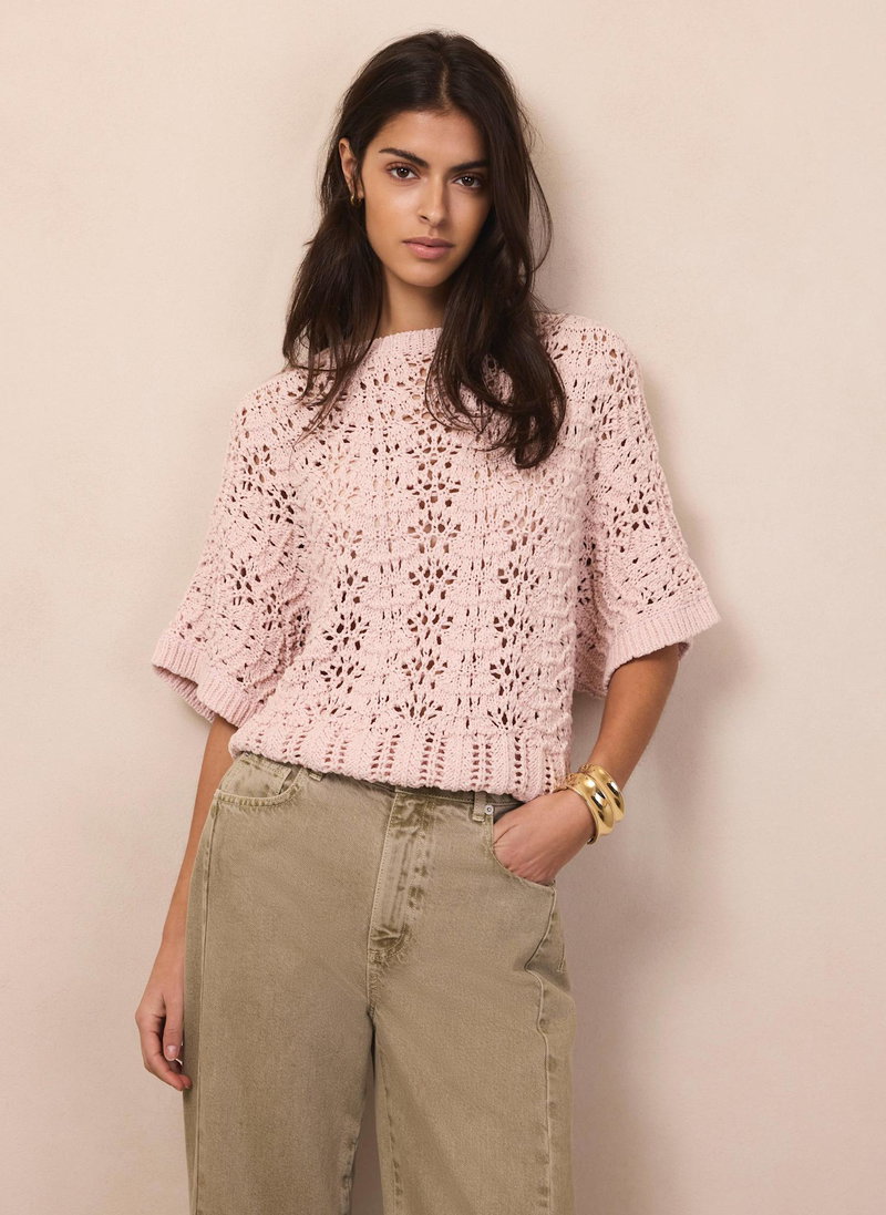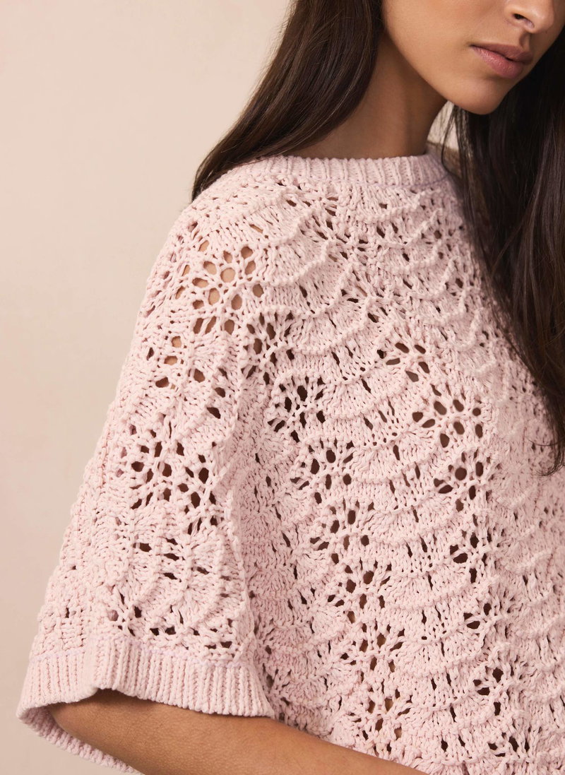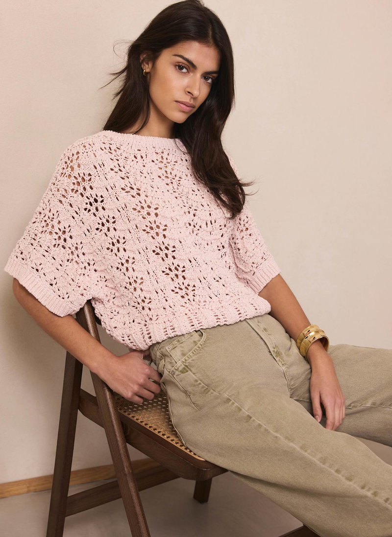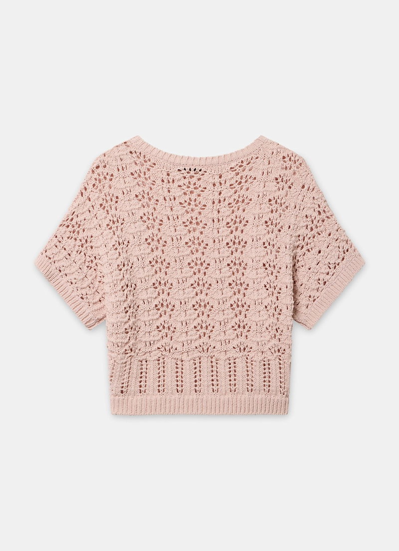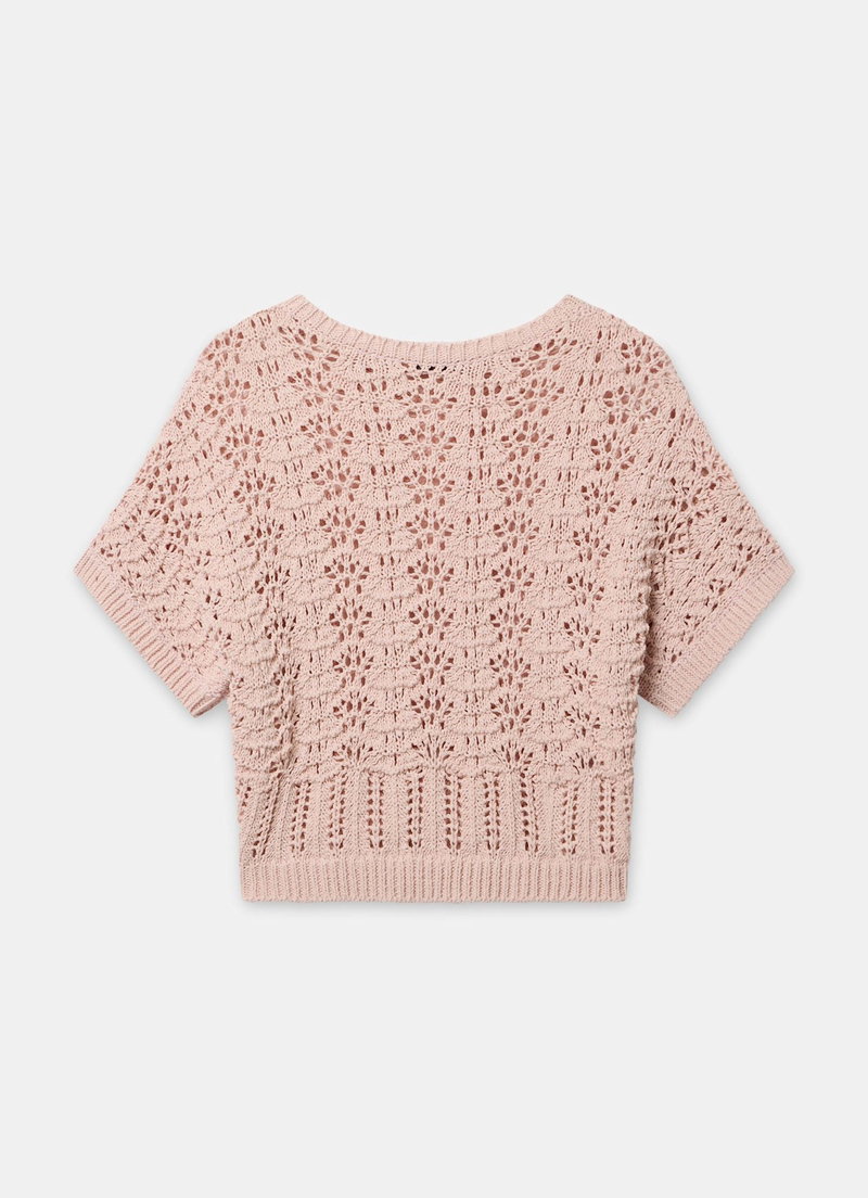 Pale pink tone open stitch top featuring a crew neckline, short sleeves and ribbed trim.