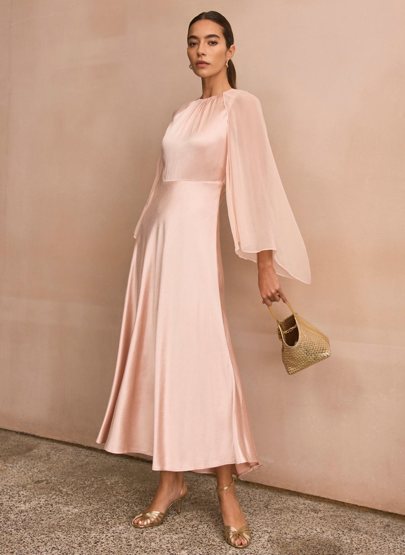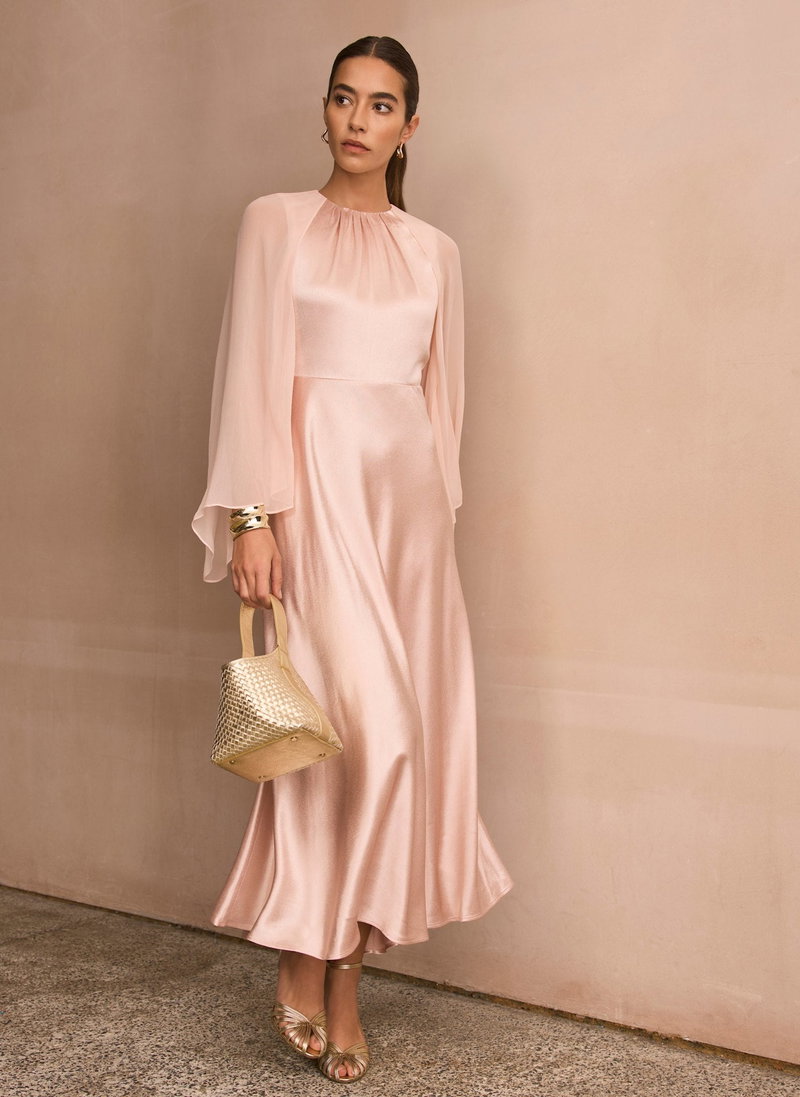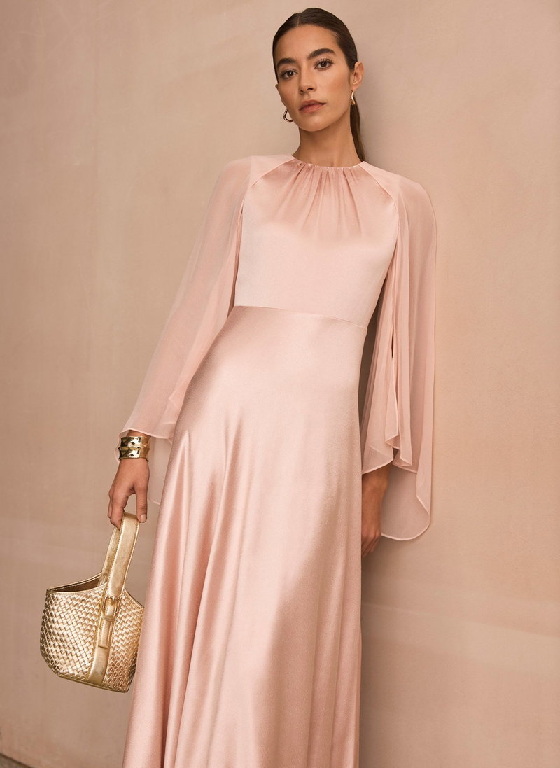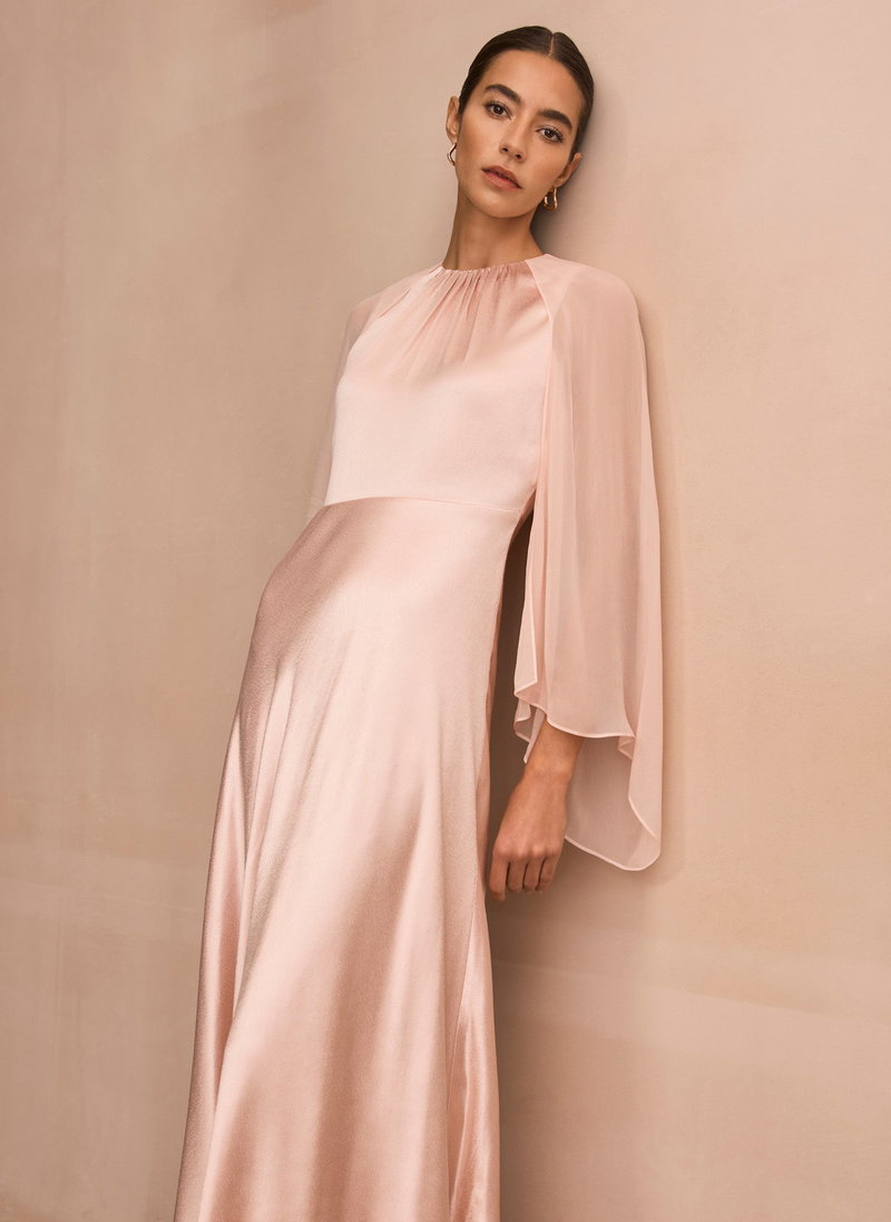 Pale pink satin dress in a maxi silhouette featuring a crew neckline, long cape sleeves, fishtail hemline with a zip fastening through the back.