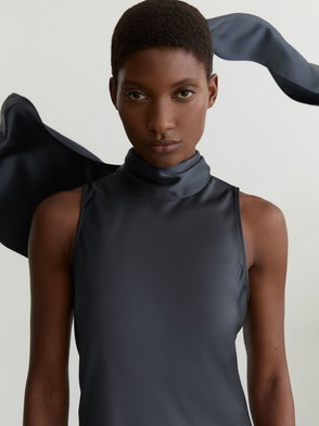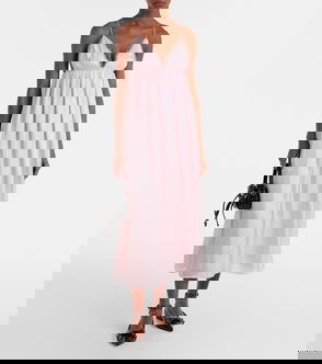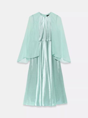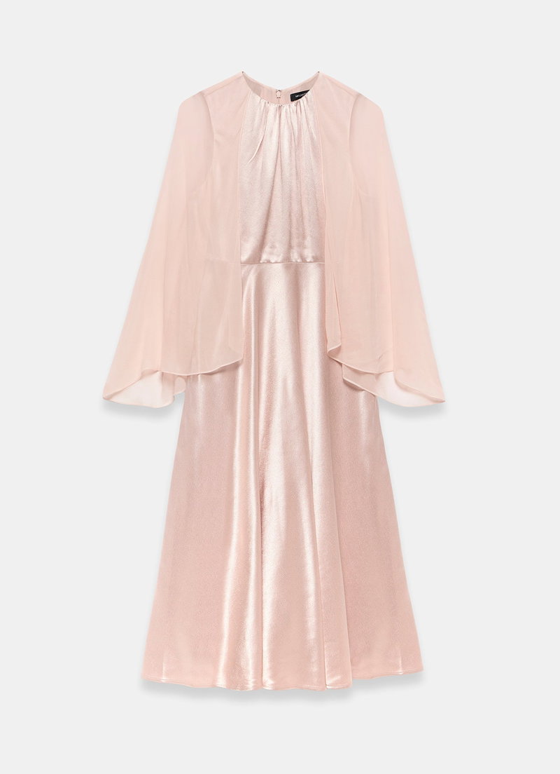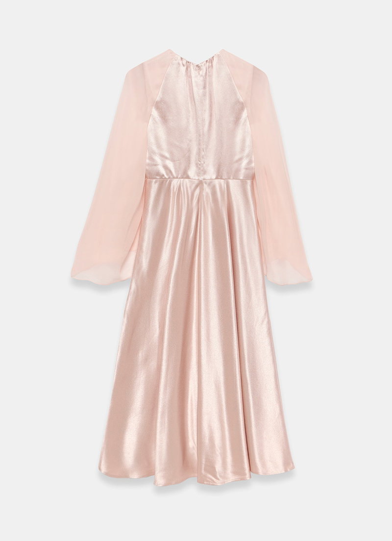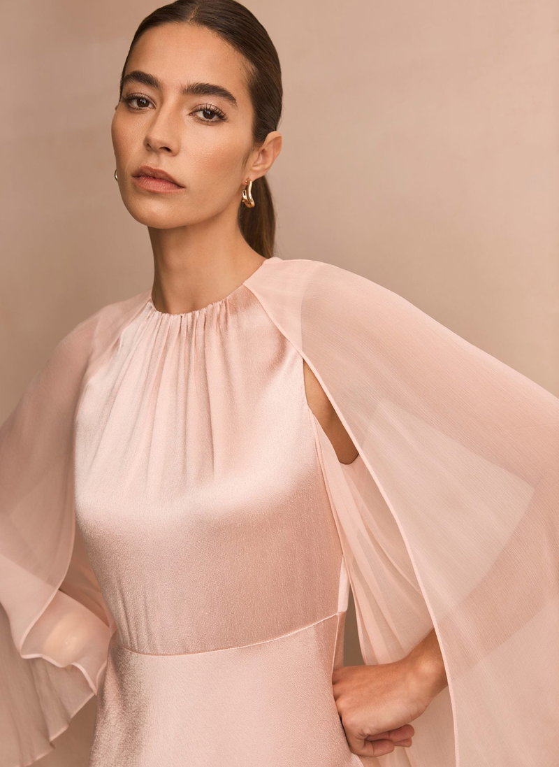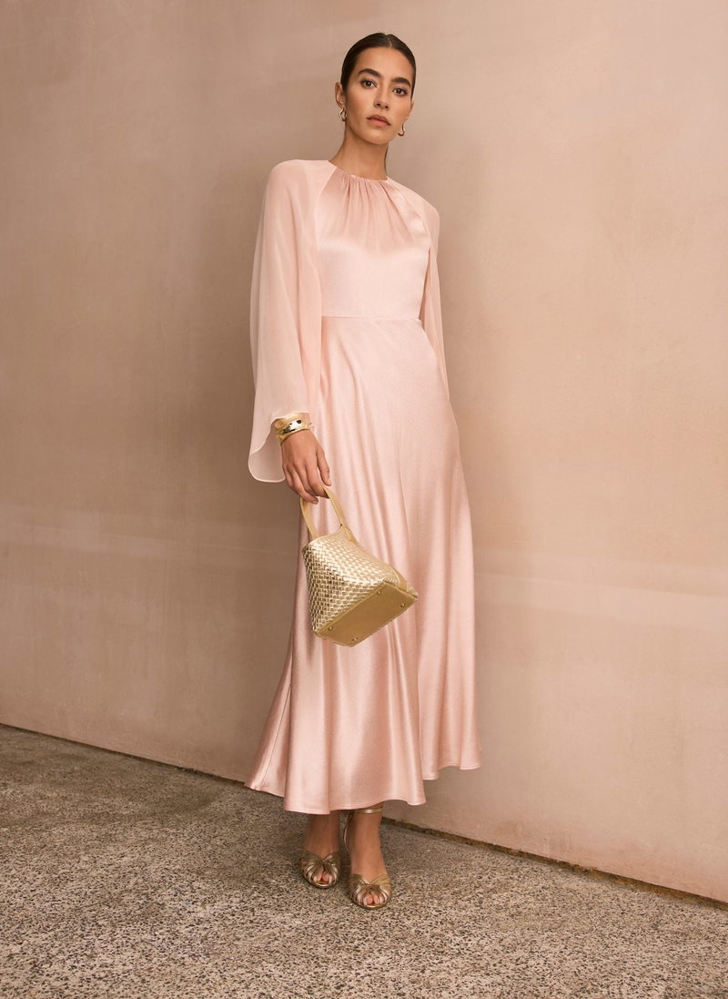 Pale pink satin dress in a maxi silhouette featuring a crew neckline, long cape sleeves, fishtail hemline with a zip fastening through the back.