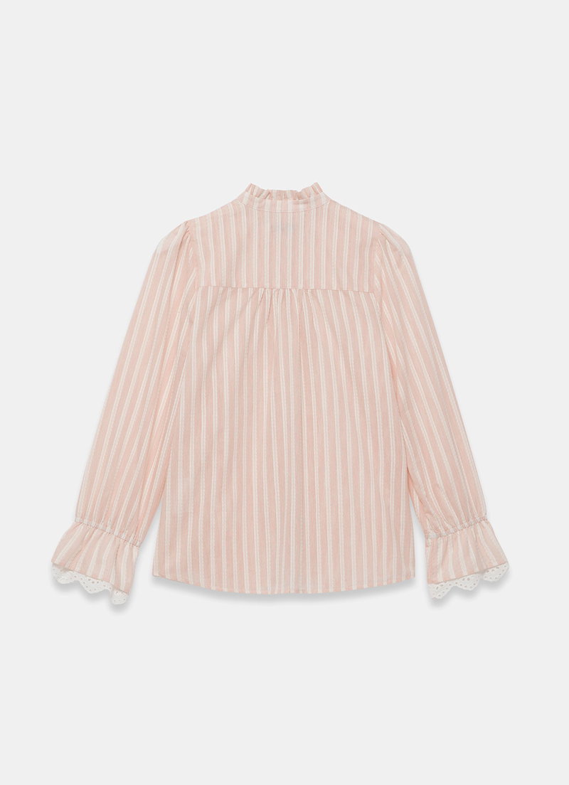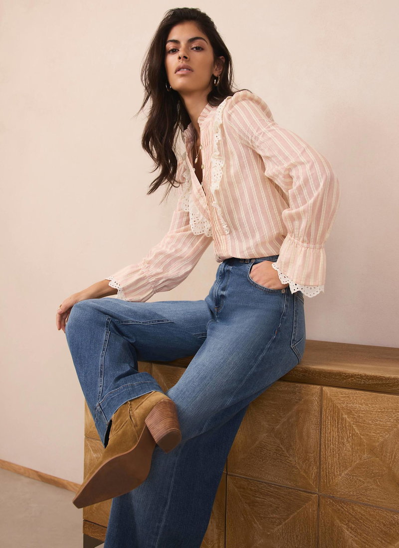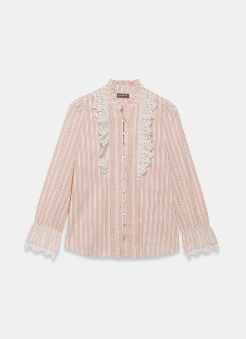 Pink striped blouse featuring a high ruffle neckline, long sleeves, fluted cuffs, broderié detail trim with a button fastening through the front.