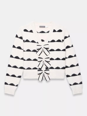 A cardigan featuring a crew neckline, long sleeves, square pockets, ribbed trim with a button fastening through the front.