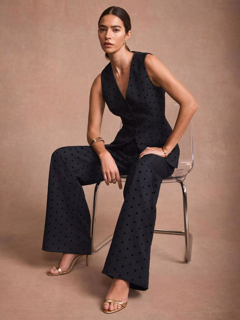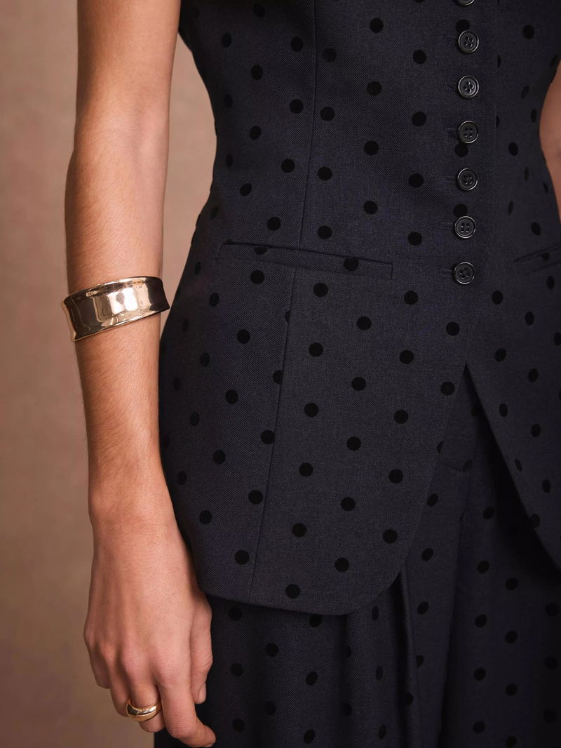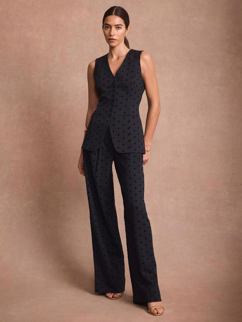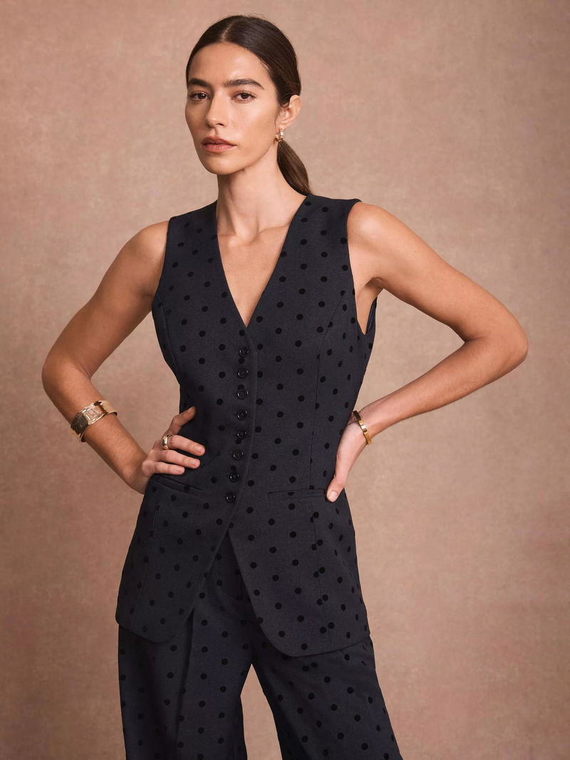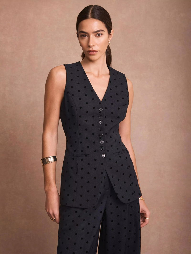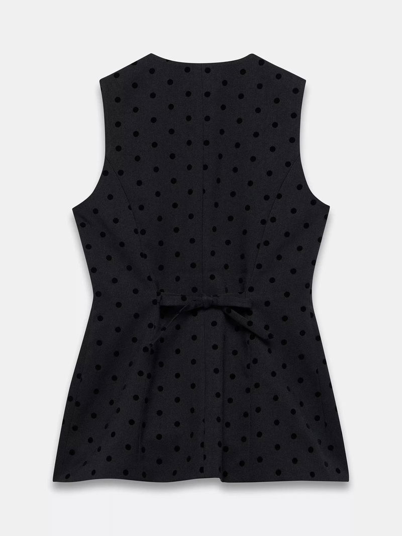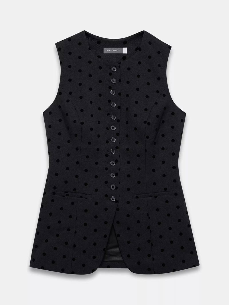 A polka dot waistcoat in a longline silhouette featuring a crew neckline, shaped waist, welt pockets, split front, tie back and button fastening through the front.