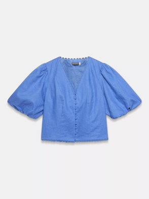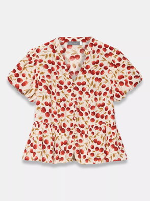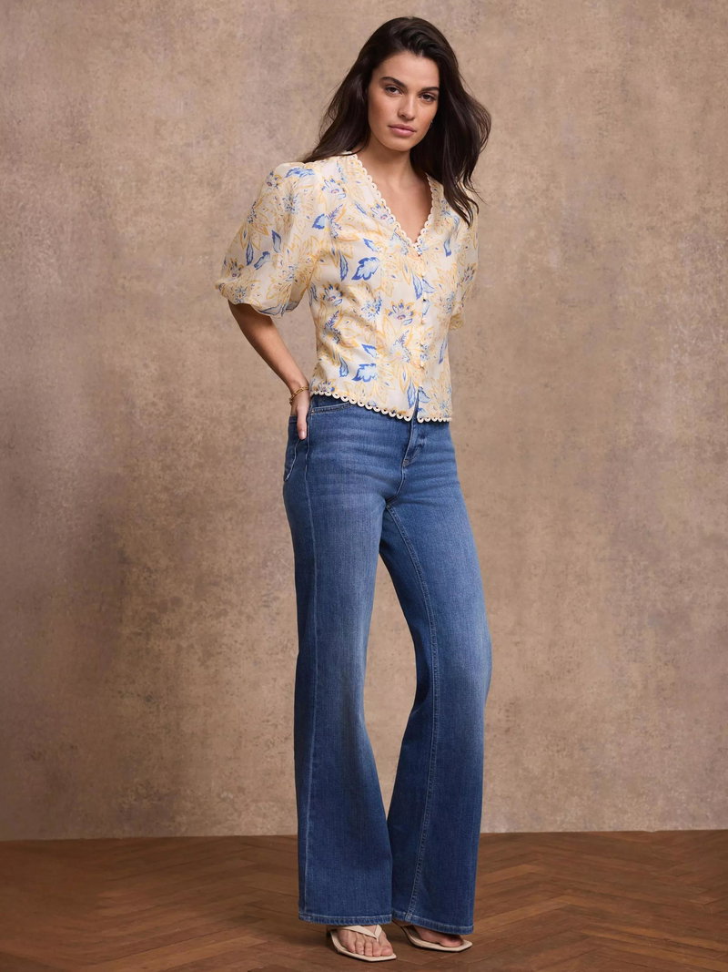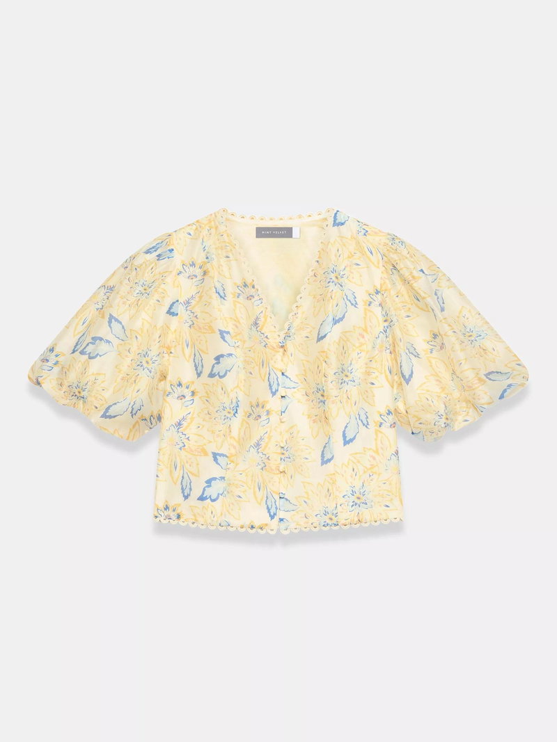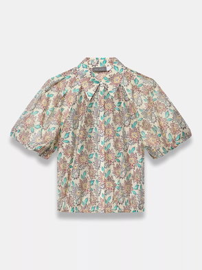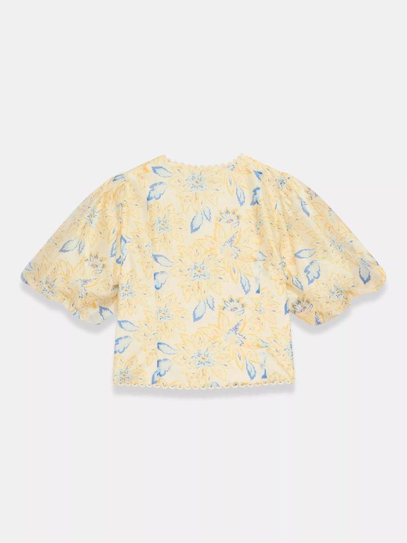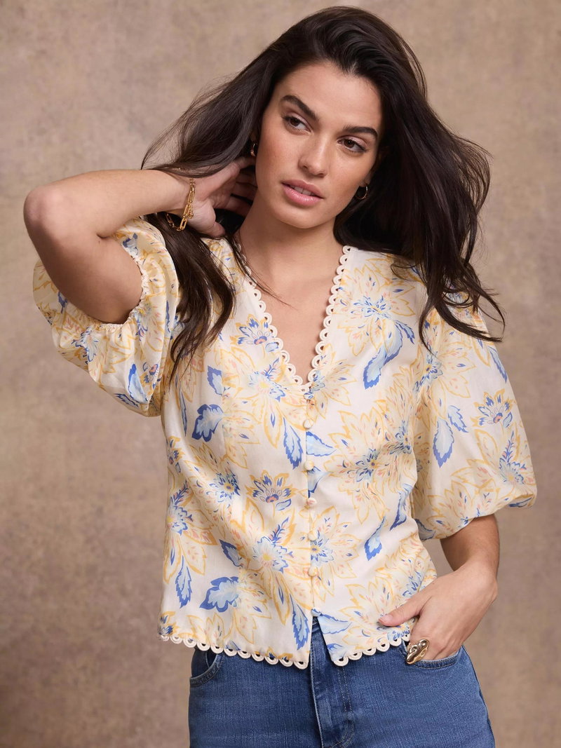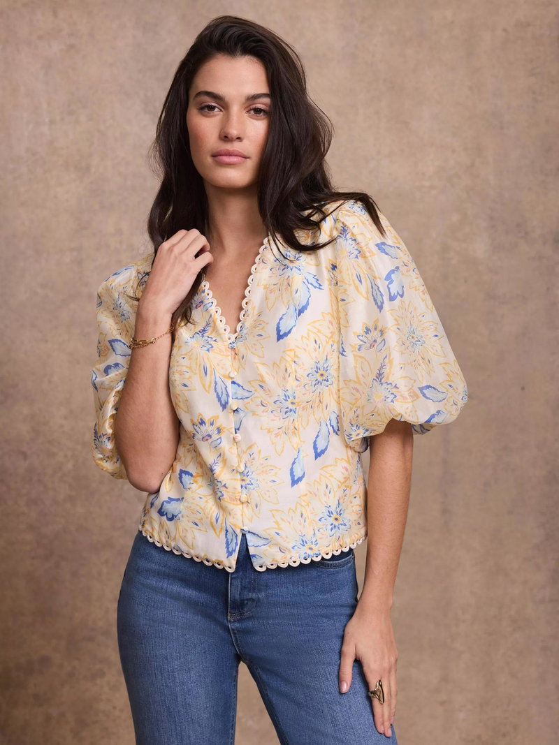A floral blouse in a fluid lyocell blend, designed with a softly structured silhouette and puffed elbow sleeves. Finished with a V-neck and cotton scallop trims, it brings a thoughtful freshness to your summer or daywear line-up.