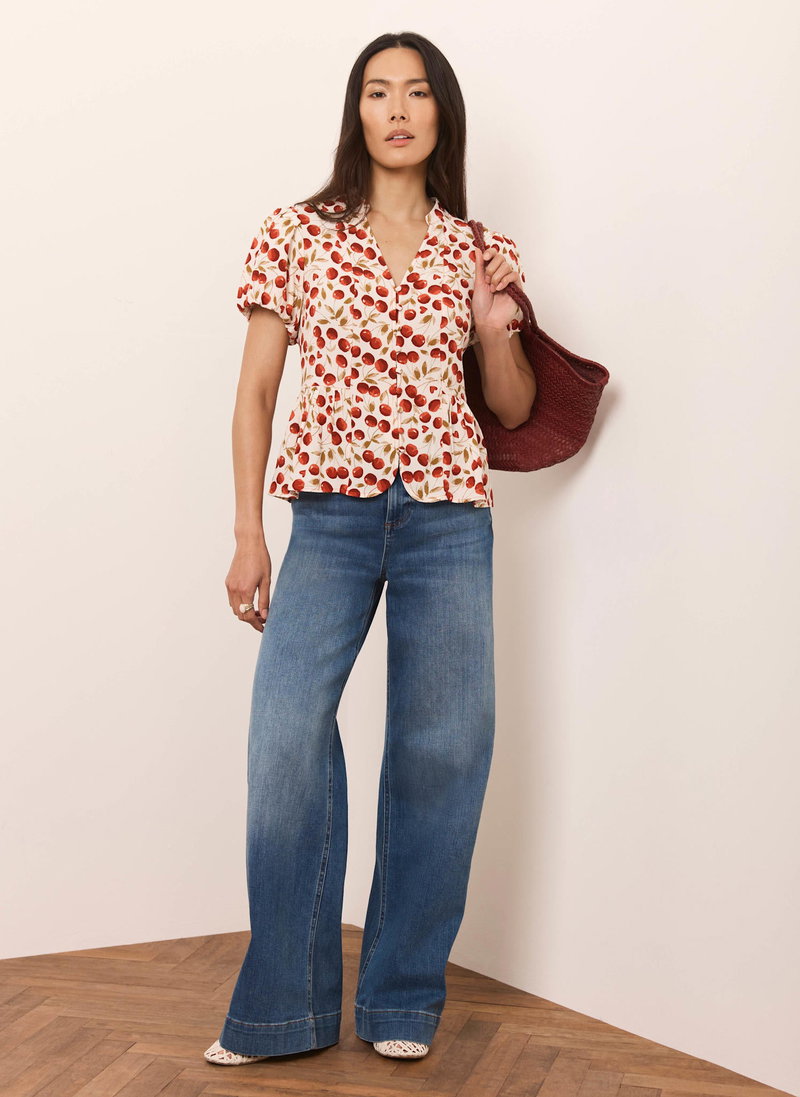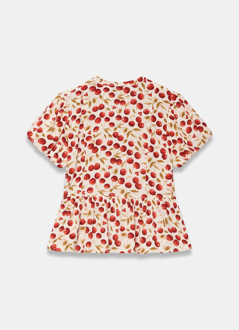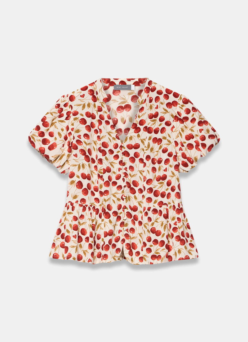 Red cherry print top featuring a V-neckline, short puff sleeves, peplum hemline and button fastening through the front.