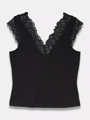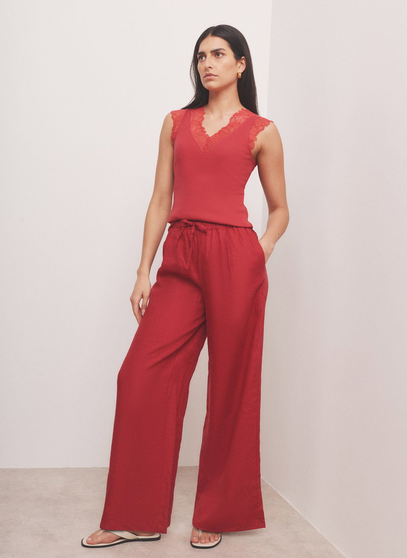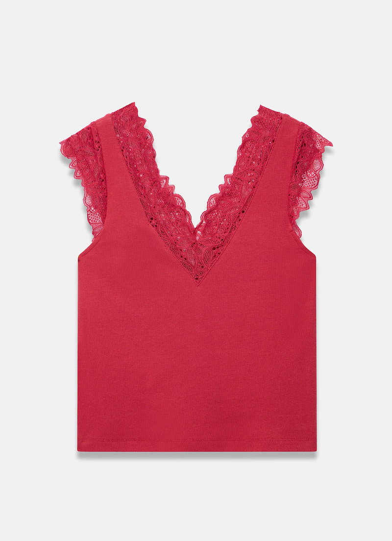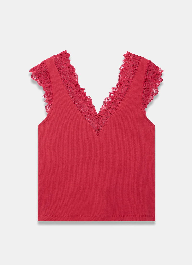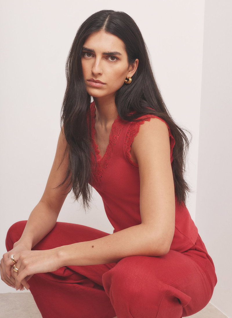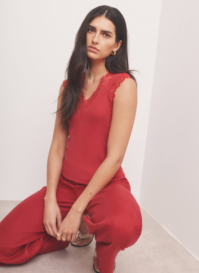 Red sleeveless top featuring a V-neckline and lace trim detailing.