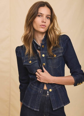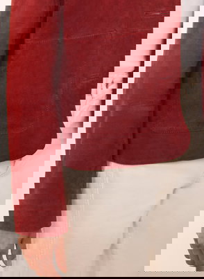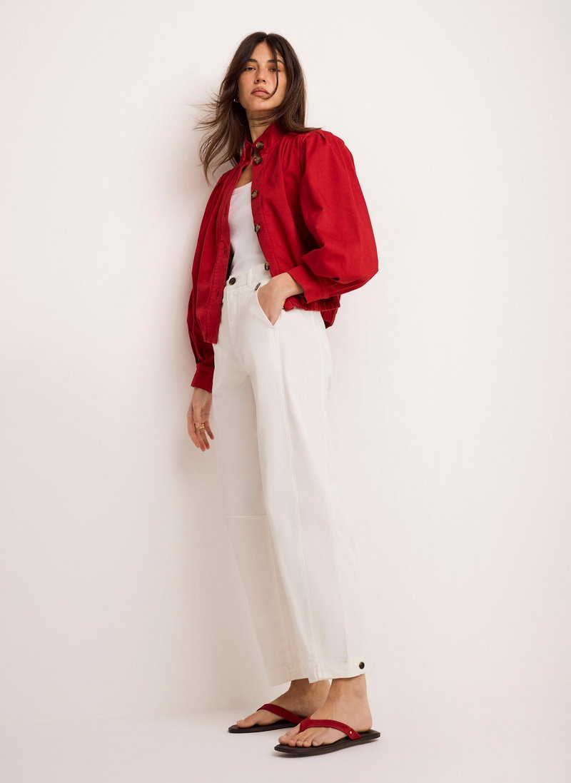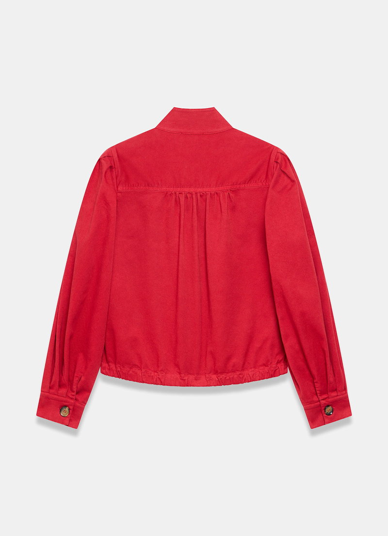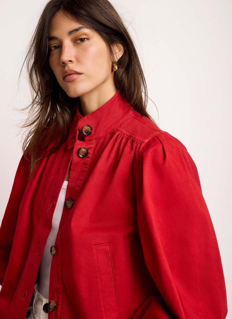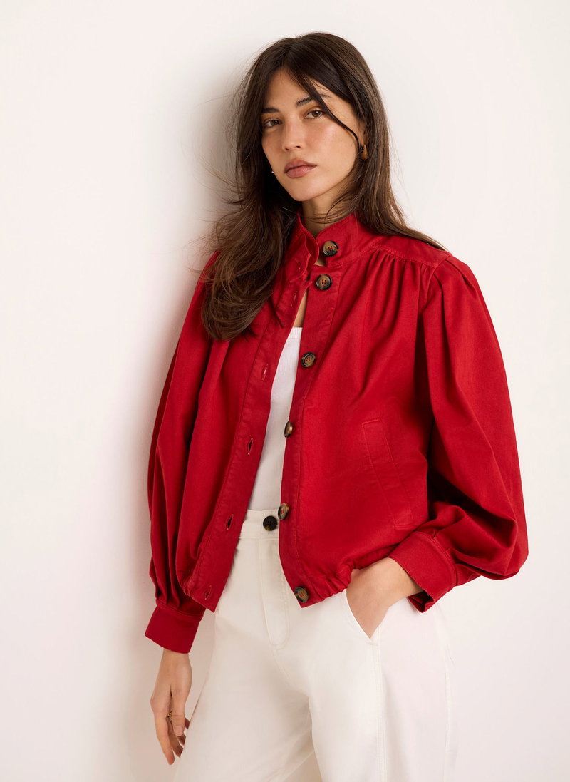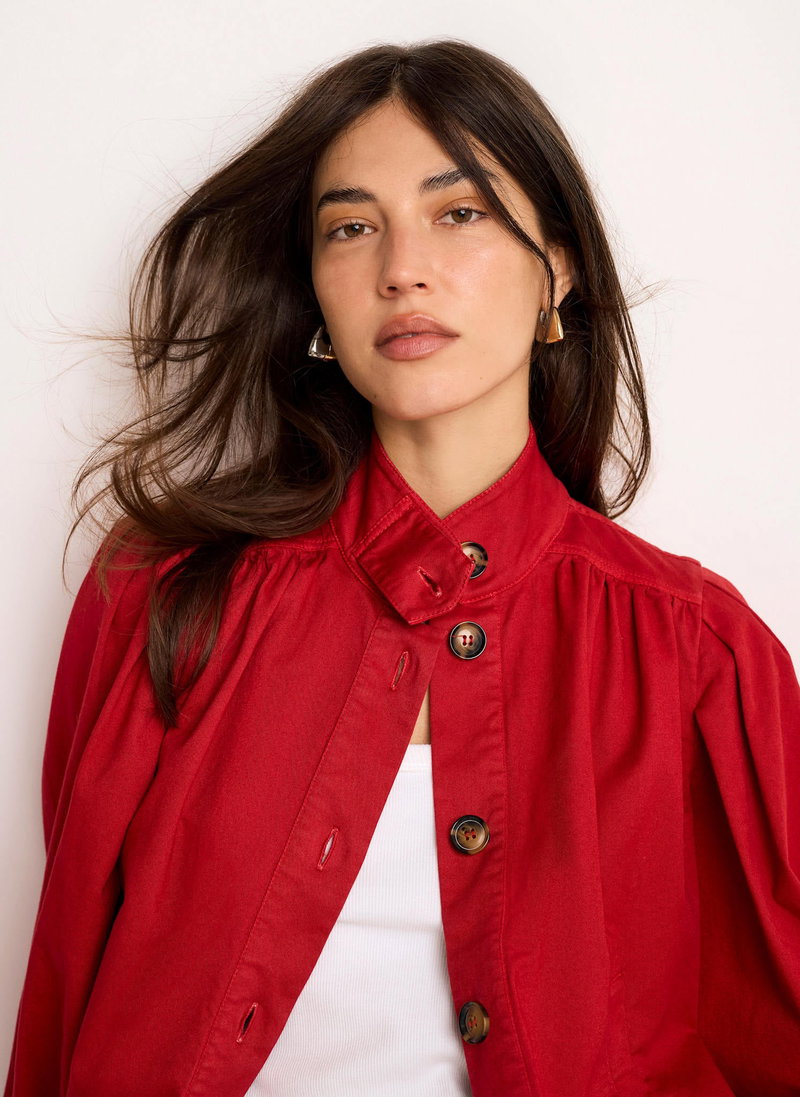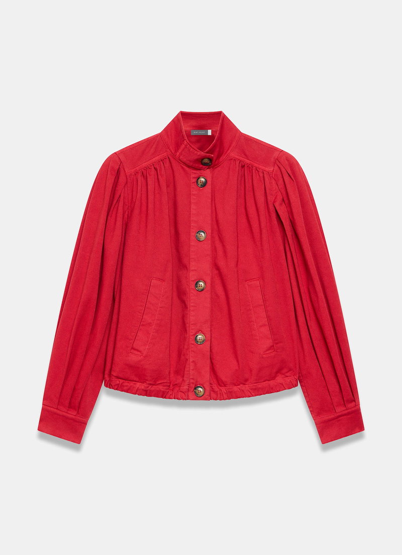 Red tone jacket featuring a high neckline, puff shoulders, long sleeves, buttoned cuffs, welt pockets, elasticated waistband with a button fastening through the front.