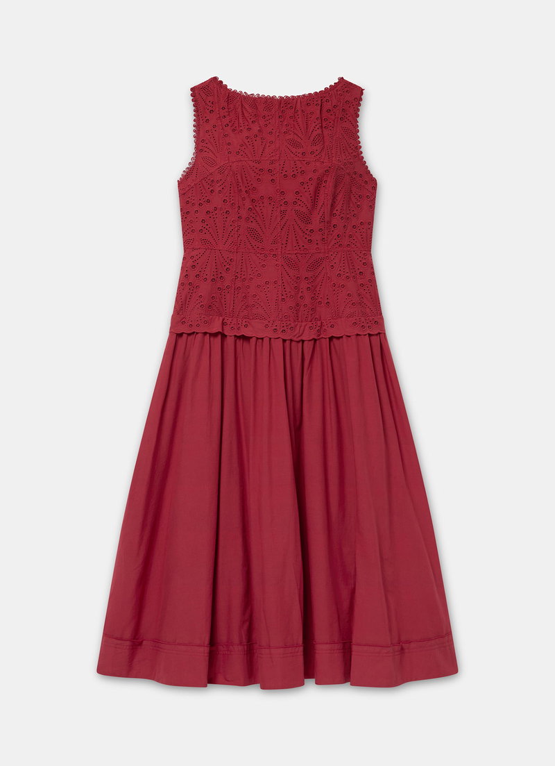 Red broderié sleeveless dress featuring a crew neckline, dropped waistband, scallop trim, shirred back with a button fastening through the back.