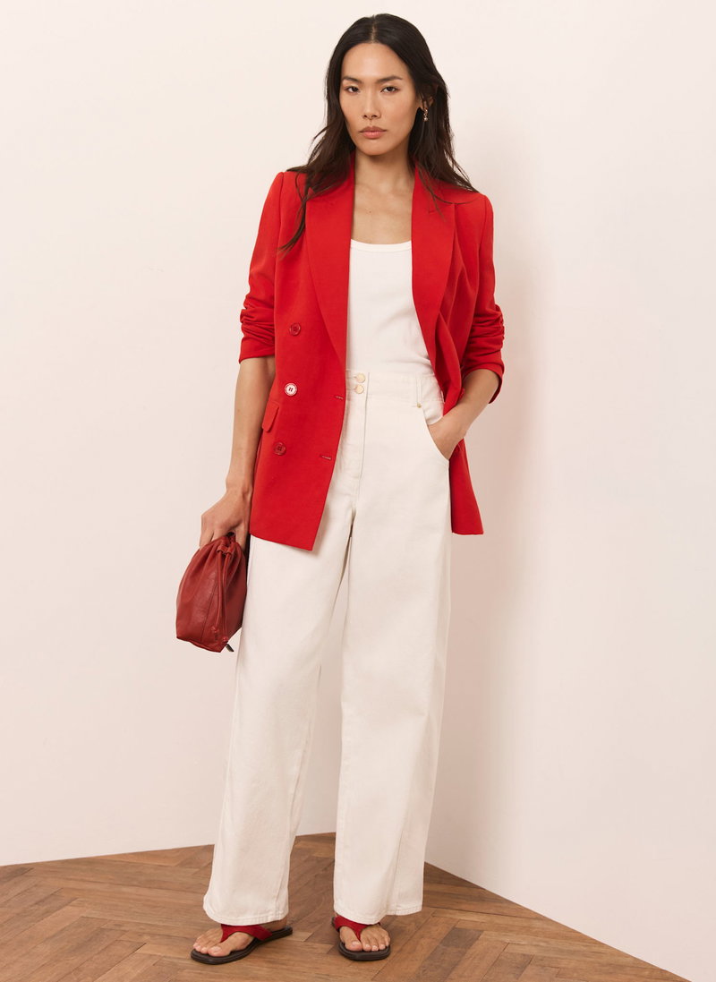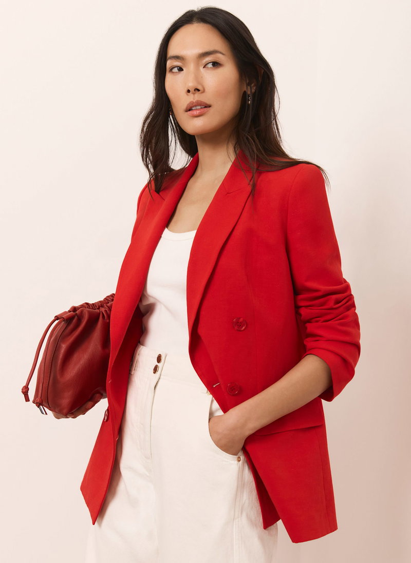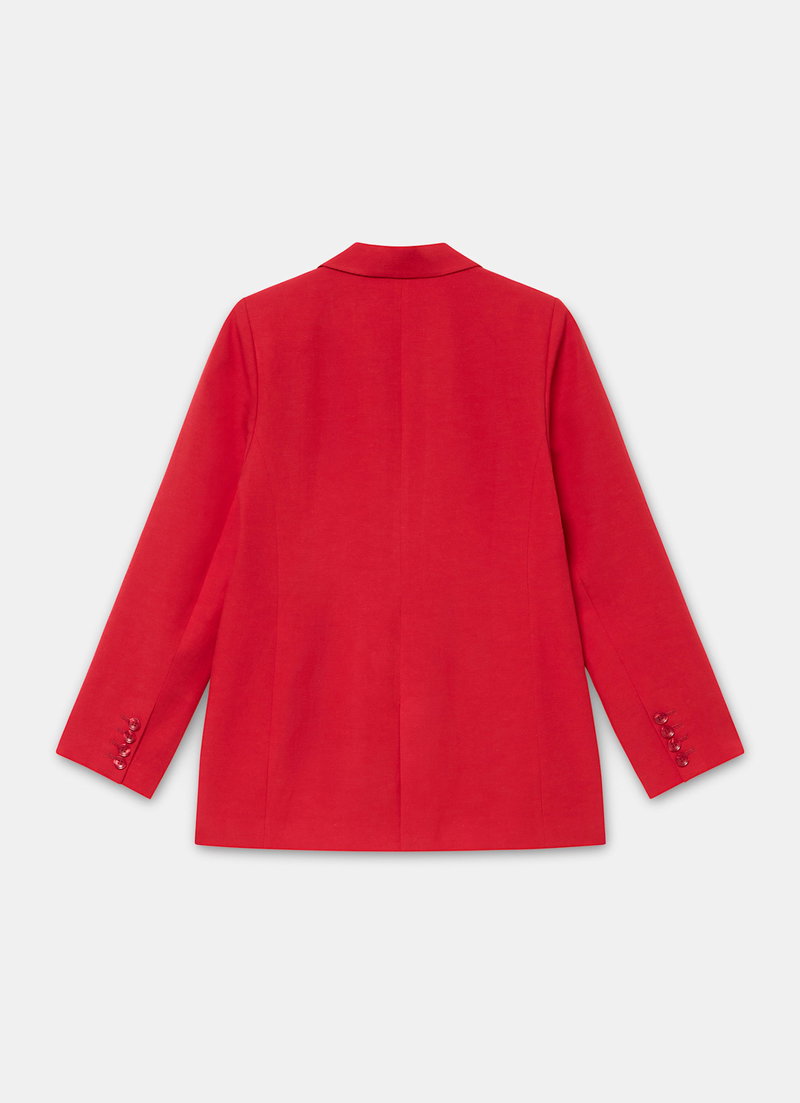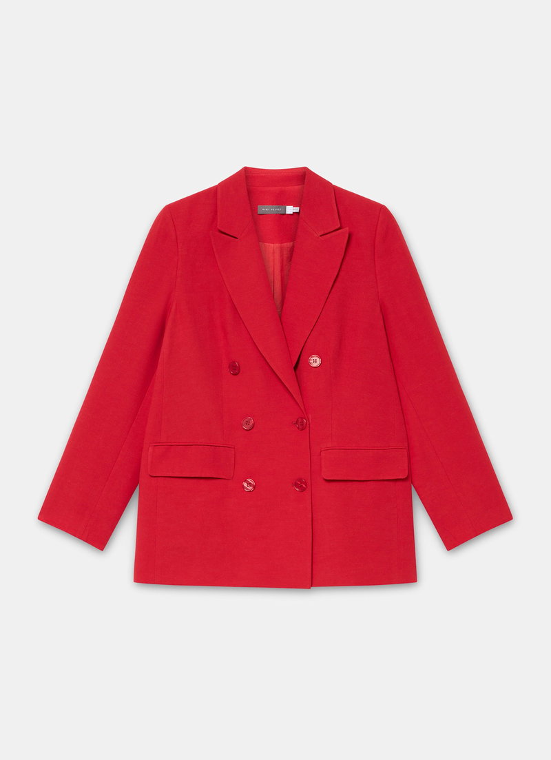 Red tone blazer in a double breasted silhouette featuring peaked lapels, long sleeves, buttoned cuffs, flap pockets with a button fastening through the front. Fully lined.