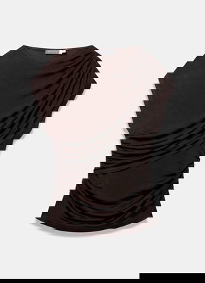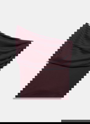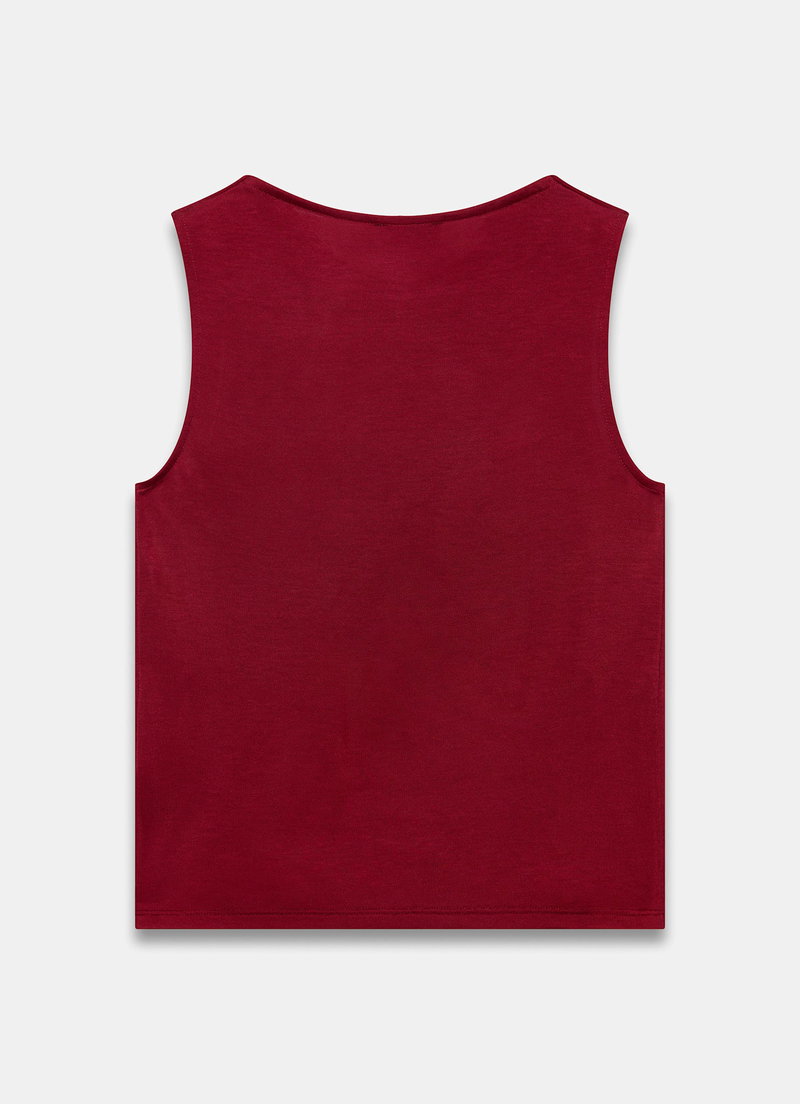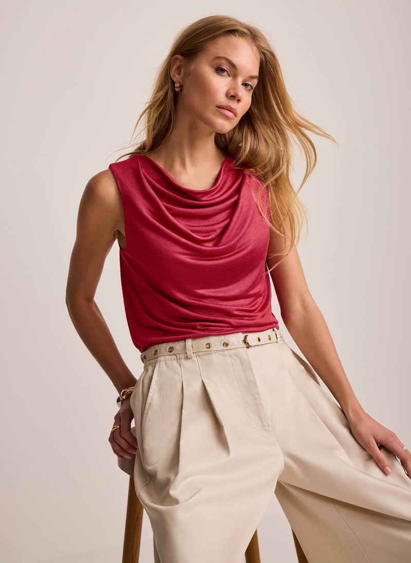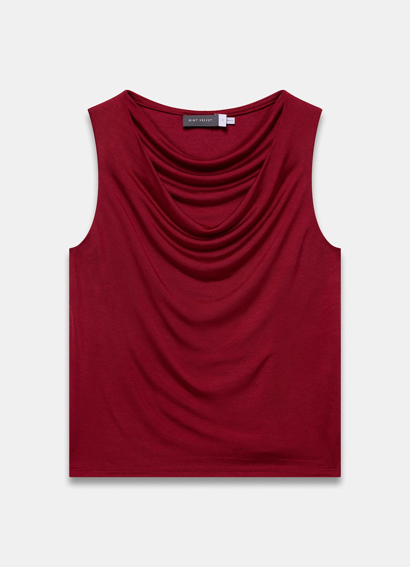 Red sleeveless top featuring a cowl neckline with draped detailing.