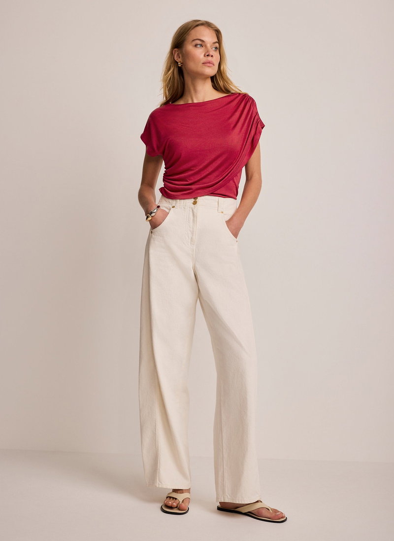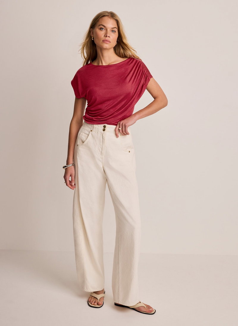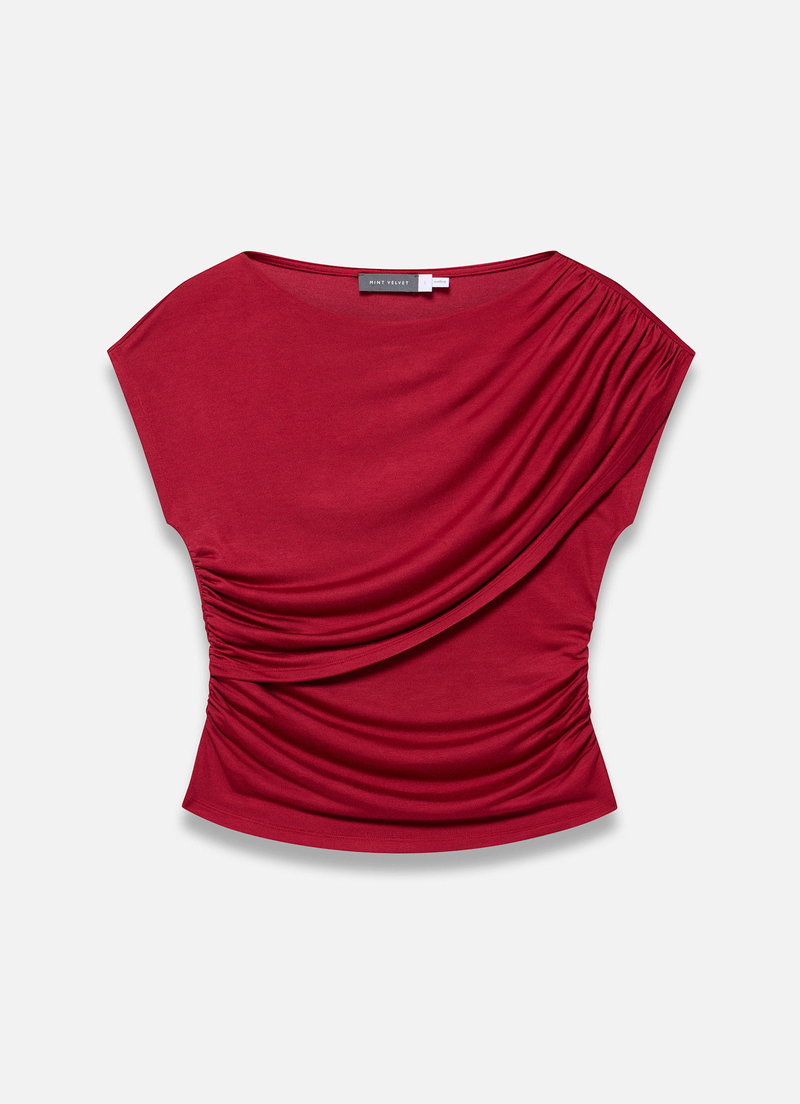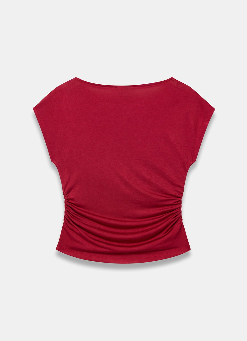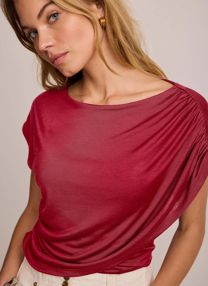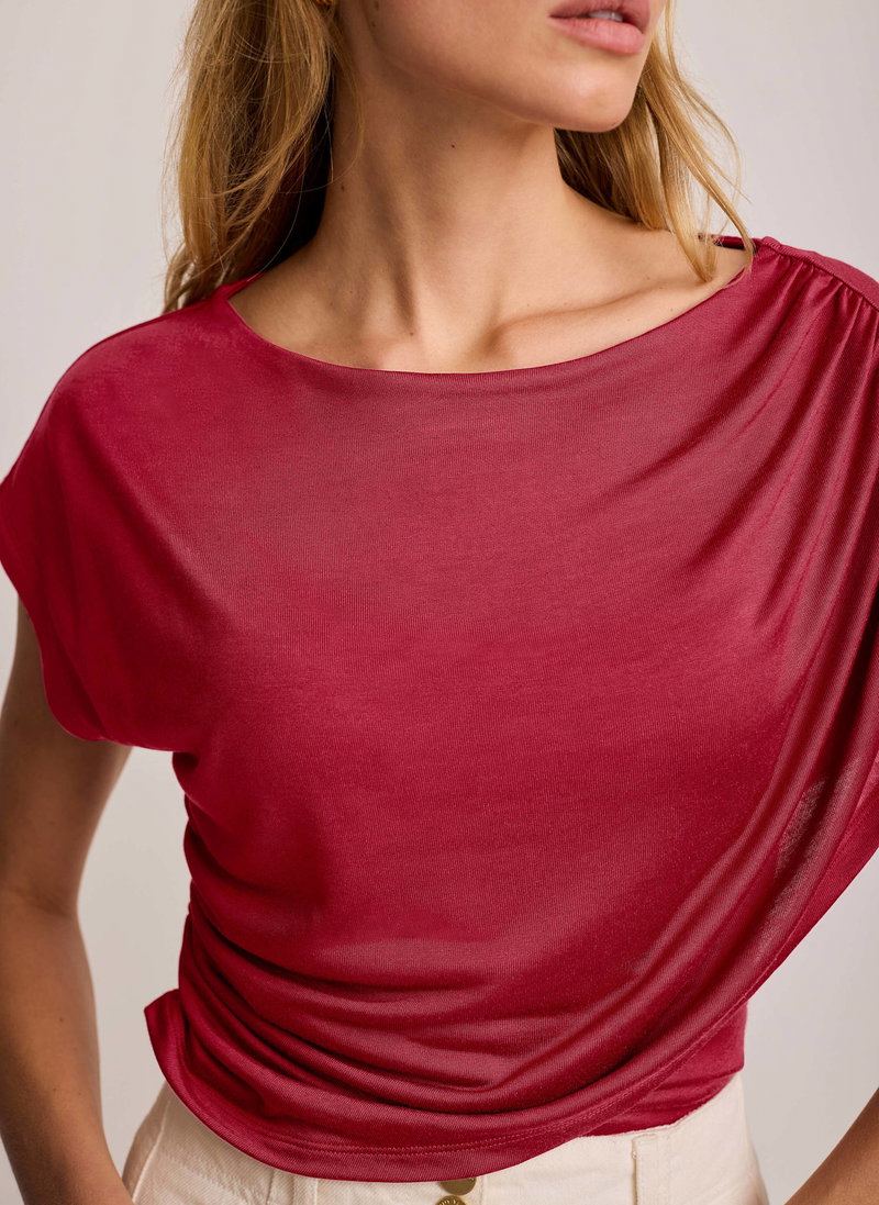 Red ruched top featuring a slash neckline, short sleeves and draped detailing.
