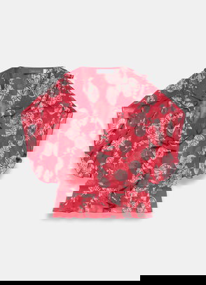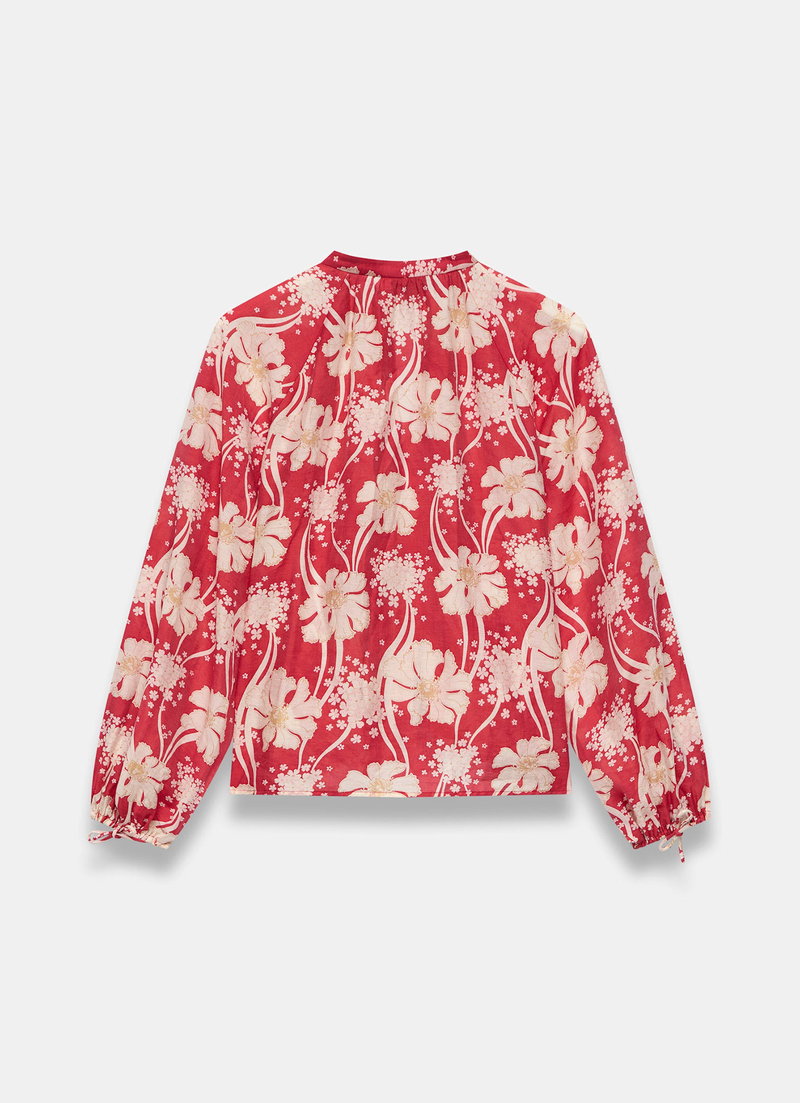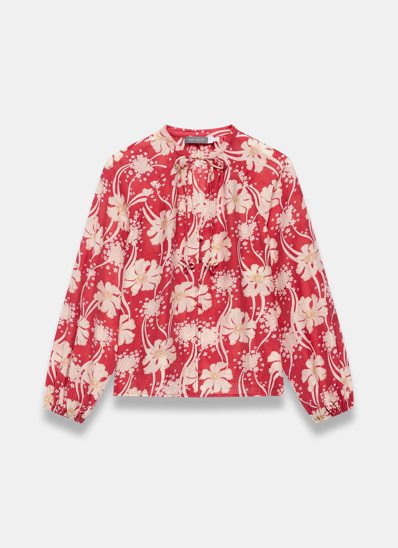 Red floral print blouse featuring a crew neckline, long blouson sleeves, elasticated cuffs with a button and tie fastening through the front.