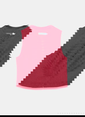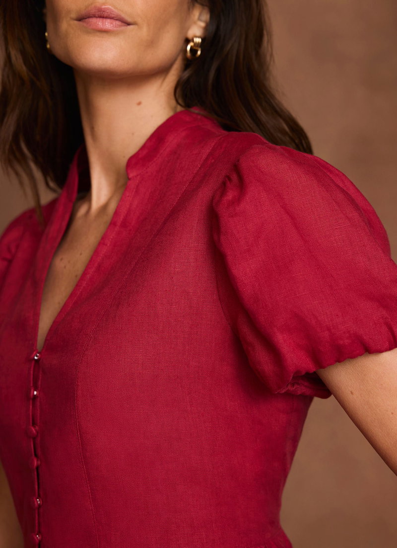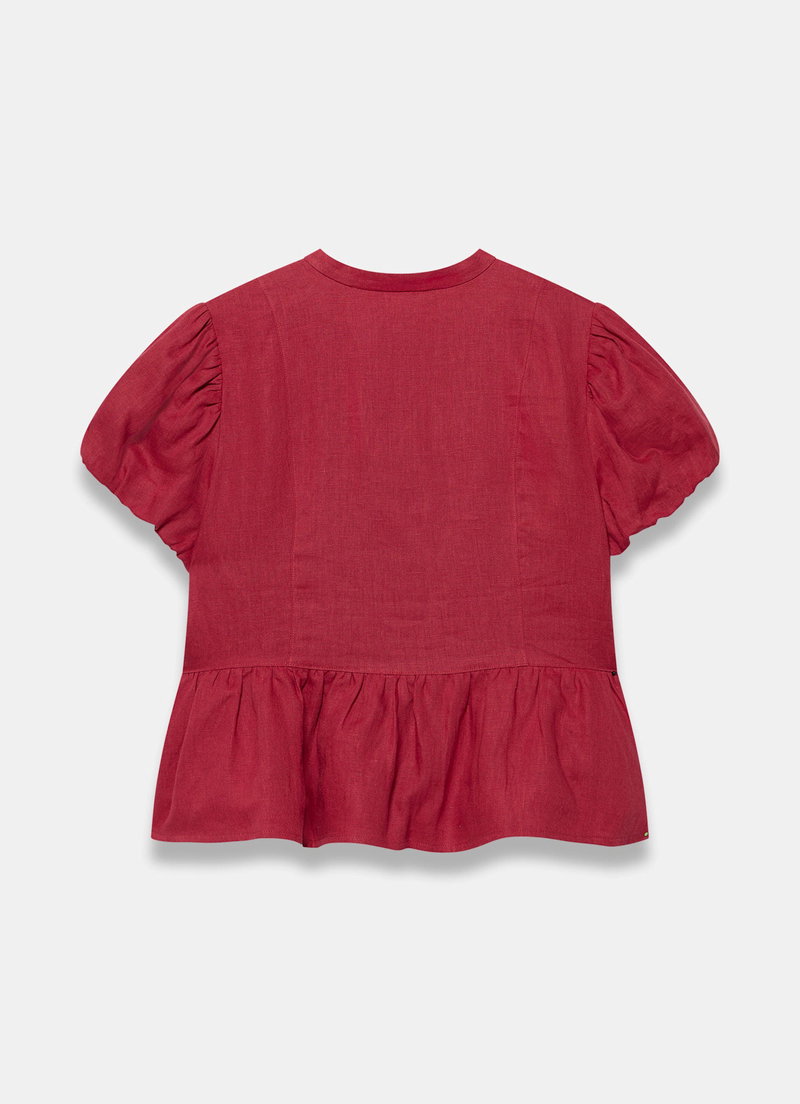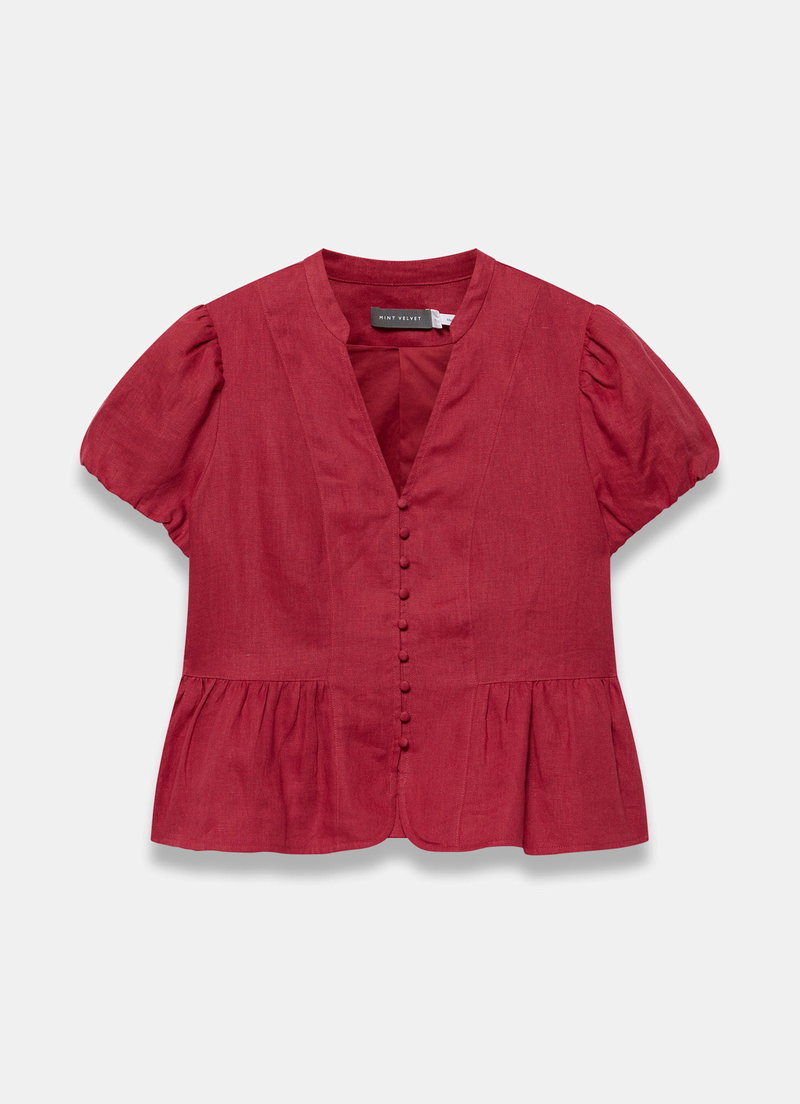 Red top featuring a V-neckline, short puff sleeves, peplum hemline with a button fastening through the front.