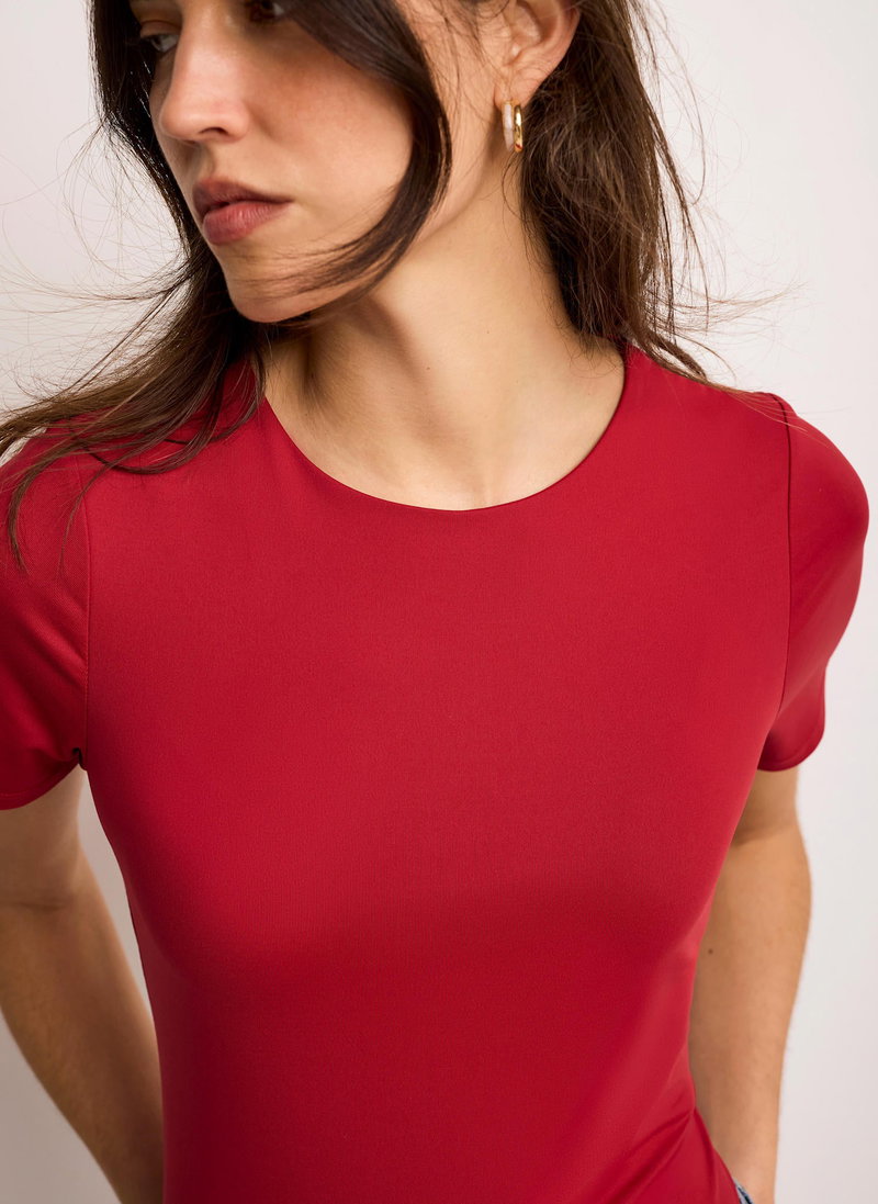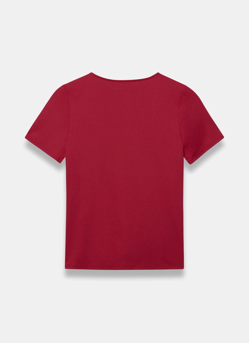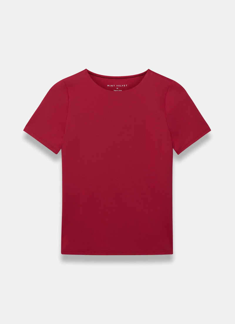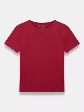Red tone top featuring a crew neckline and short sleeves.