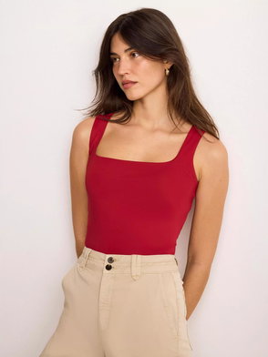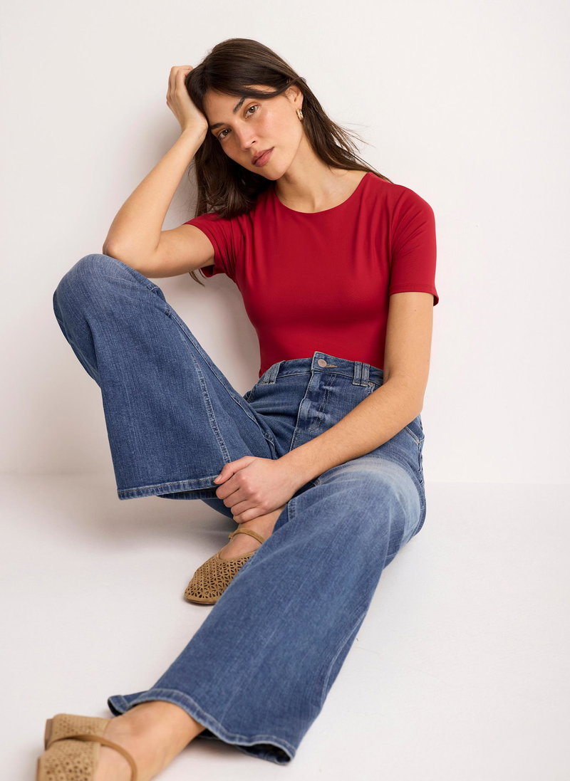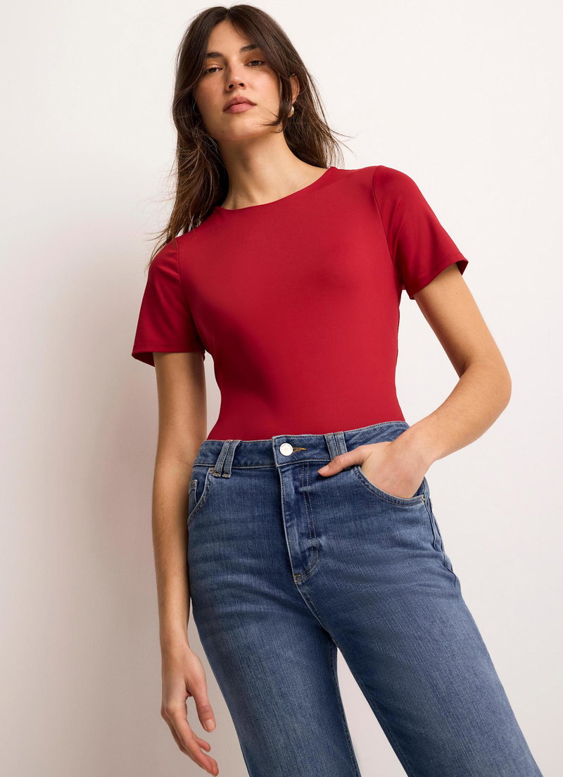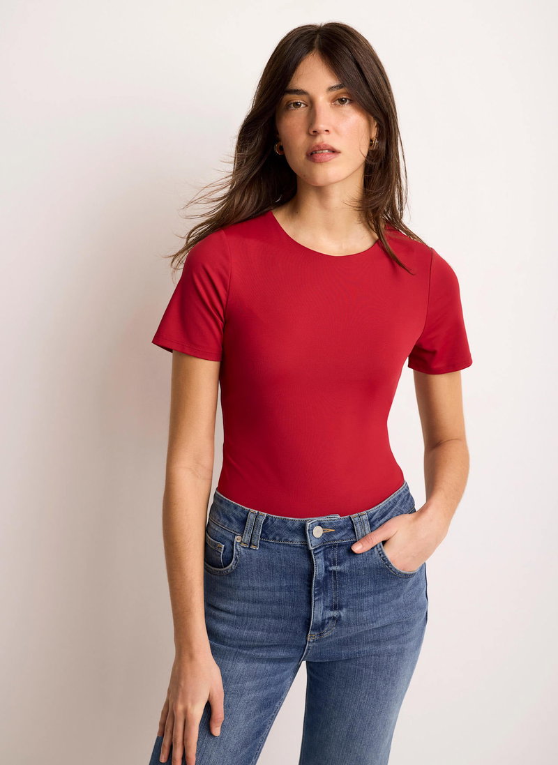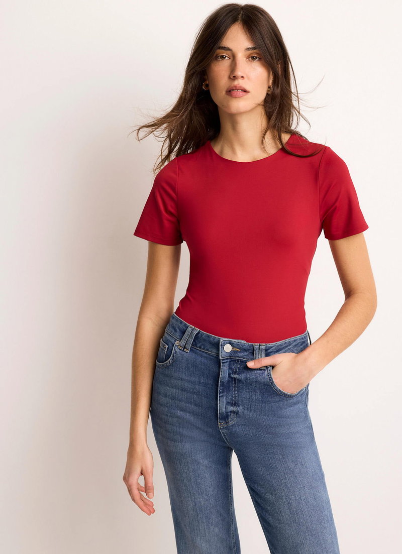 Red tone top featuring a crew neckline and short sleeves.