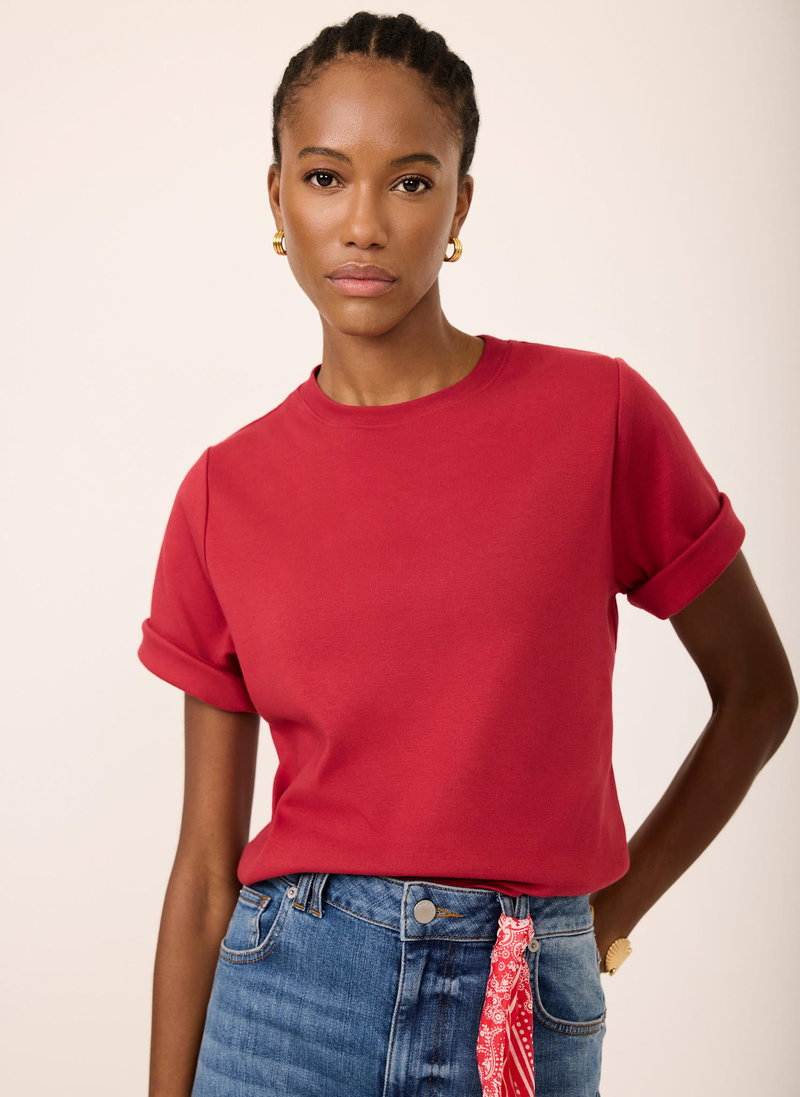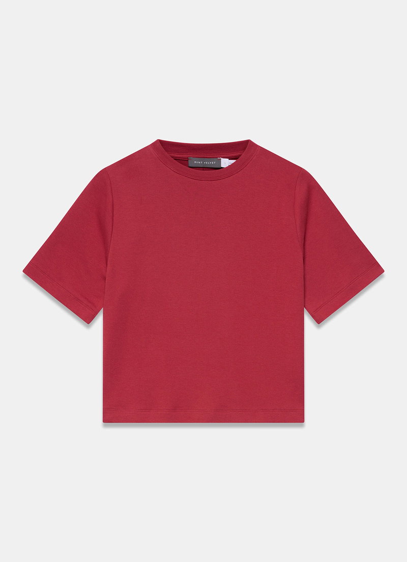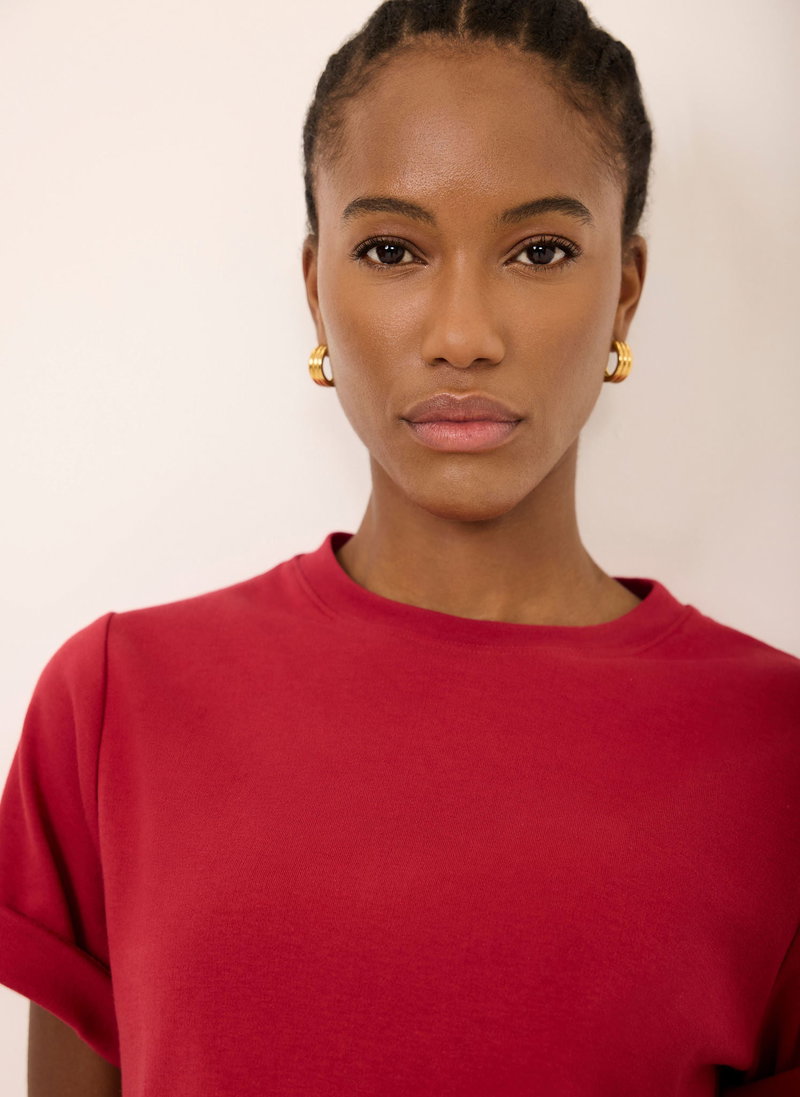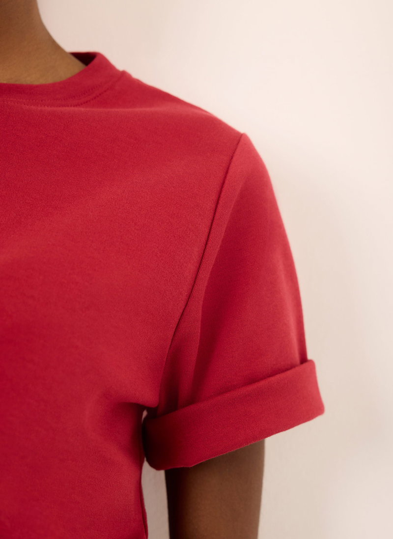 Red tone t-shirt featuring a crew neckline and short sleeves.