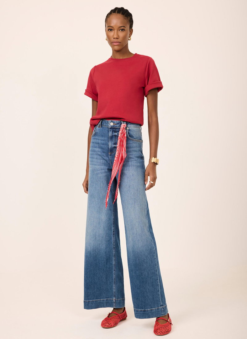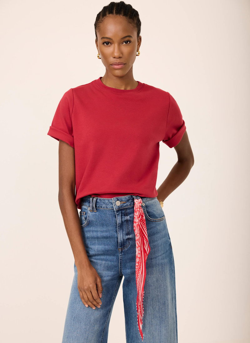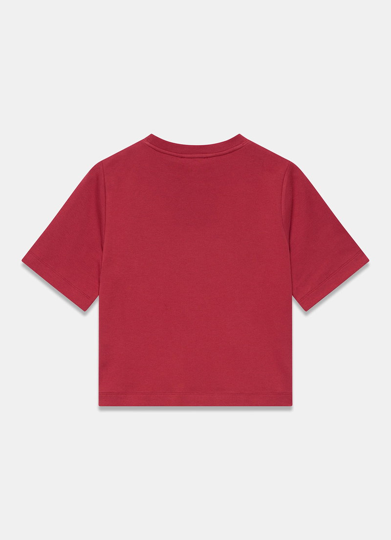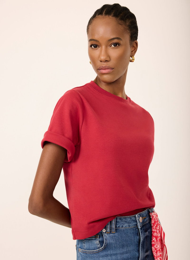 Red tone t-shirt featuring a crew neckline and short sleeves.