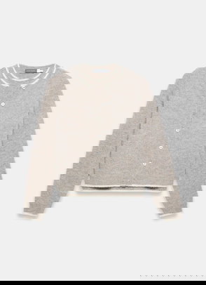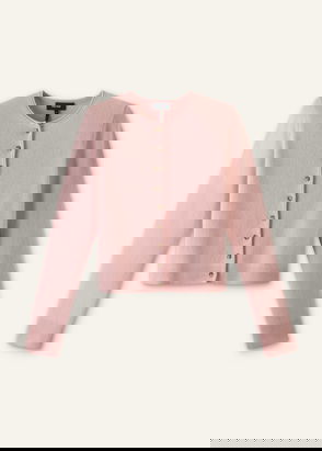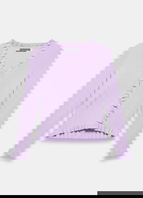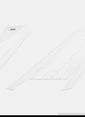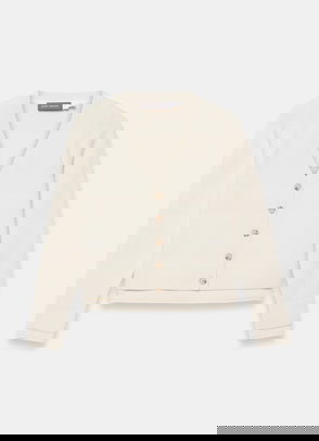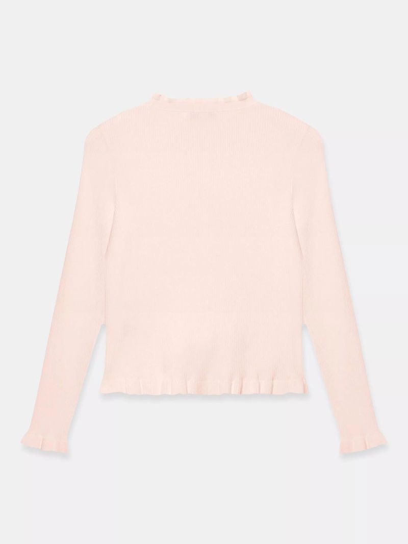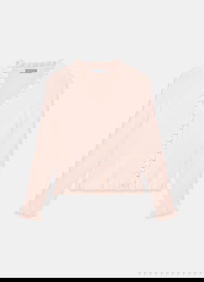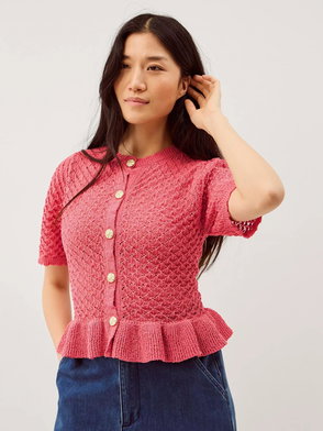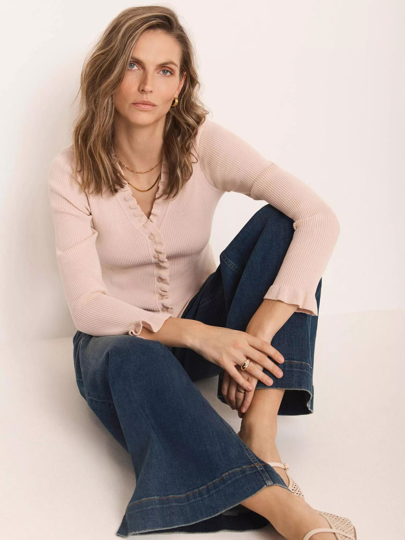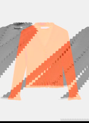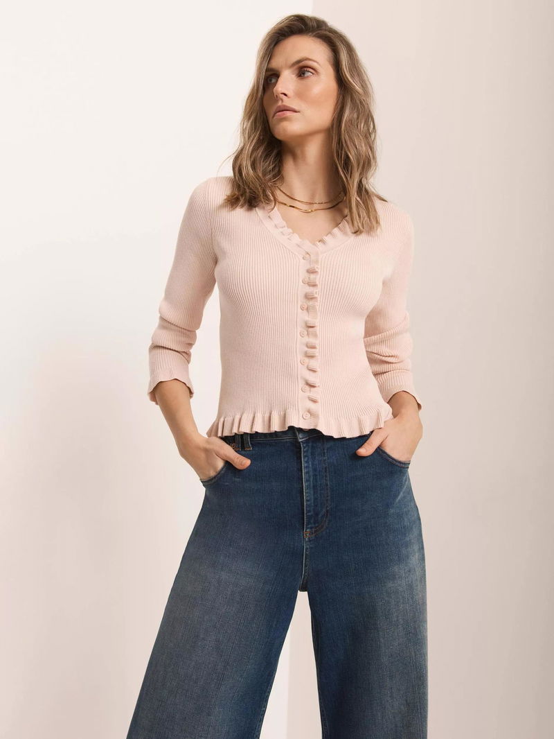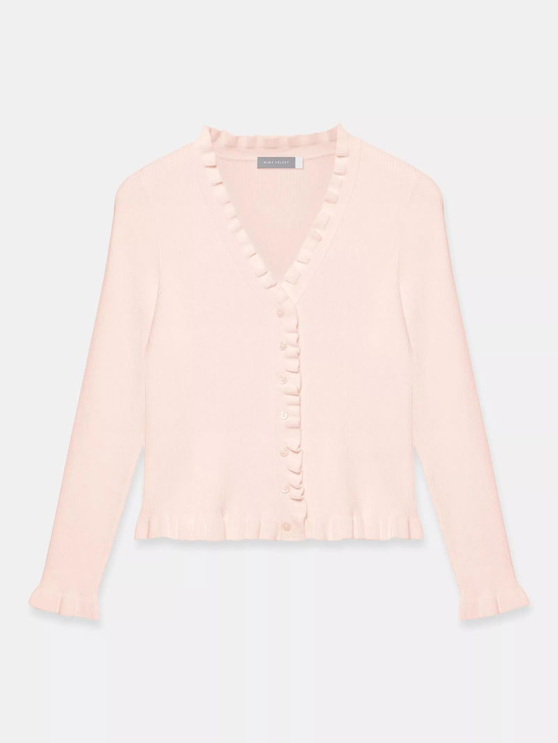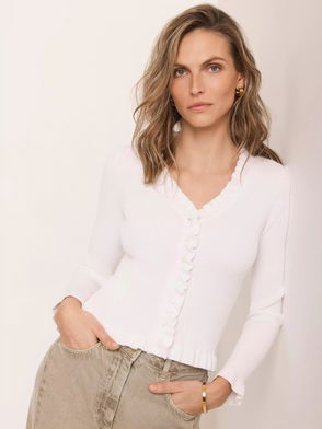 A cardigan featuring a V-neckline, long sleeves, ruffle trim with a button fastening through the front.