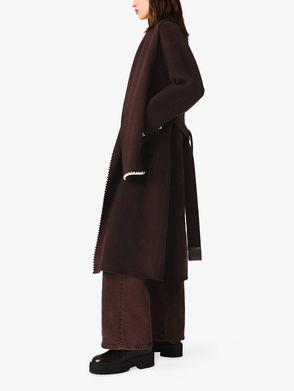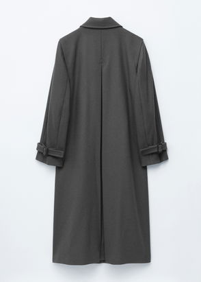 Light grey coat featuring long sleeves, welt pockets, detachable scarf detail with a button fastening through the front.