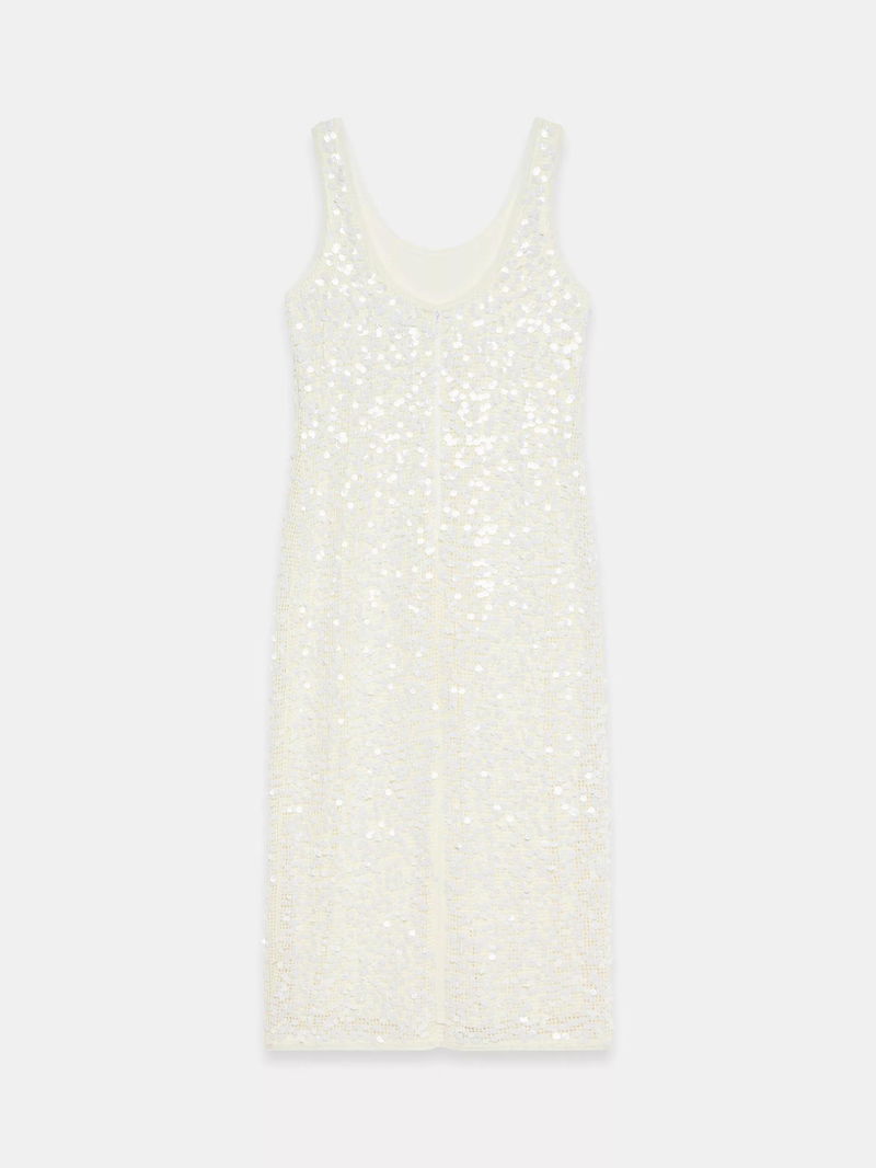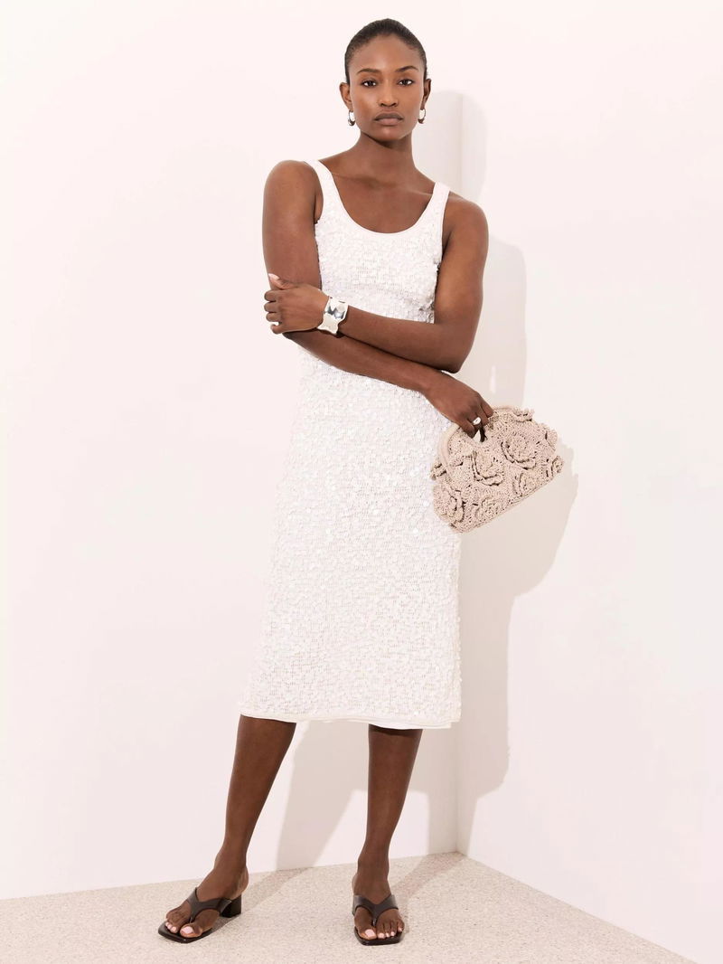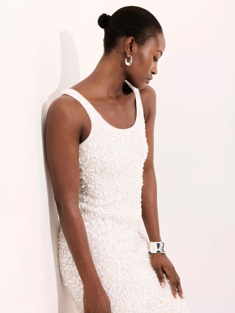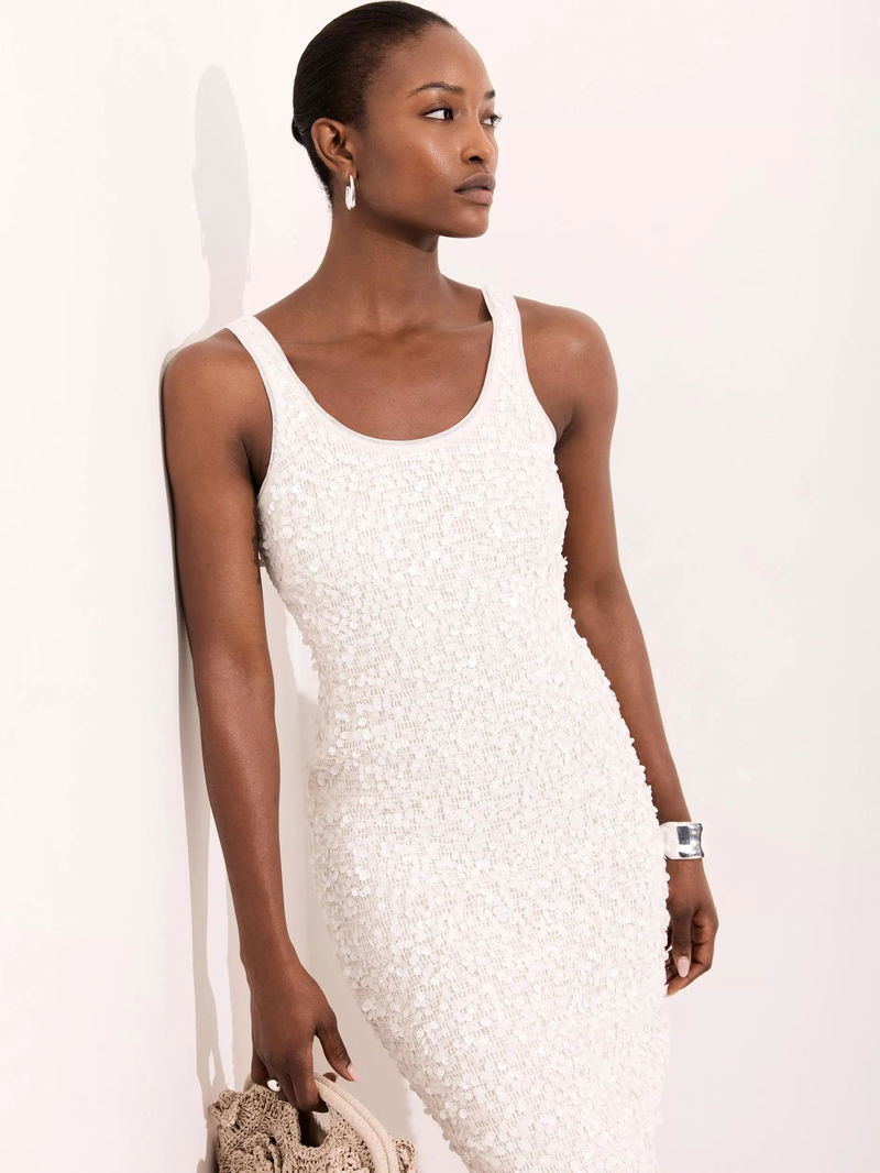 A sequin sleeveless dress featuring a scoop neckline, midi hemline and zip fastening through the back.