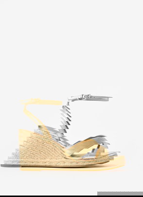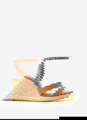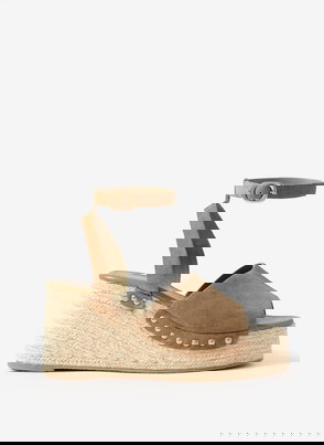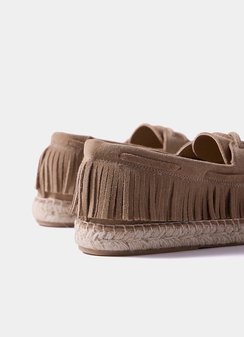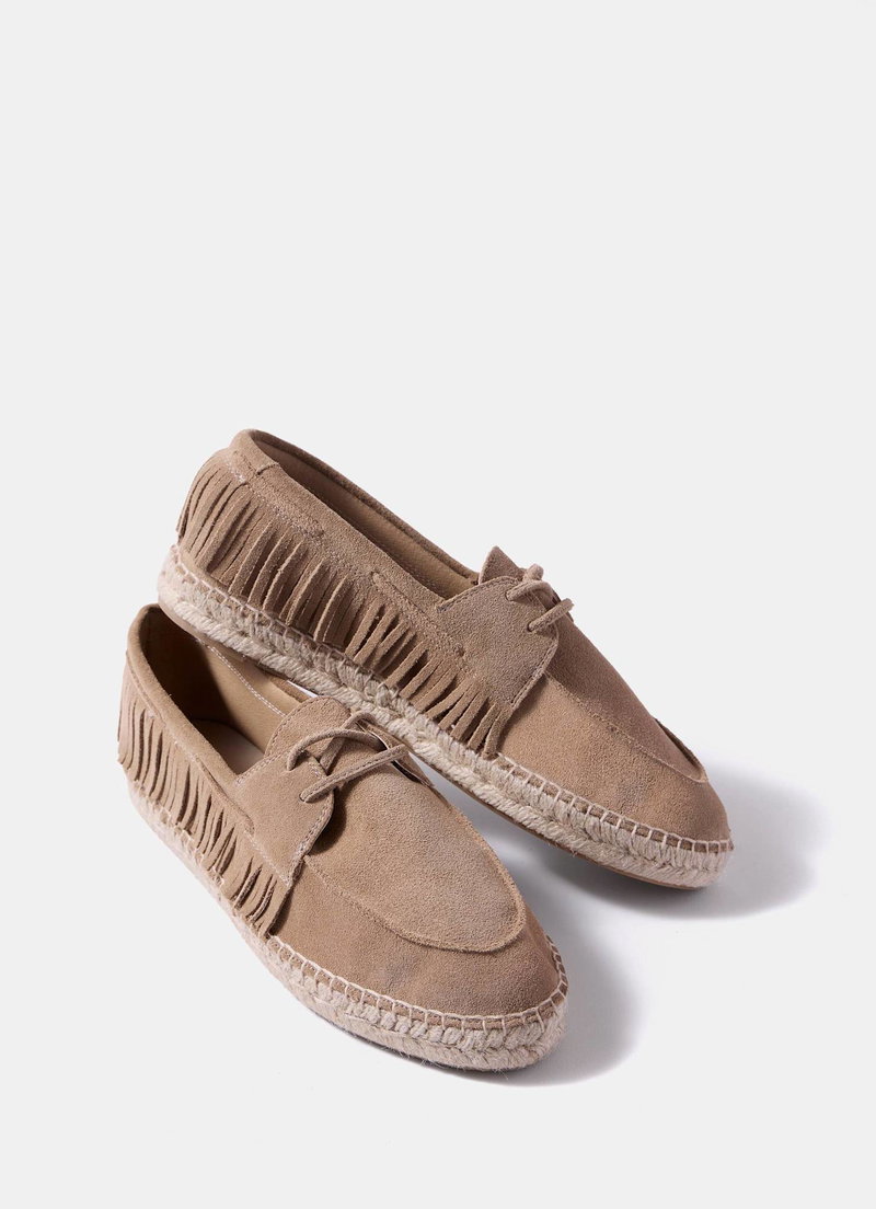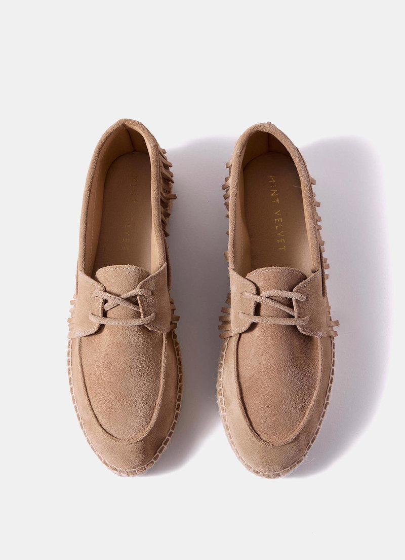 Neutral suede espadrille shoes featuring a round toe, flat sole, fringed trim and lace fastening.