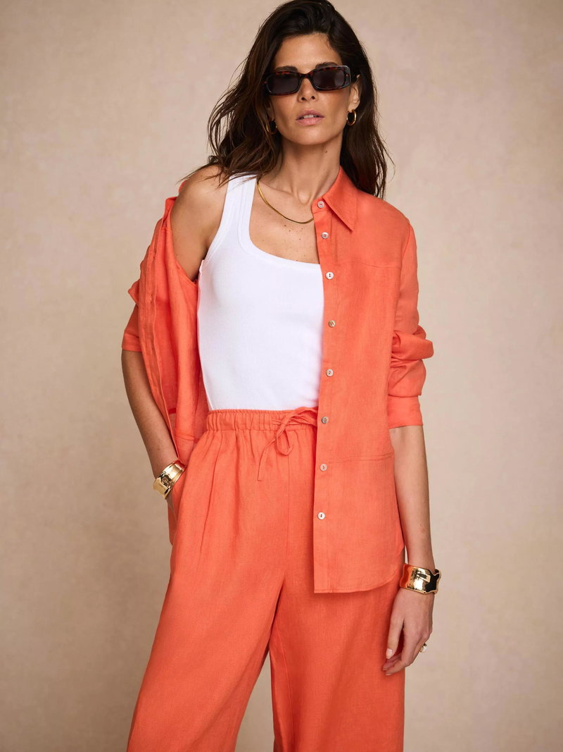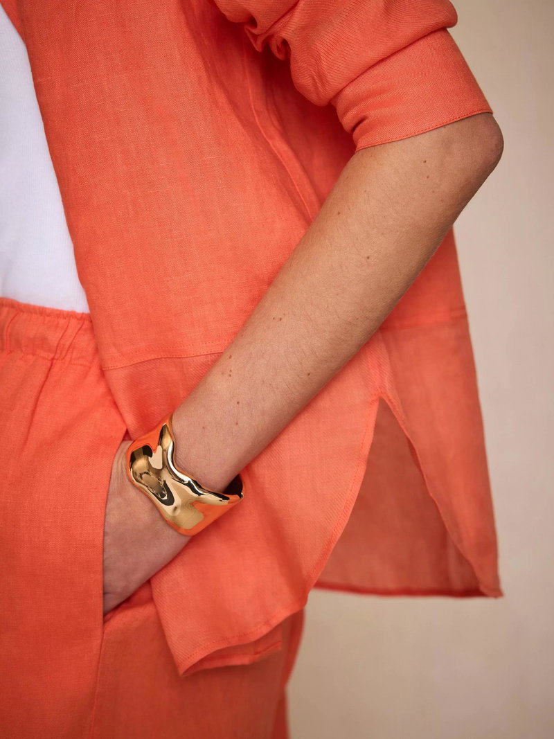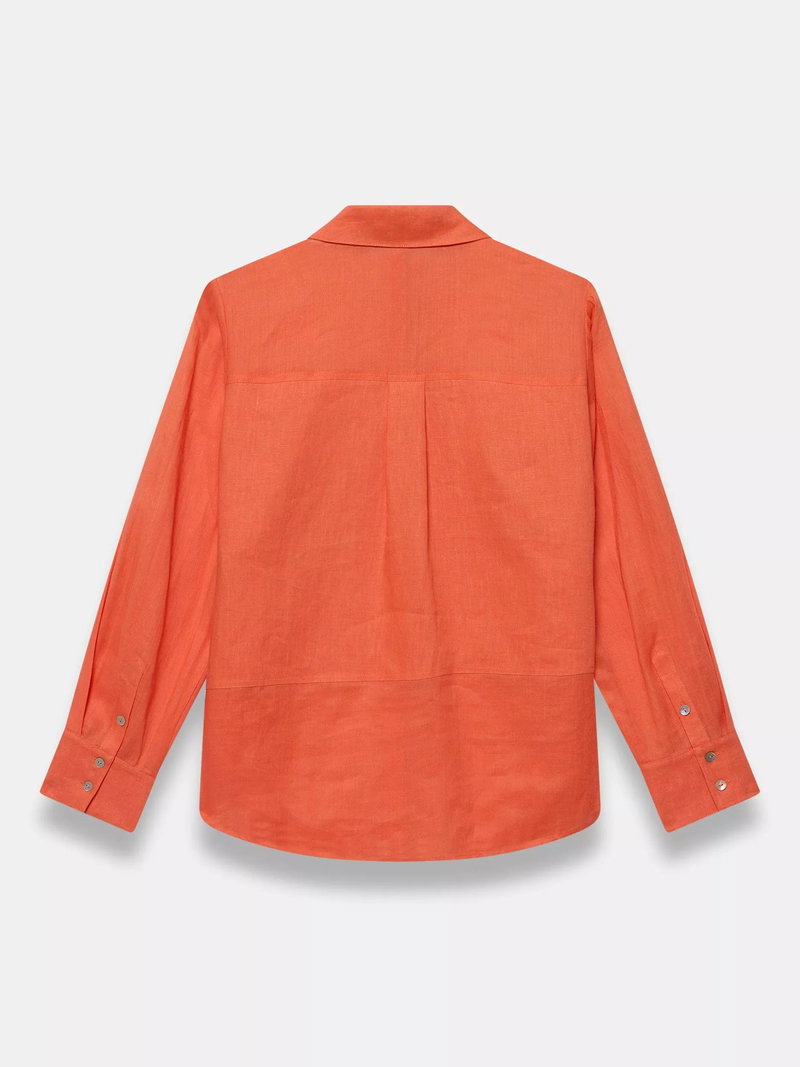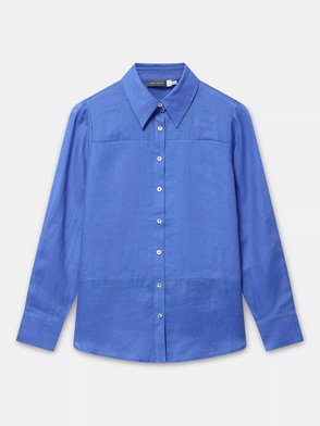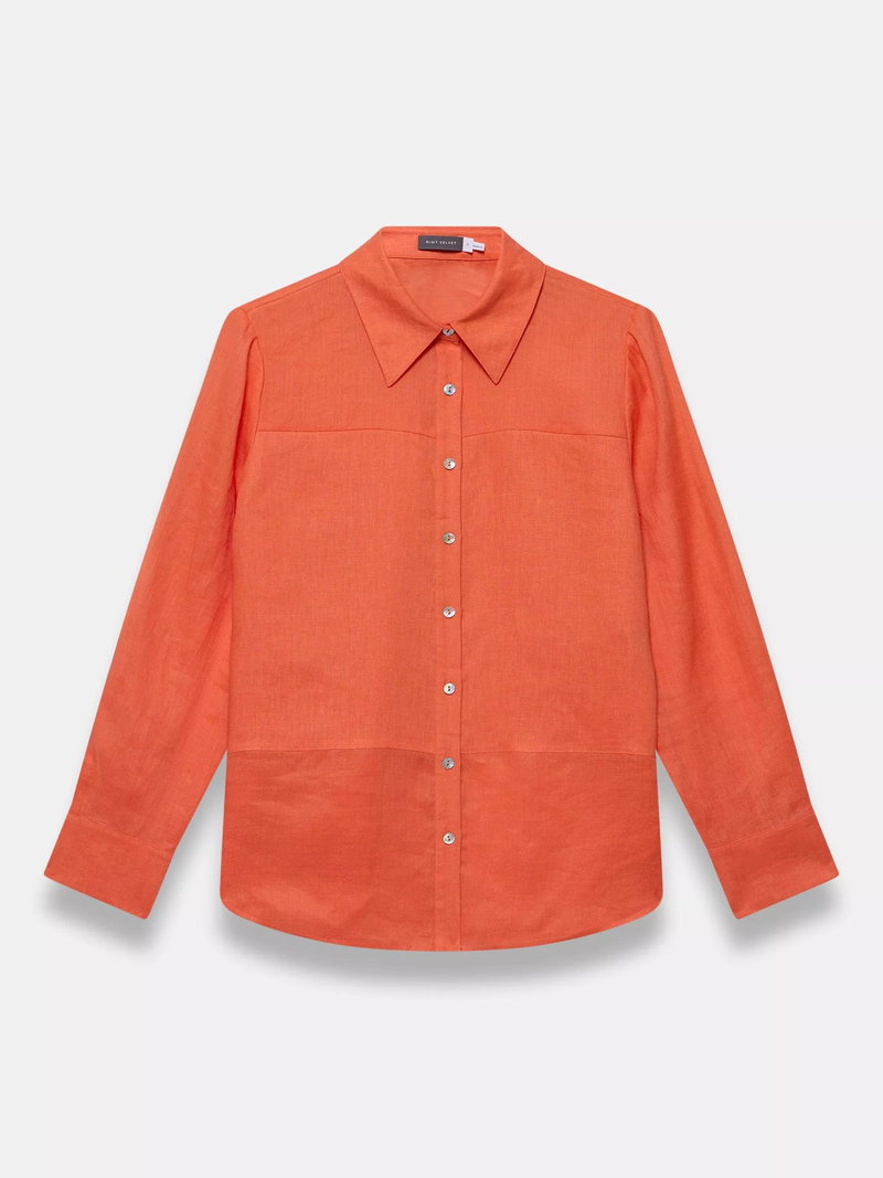 A pure linen shirt featuring a classic collar, sheer panelling, long sleeves, buttoned cuffs, curved hemline with a button fastening through the front.