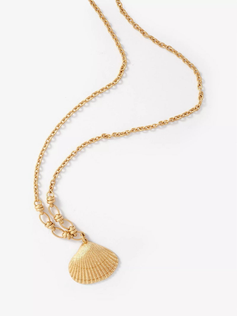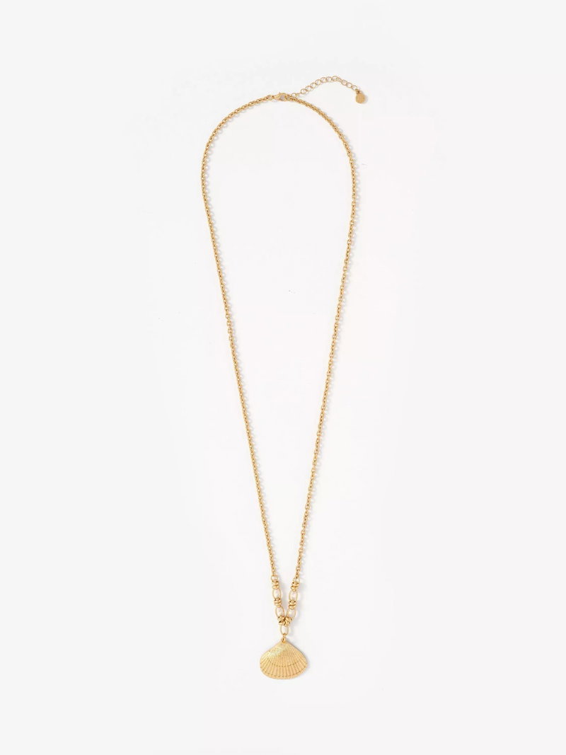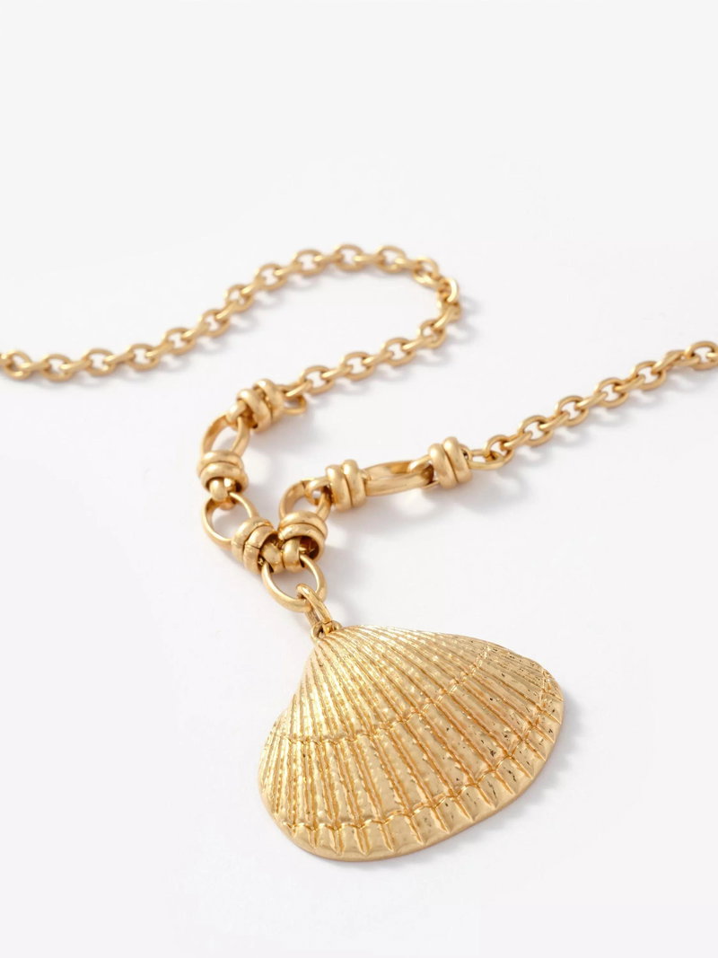 Crafted with a polished gold-tone finish, this elegant necklace features a detailed shell pendant. It is secured with a reliable lobster clasp and an adjustable chain for a bespoke, versatile fit.