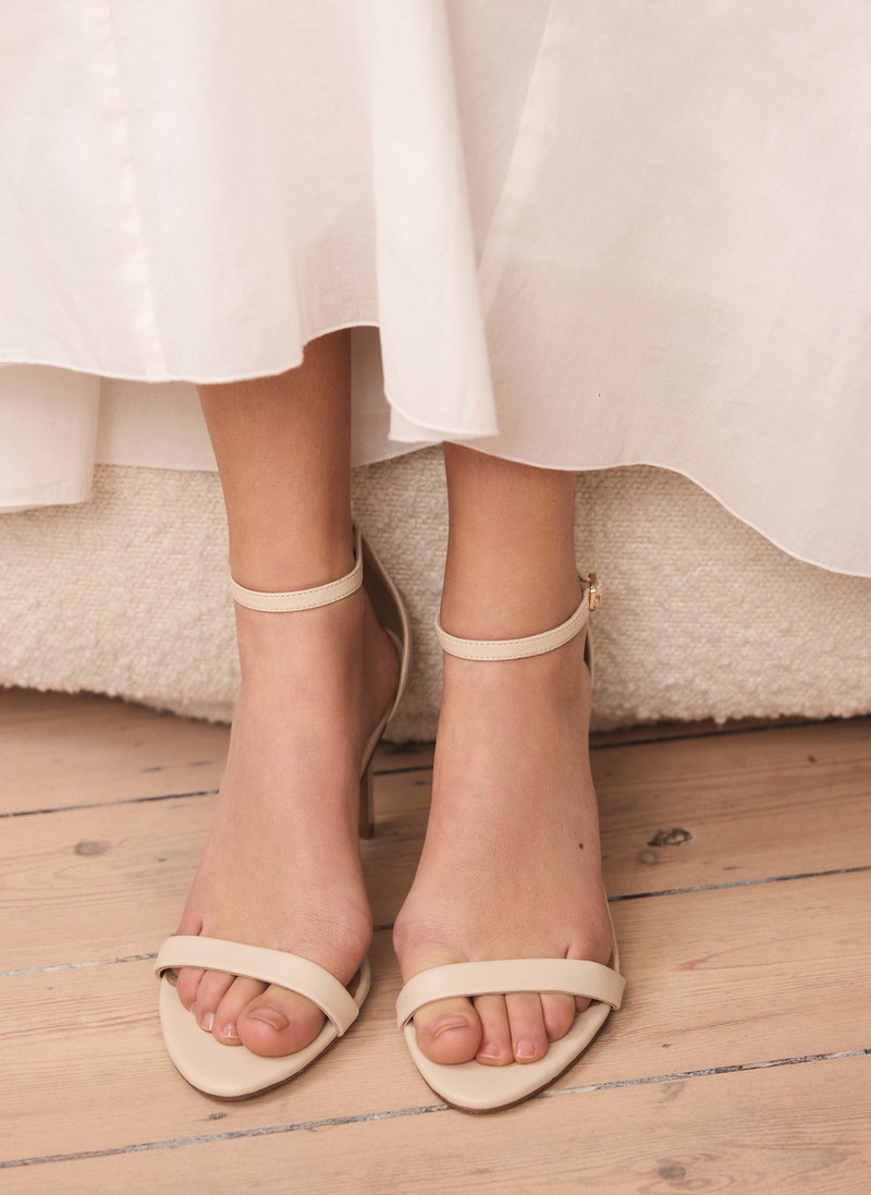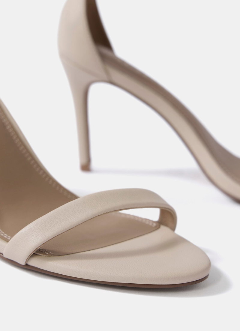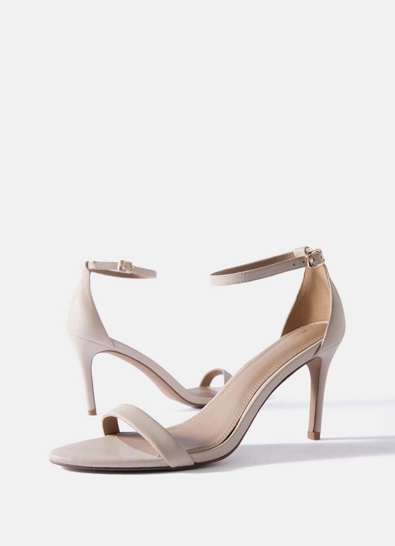 Cream tone minimalist strappy heels featuring a high heel ankle strap and buckle fastening through the side.