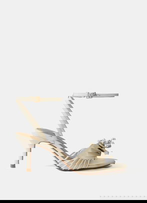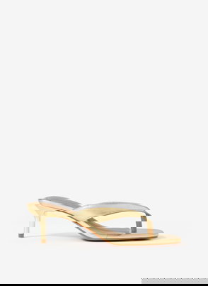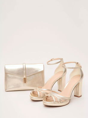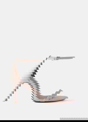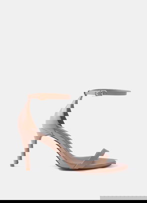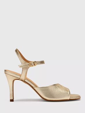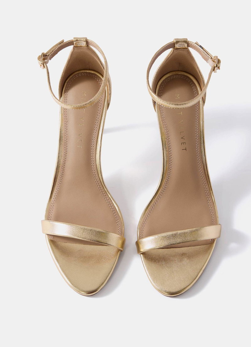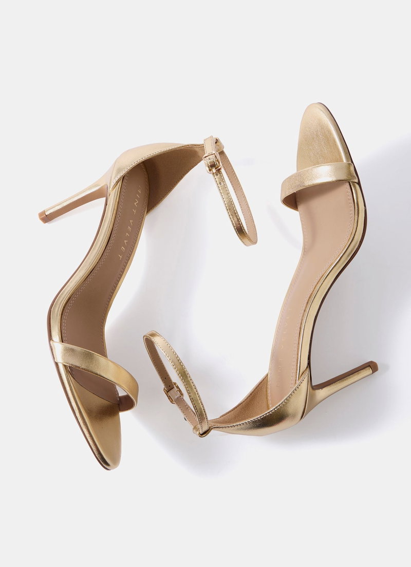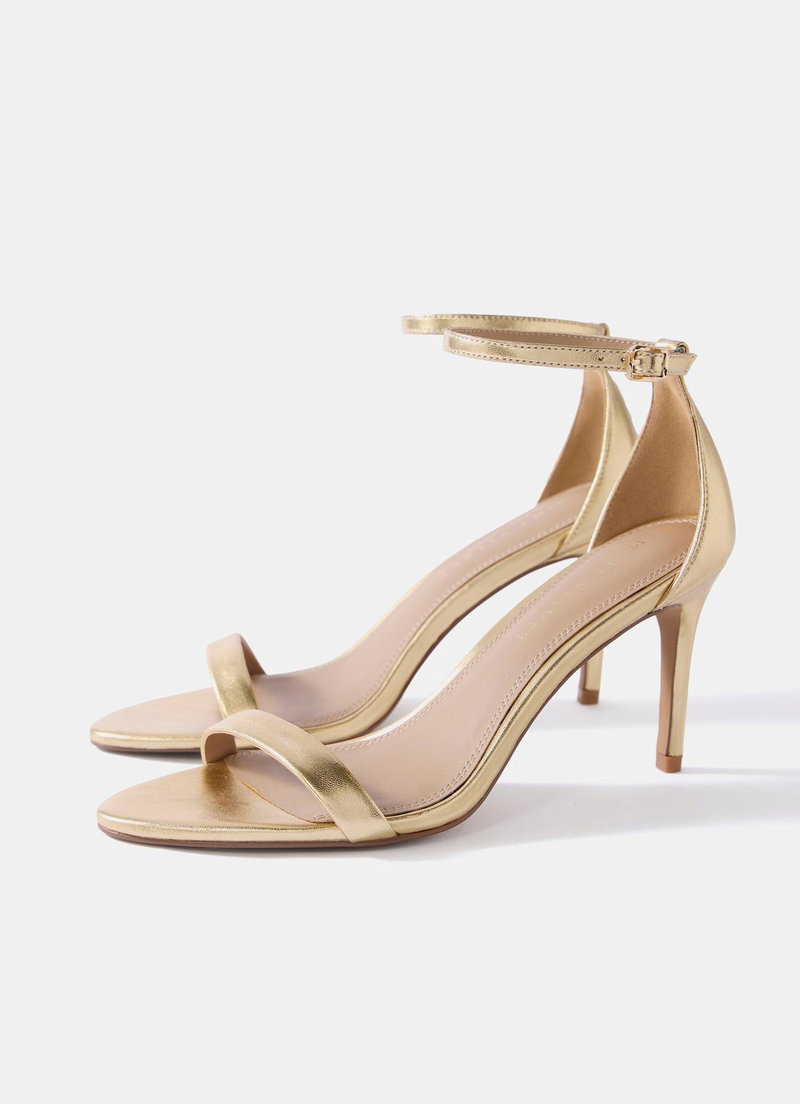 Gold tone minimalist strappy heels featuring a high heel ankle strap and buckle fastening through the side.