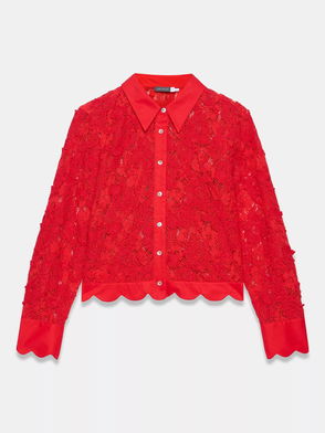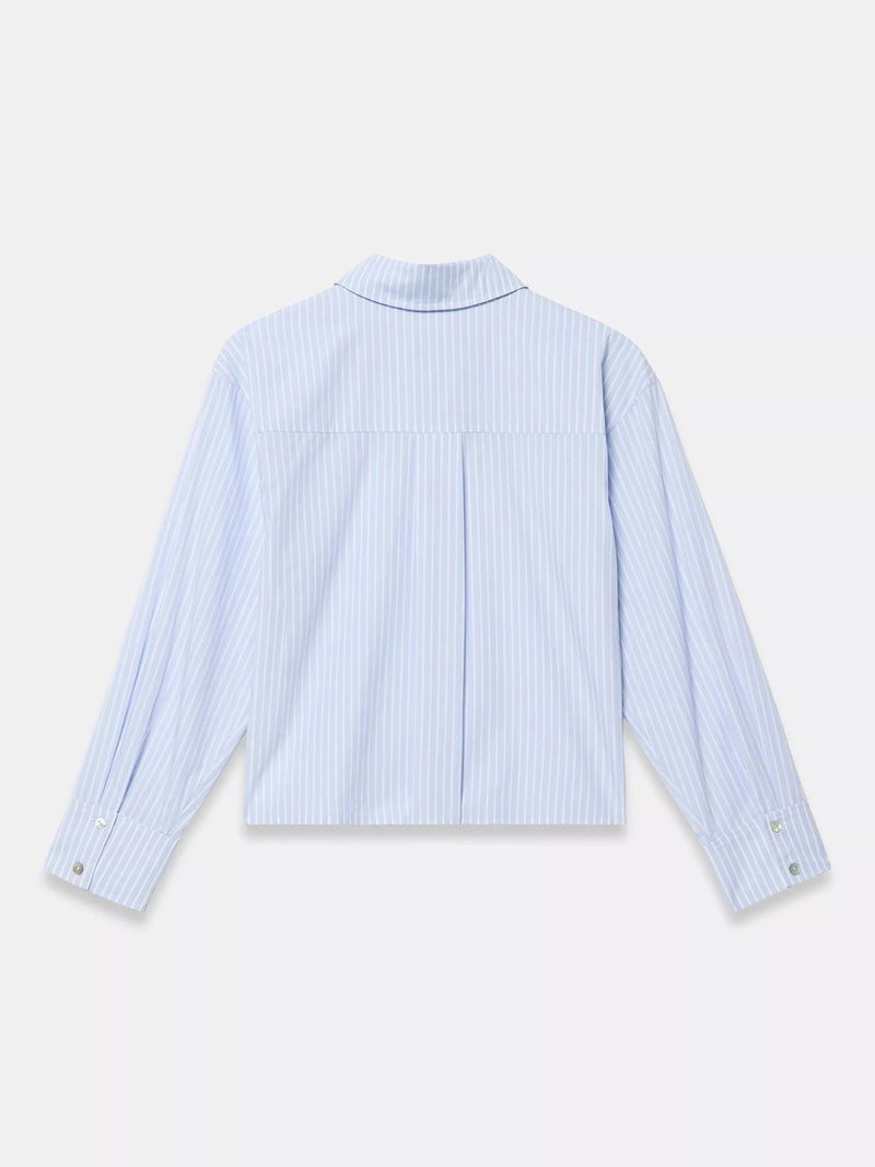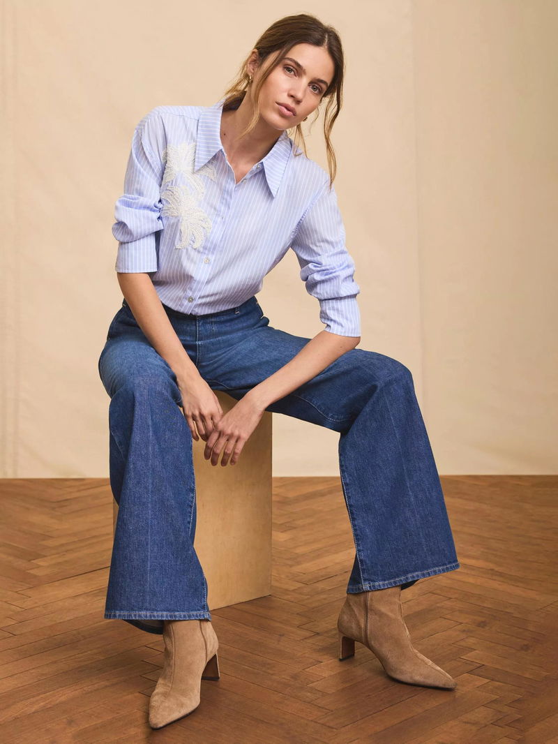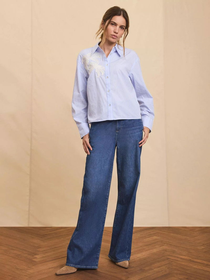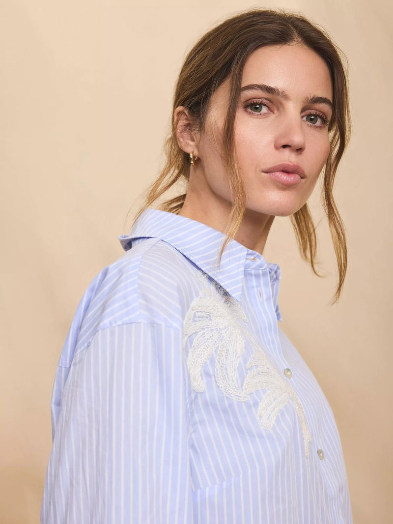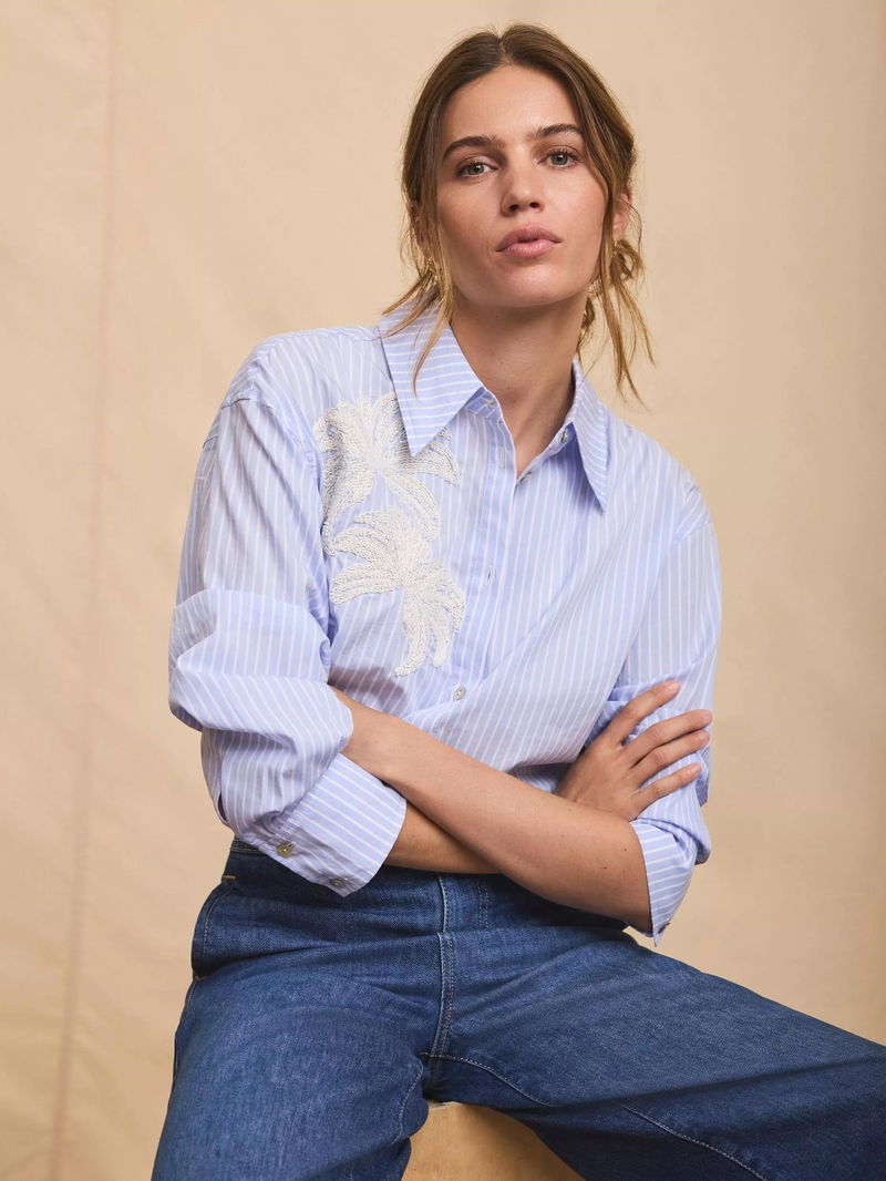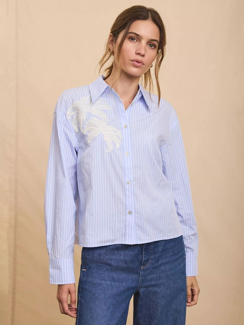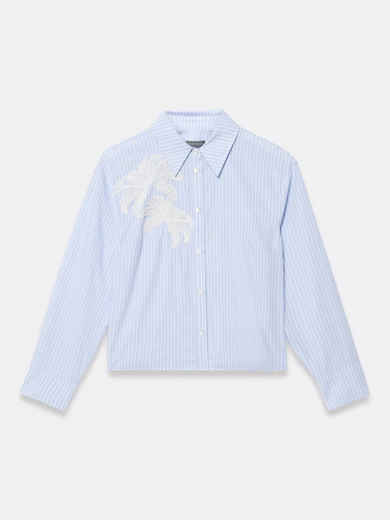 A striped shirt in a cropped silhouette featuring a classic collar, floral embroidered, long sleeves, buttoned cuffs with a button fastening through the front.