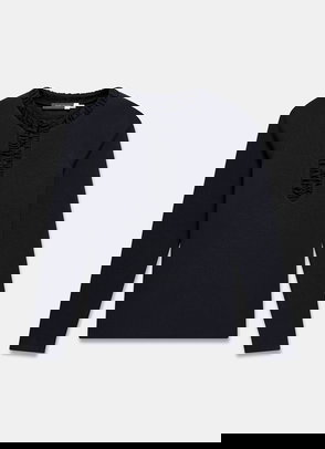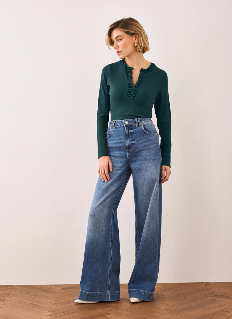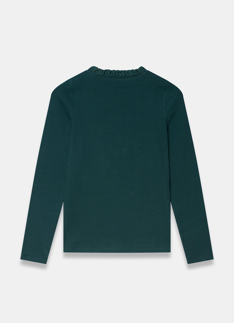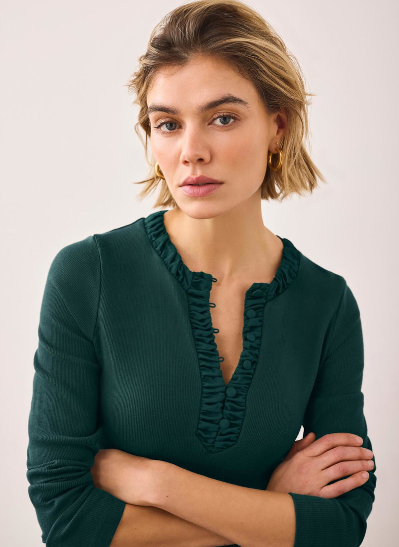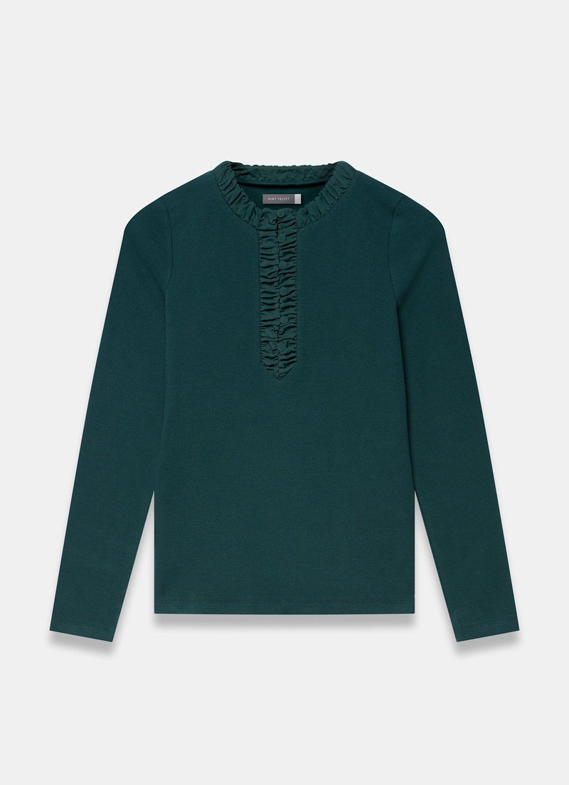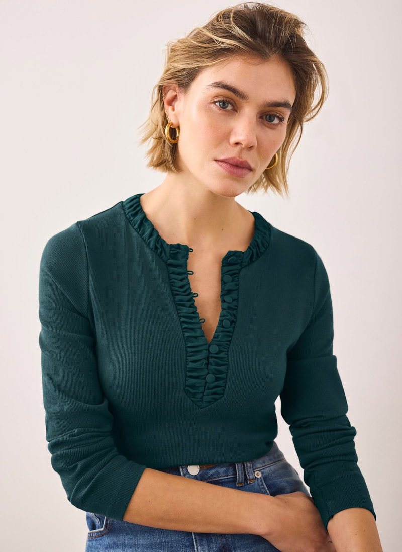 Teal top featuring a crew neckline, long sleeves, ruched trim with a button fastening through the top.